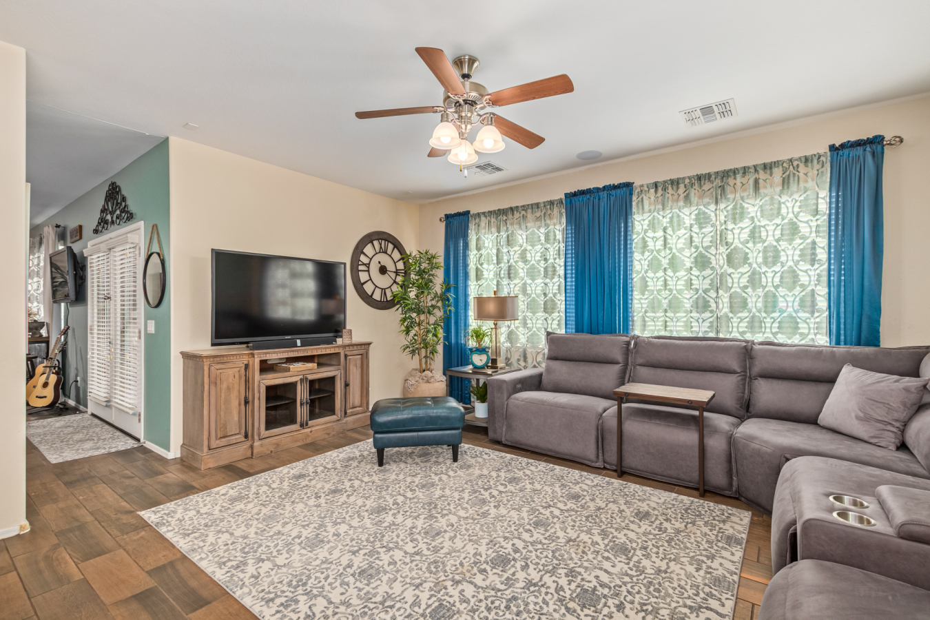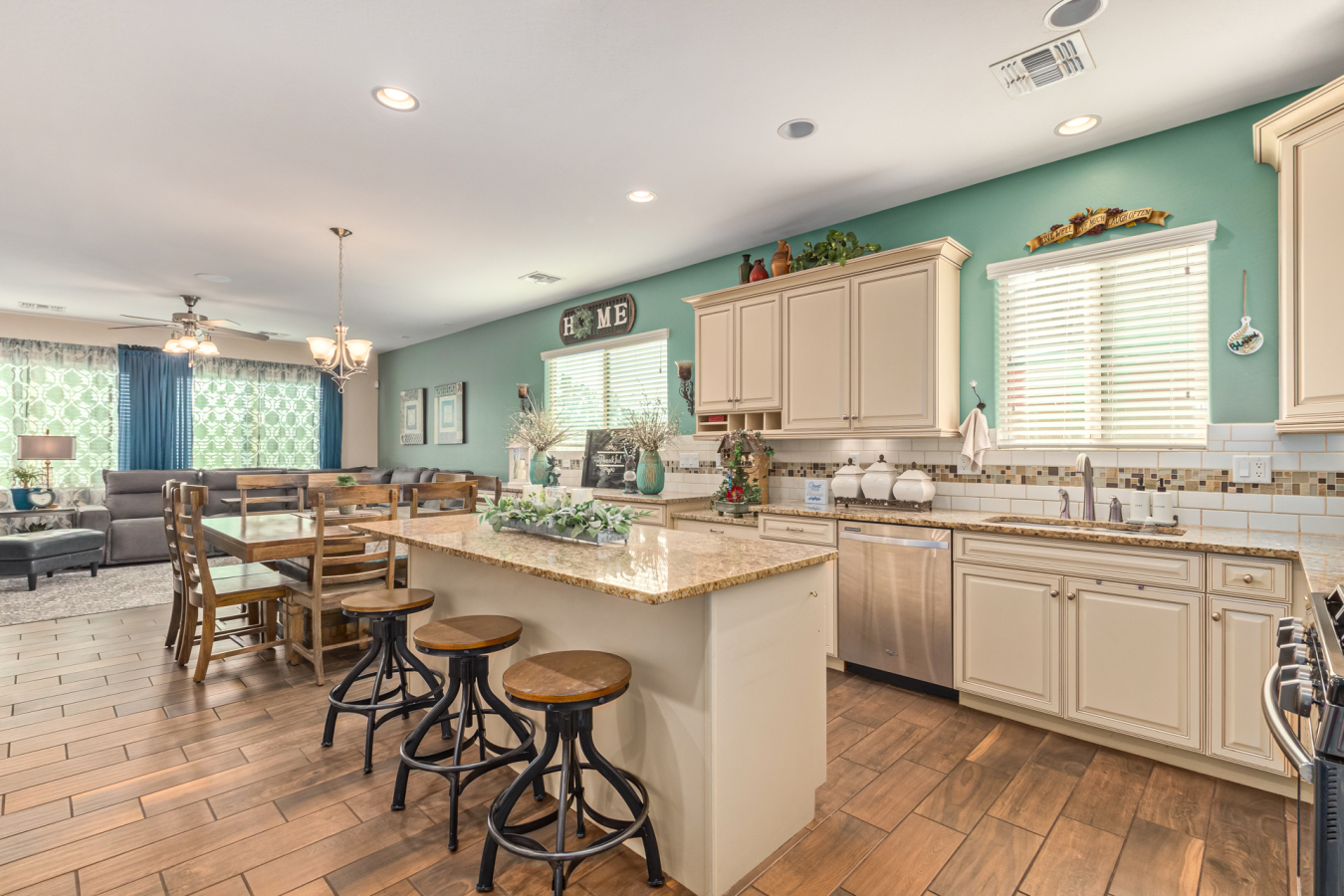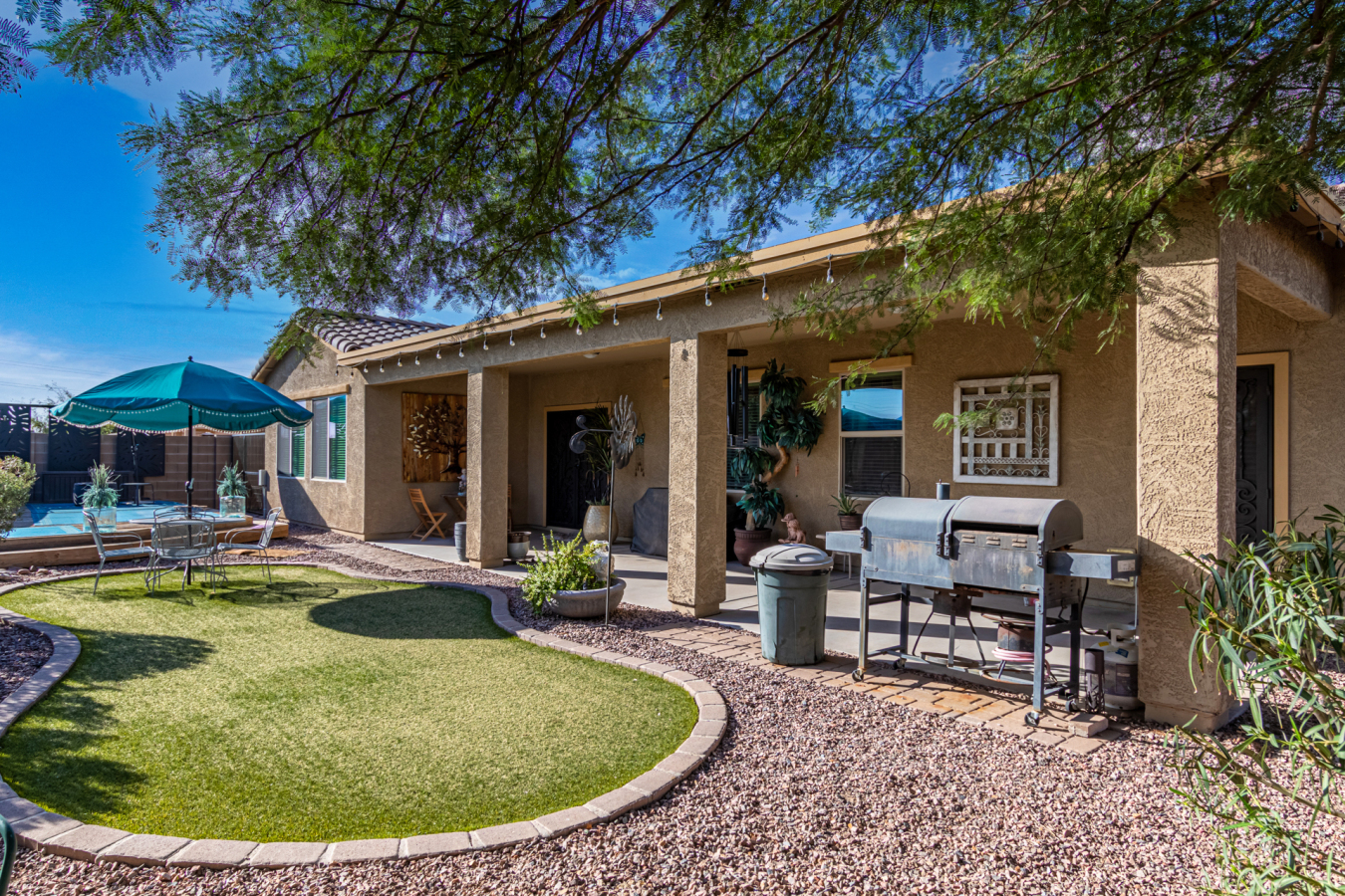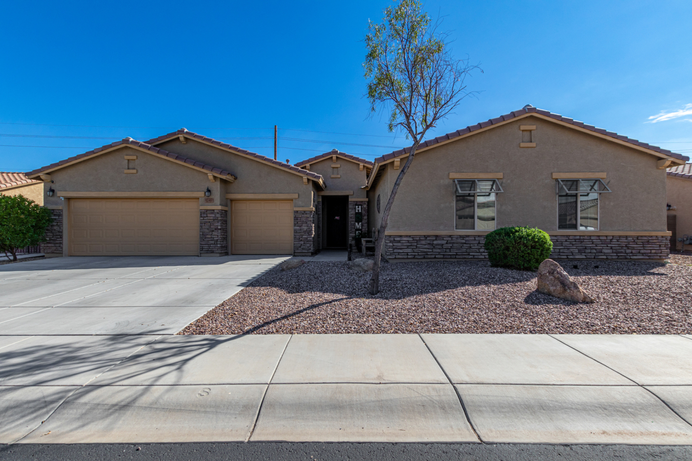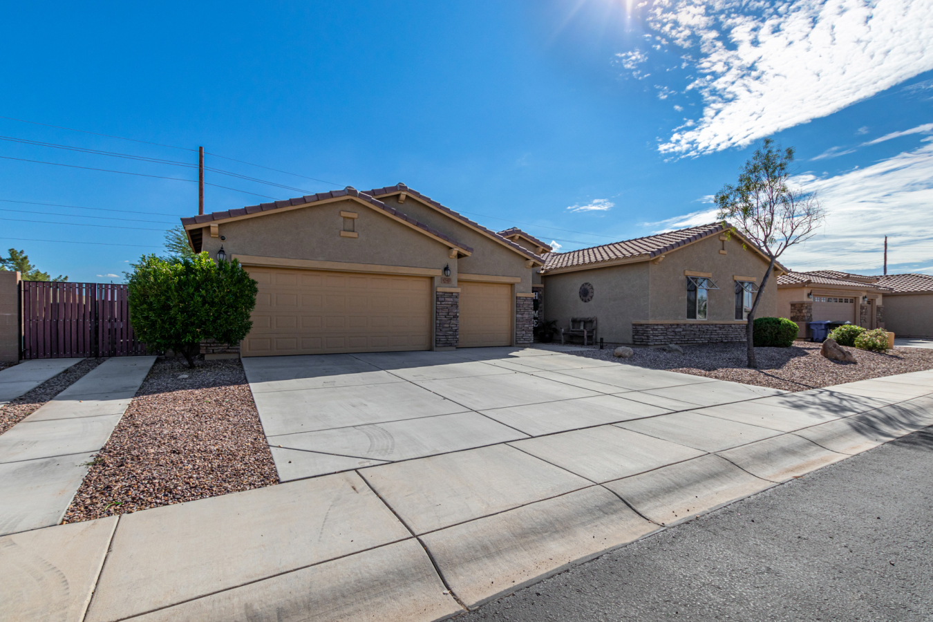 Beautiful single-level home in the gated Riverwalk Estates is the one you're looking for! Providing a 3-car garage, stone accents, & an RV gate. Take a look inside to find wood-look tile flooring, designer palette, & a living/dining room w/backyard access. Modern great room is ready to entertain guests. Fabulous kitchen boasts recessed lighting, a plethora of cabinets w/crown moulding, SS appliances, granite counters, subway tile backsplash, & an island w/a breakfast bar. Romantic main retreat features plush carpet, private outdoor access, an upscale ensuite w/dual sinks, make-up area, a separate shower & tub, and a walk-in closet. Enjoy the beauty of sunrise under the covered patio in the expansive backyard w/seating areas & a shade tree. Become a part of this peaceful neighborhood!