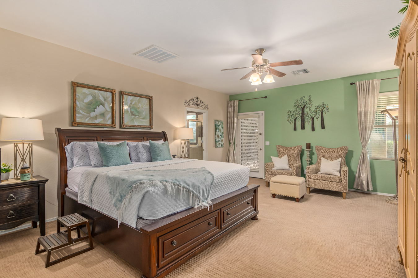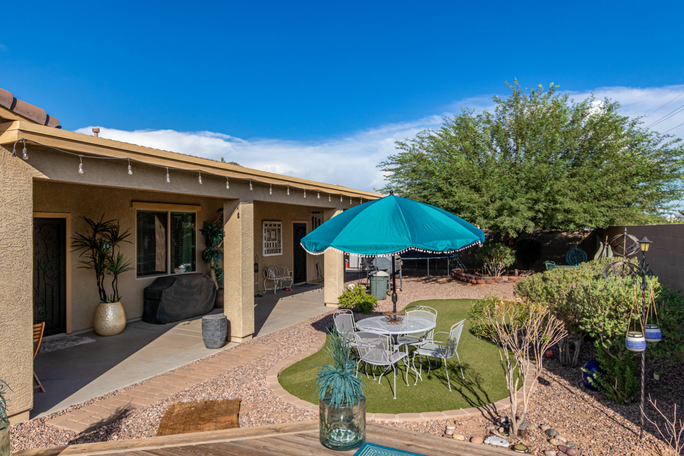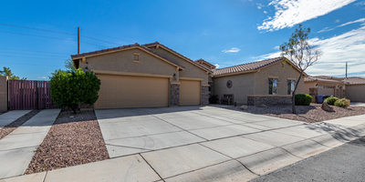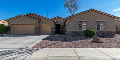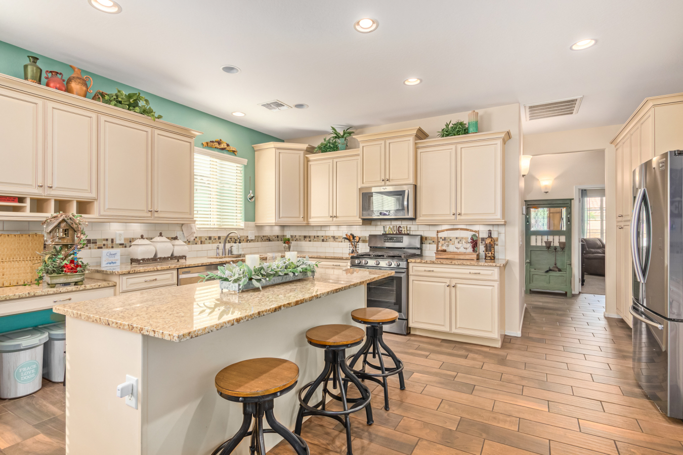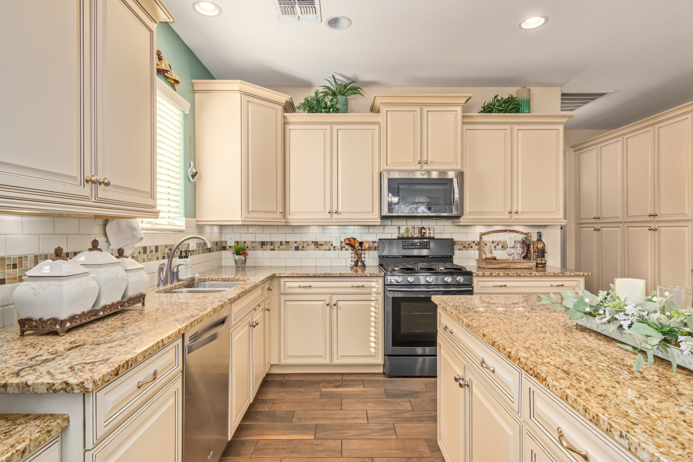 Beautiful single-level home in the gated Riverwalk Estates is the one you're looking for! Providing a 3-car garage, stone accents, & an RV gate. Take a look inside to find wood-look tile flooring, designer palette, & a living/dining room w/backyard access. Modern great room is ready to entertain guests. Fabulous kitchen boasts recessed lighting, a plethora of cabinets w/crown moulding, SS appliances, granite counters, subway tile backsplash, & an island w/a breakfast bar. Romantic main retreat features plush carpet, private outdoor access, an upscale ensuite w/dual sinks, make-up area, a separate shower & tub, and a walk-in closet. Enjoy the beauty of sunrise under the covered patio in the expansive backyard w/seating areas & a shade tree. Become a part of this peaceful neighborhood!