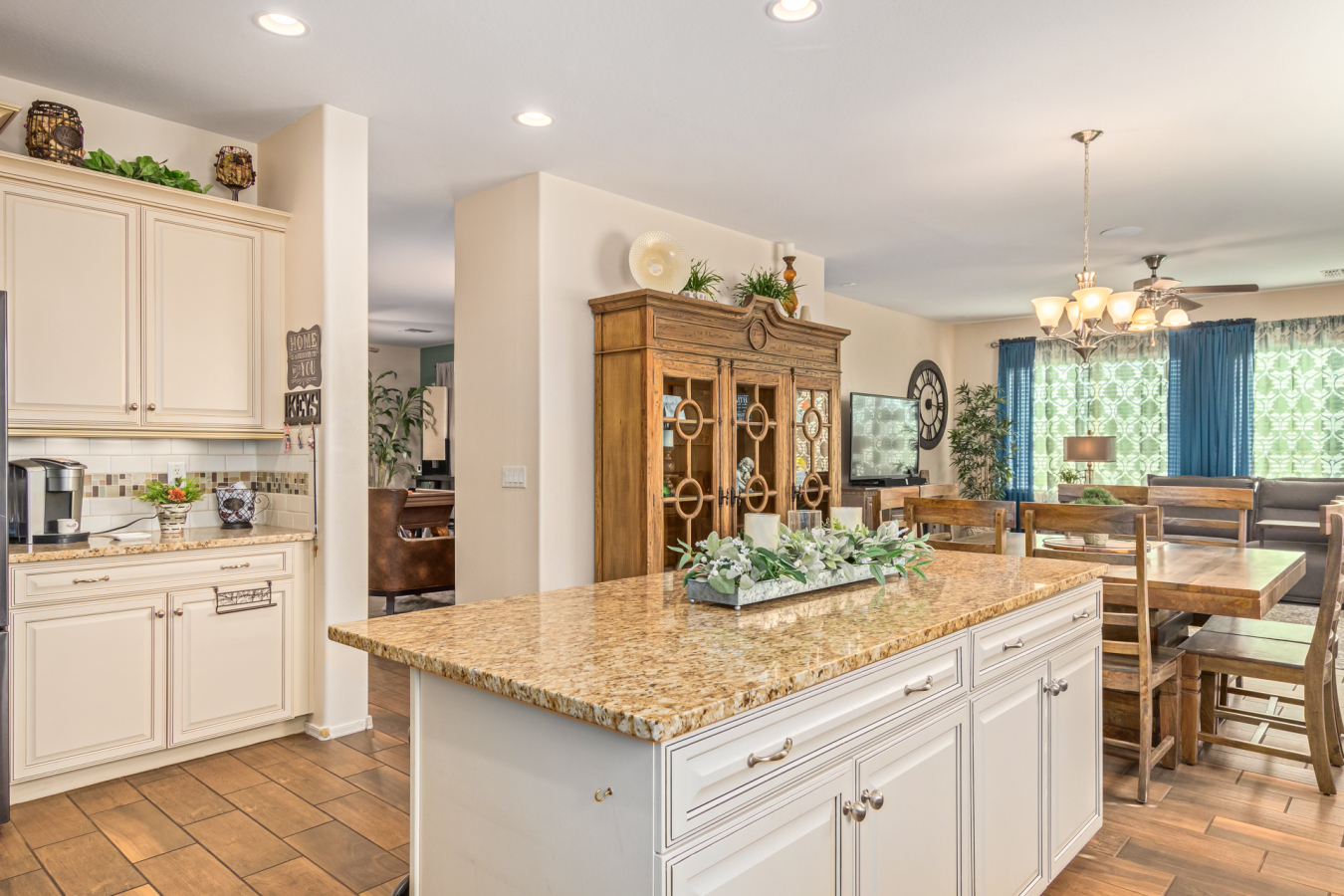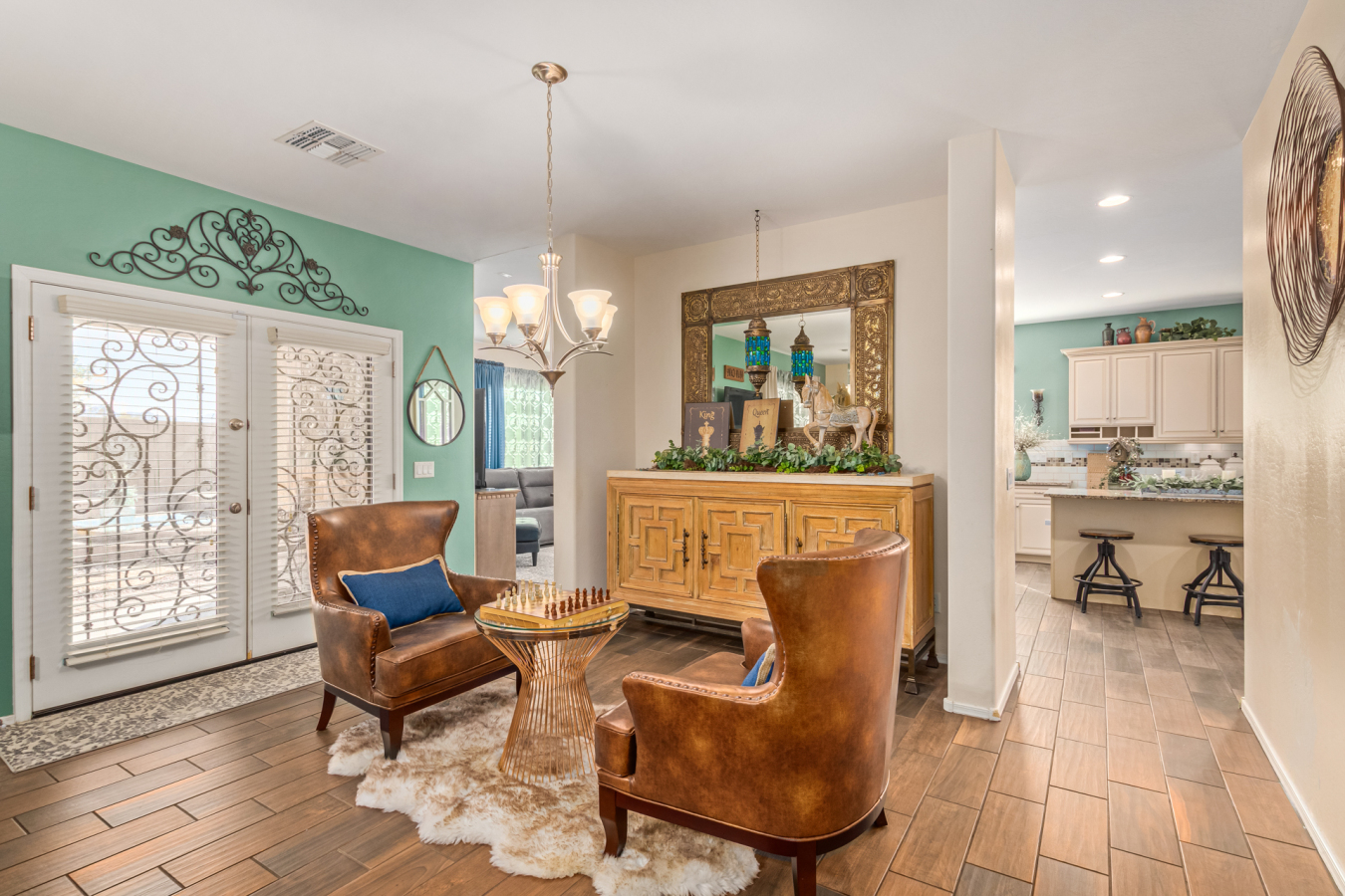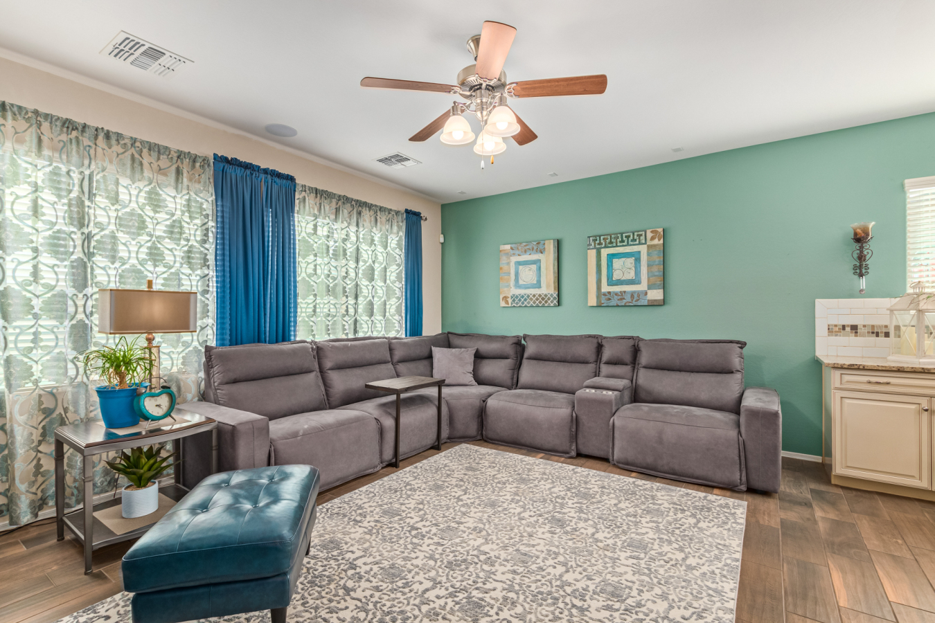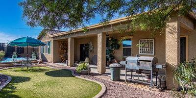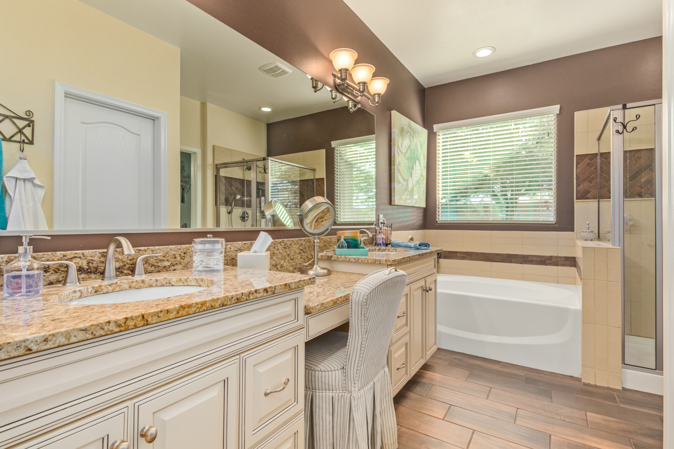 Beautiful single-level home in the gated Riverwalk Estates is the one you're looking for! Providing a 3-car garage, stone accents, & an RV gate. Take a look inside to find wood-look tile flooring, designer palette, & a living/dining room w/backyard access. Modern great room is ready to entertain guests. Fabulous kitchen boasts recessed lighting, a plethora of cabinets w/crown moulding, SS appliances, granite counters, subway tile backsplash, & an island w/a breakfast bar. Romantic main retreat features plush carpet, private outdoor access, an upscale ensuite w/dual sinks, make-up area, a separate shower & tub, and a walk-in closet. Enjoy the beauty of sunrise under the covered patio in the expansive backyard w/seating areas & a shade tree. Become a part of this peaceful neighborhood!