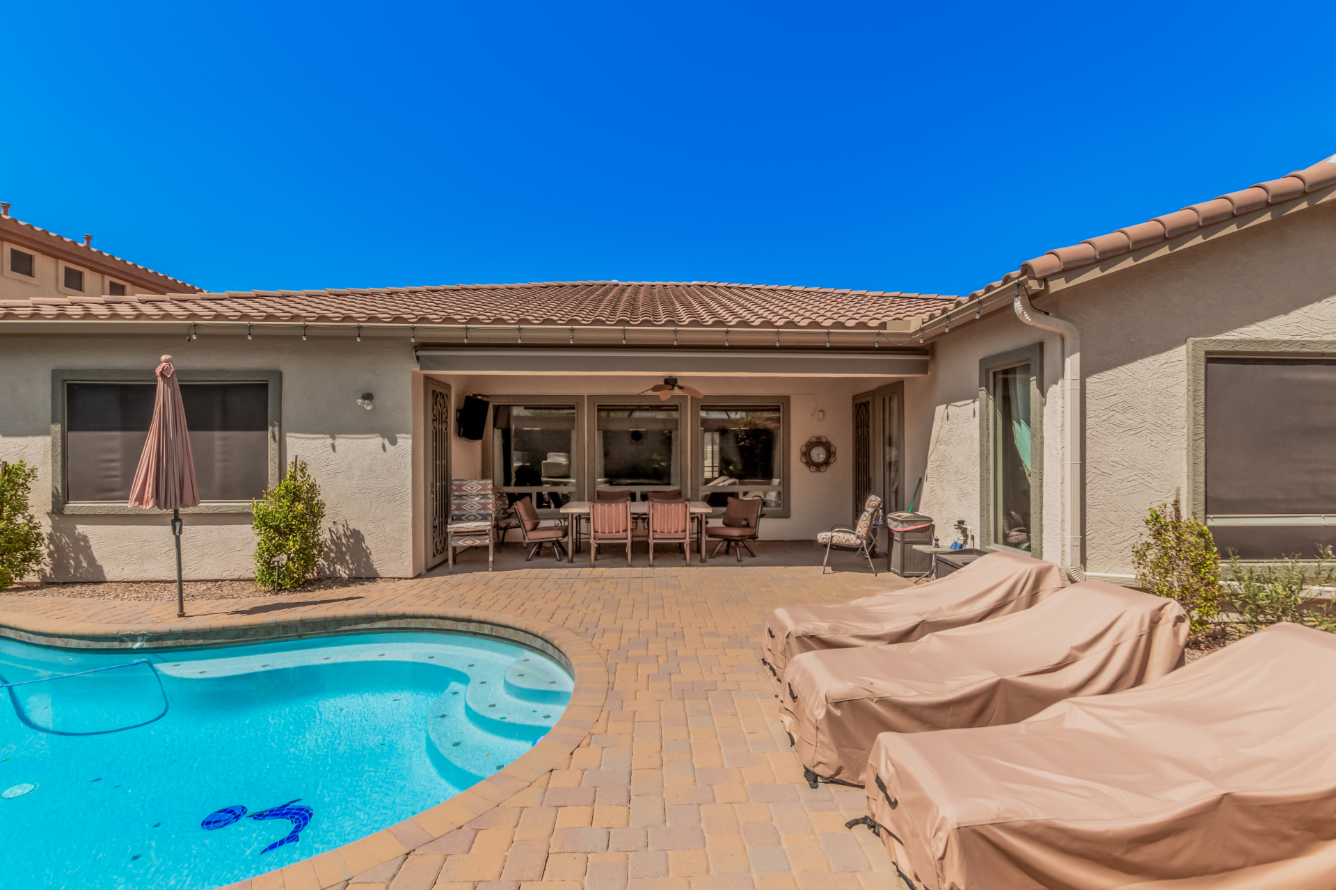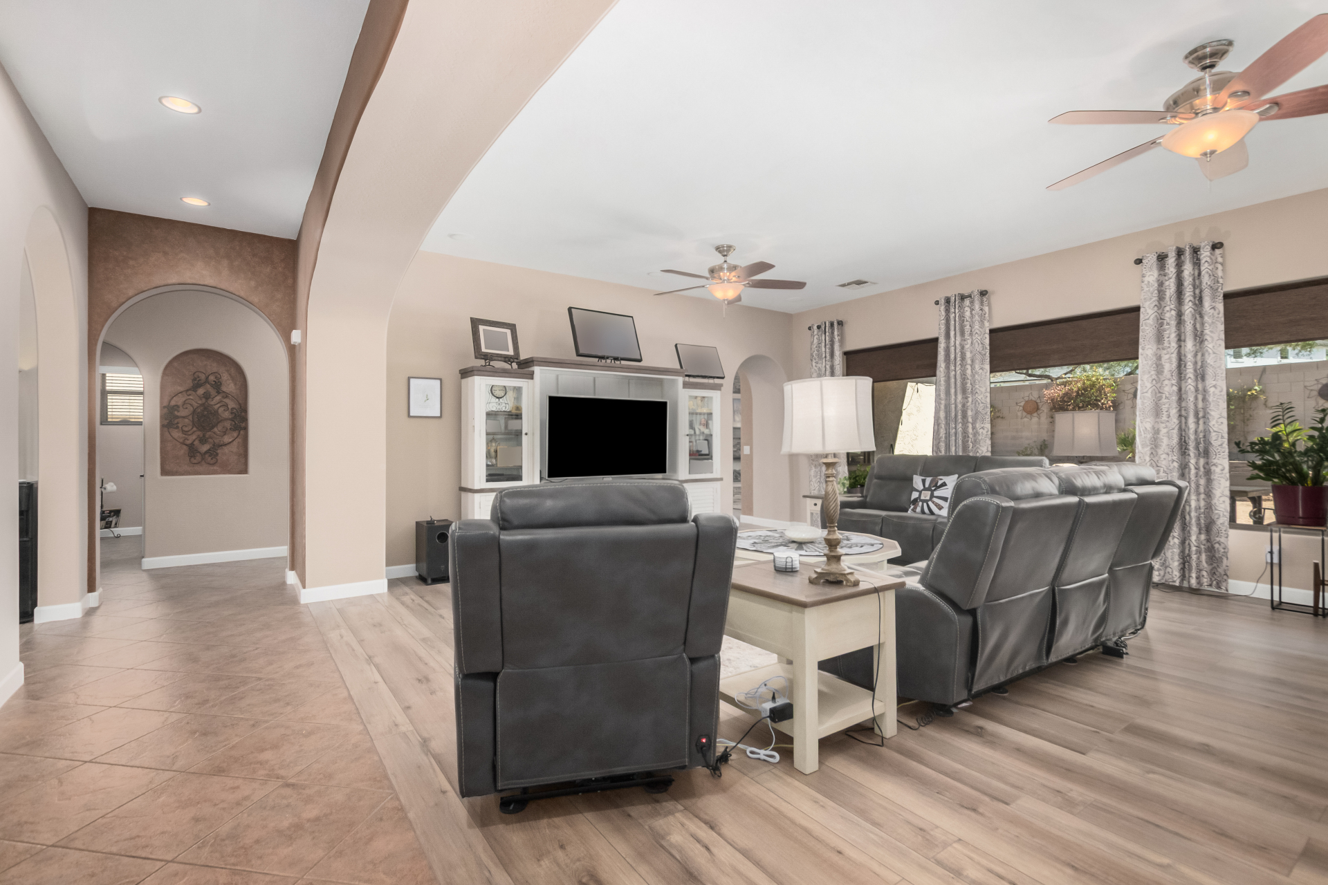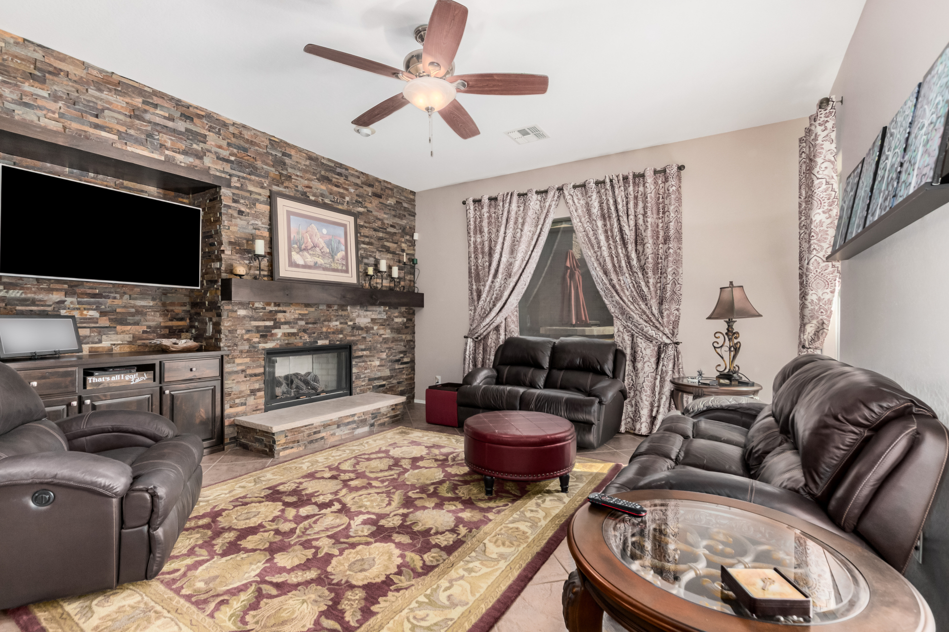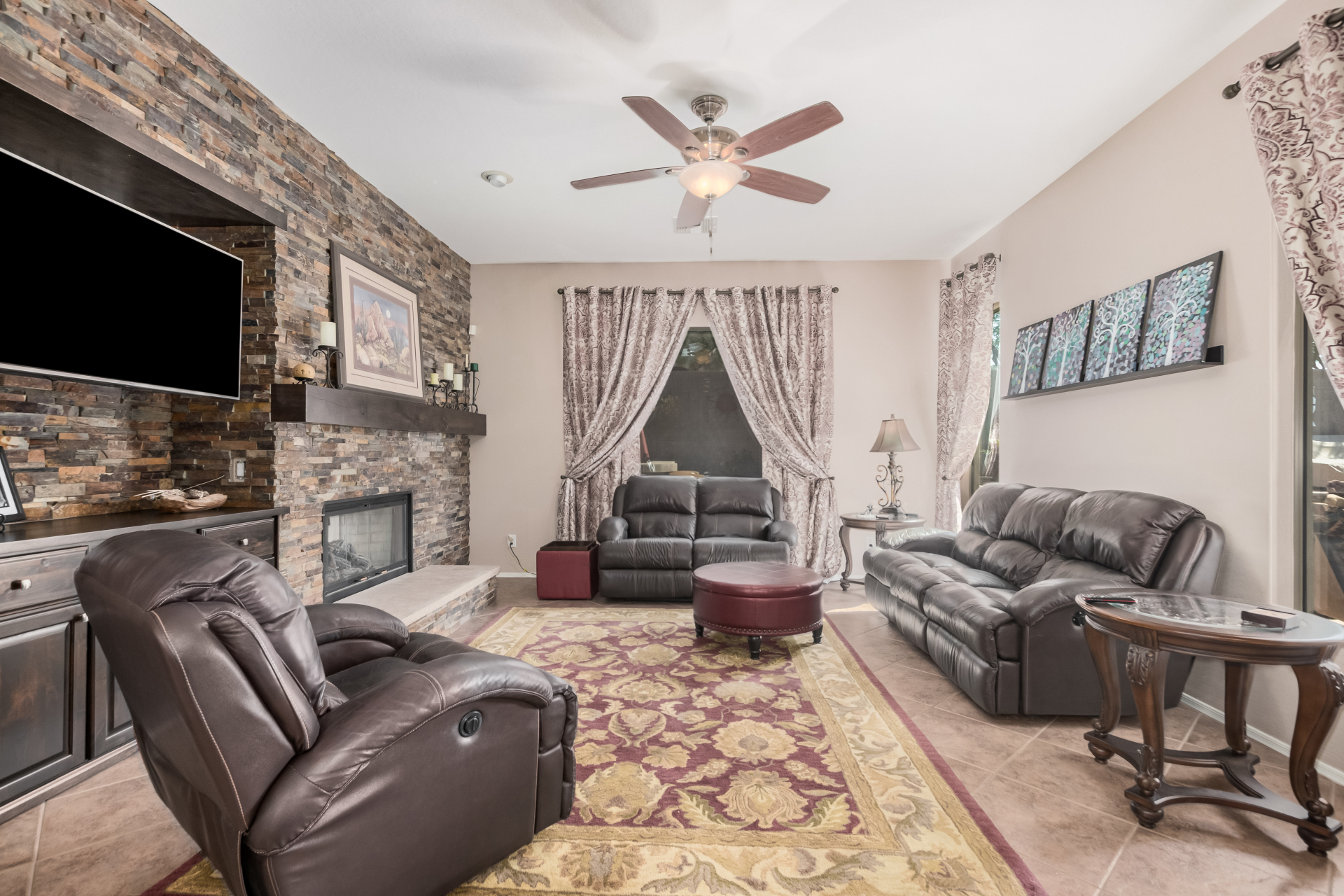 The search is finally over! Fall in love with this stunning residence featuring a 3-car garage, an inviting courtyard with stylish pavers, and pristine artificial turf. The serene living room welcomes you with high ceilings, a soothing palette, and attractive wood-look flooring. Create lasting memories in the family room, complete with a stone-clad fireplace for cozy evenings. The impeccable kitchen boasts granite counters, pendant/recessed lighting, abundant wood cabinetry with crown moulding, stainless steel appliances, and an island with a breakfast bar. The tranquil primary bedroom showcases convenient backyard access, an ensuite with double sinks, and a walk-in closet. You'll also find a den ideal for an office or a quiet study.