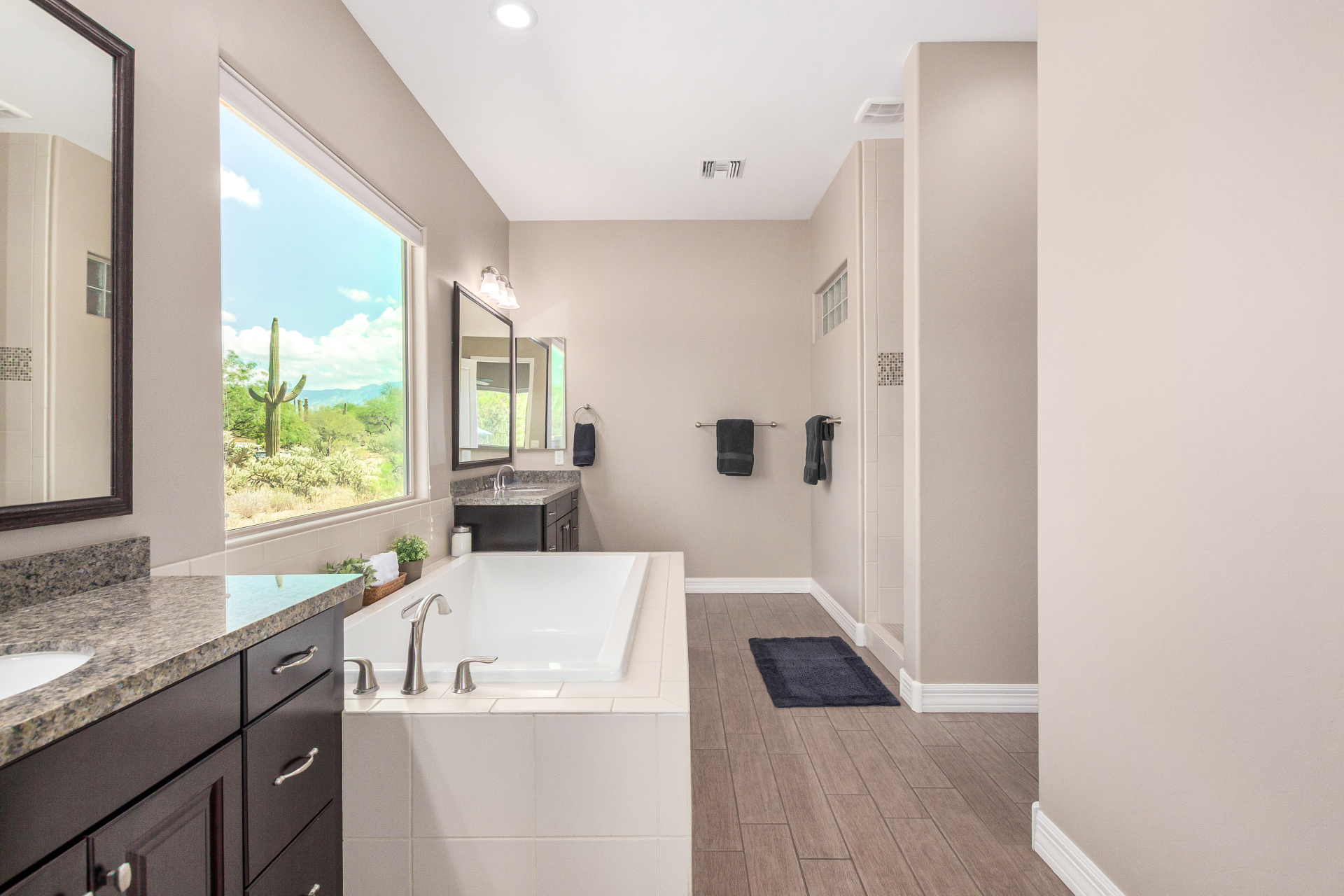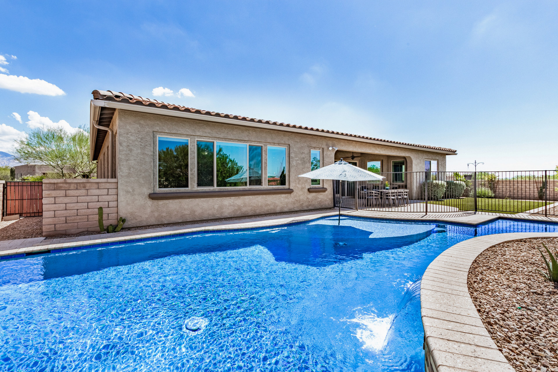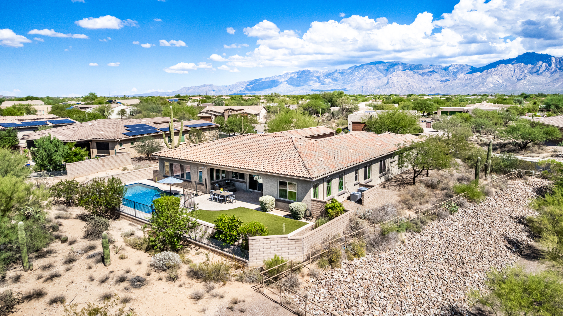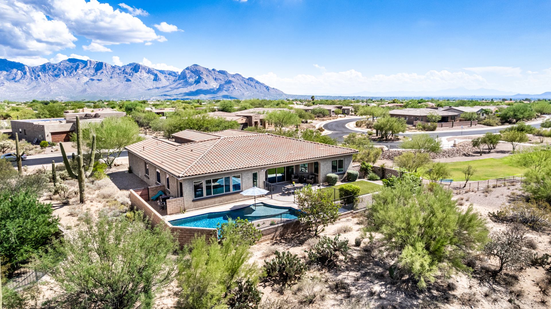 Beyond the gates of one of Oro Valley's most coveted neighborhoods lies a residence that redefines luxury living. Set on nearly half an acre (.45-acre) with a 4-CAR garage, this estate offers the kind of privacy, scale, and spaciousness that are rarely available in this market. This home invites you into the elegant foyer, which sets the stage for what lies beyond. Enjoy the formal living room or continue to the heart of the home and notice the rich dark wood cabinetry, impressive island, designer finishes, large pantry, and 12' sliding glass door. In addition to the great room adjoining the kitchen, the versatile bonus room provides space to curate your own retreat. Five bedrooms and three full baths ensure comfort for family and guests alike, but the primary suite is the crown jewel Expansive and serene, it's a sanctuary of its own with the proportions and appointments you'd expect in a true luxury home. The walk-in shower and soaking tub were crafted with wellness and rejuvenation in mind.