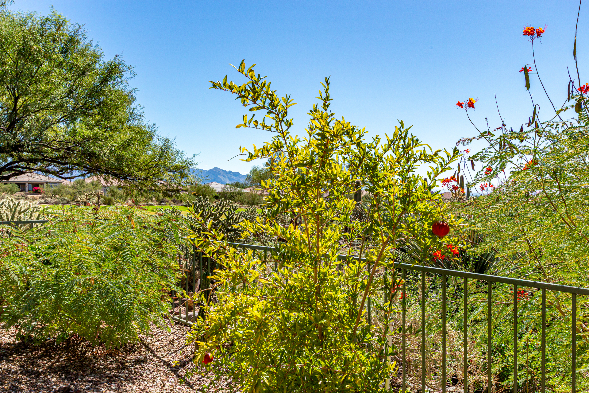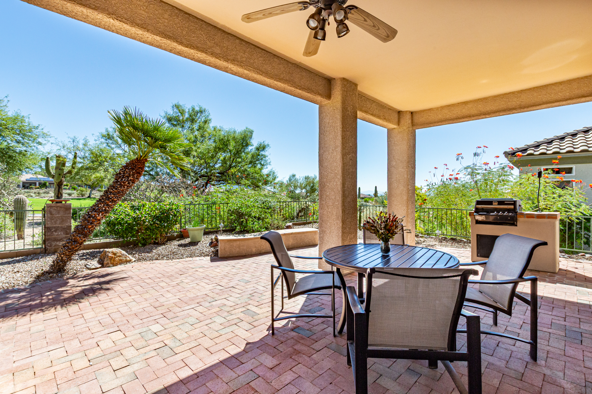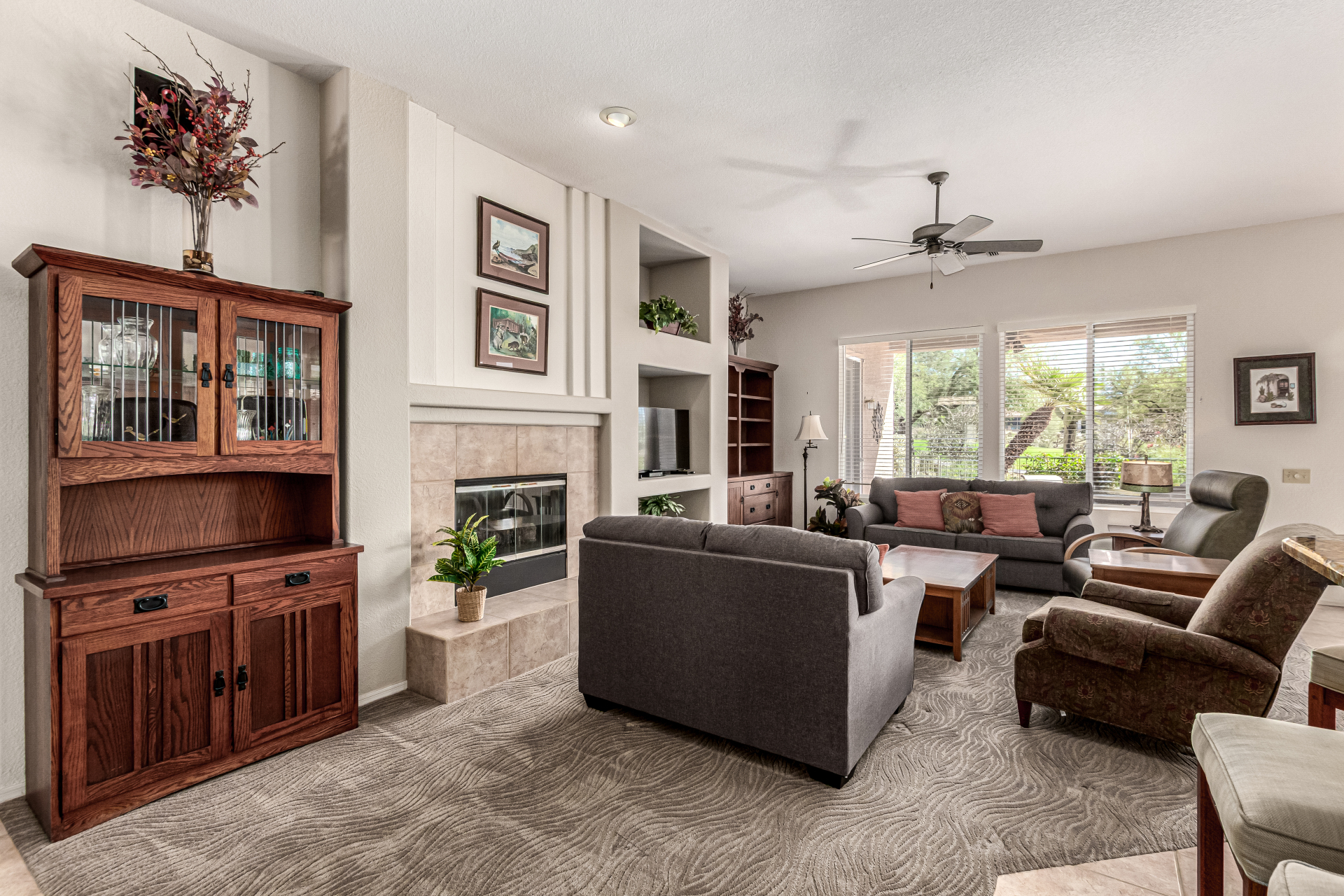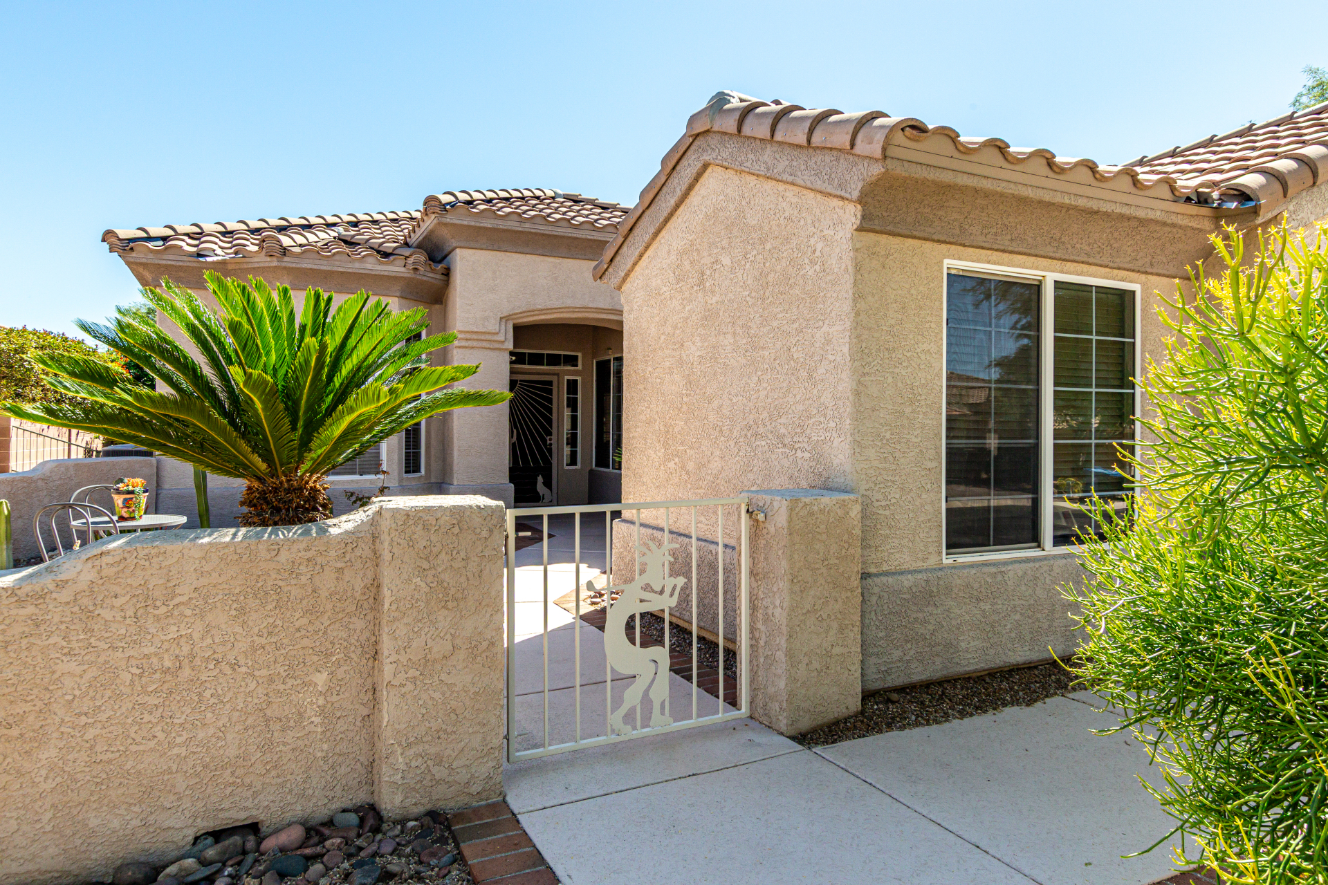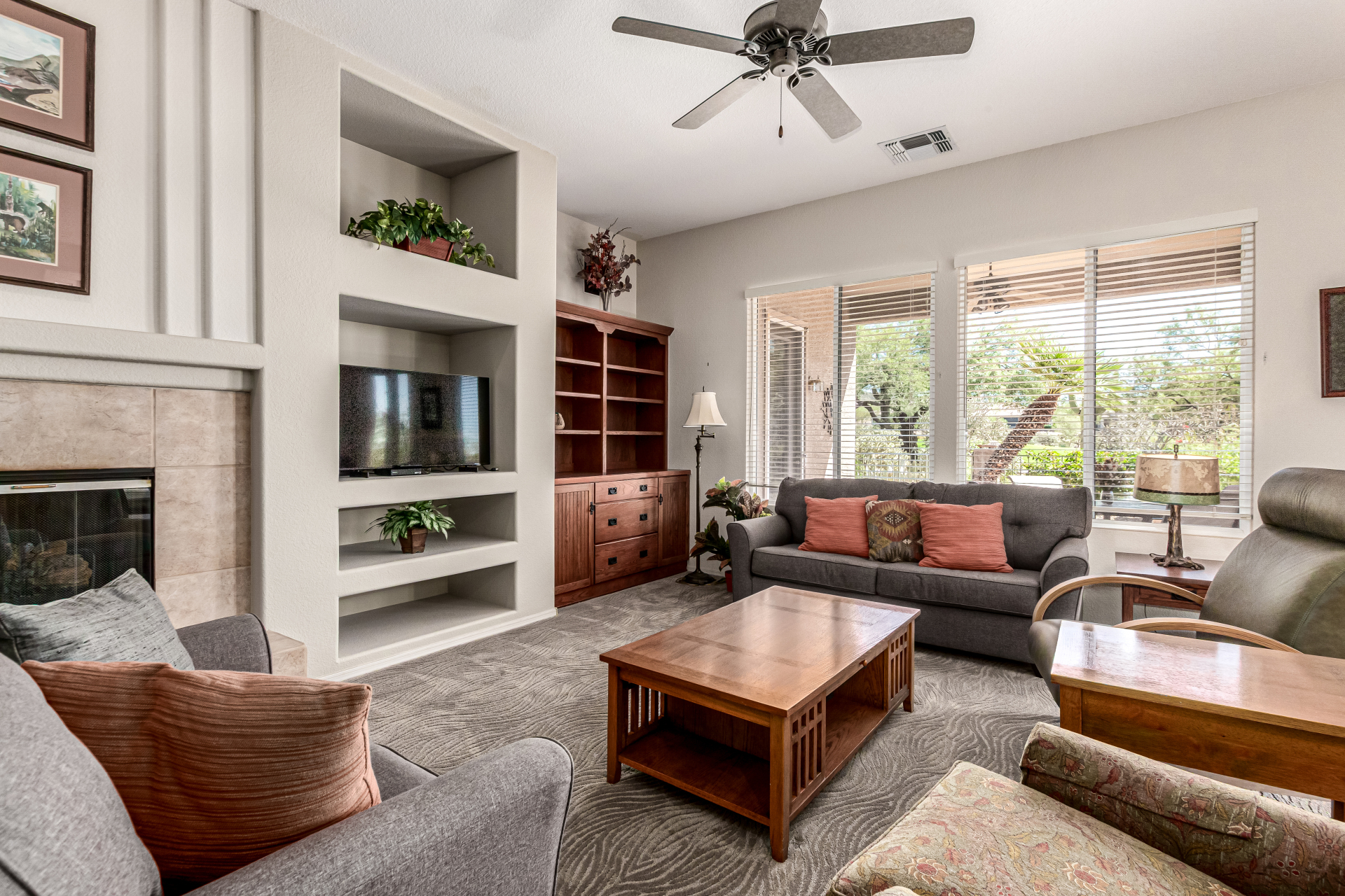 Located on the 3rd fairway with an East facing backyard, this updated home in The Highlands at Dove Mountain features a newer roof, HVAC, water heater and garage door. The fully fenced backyard offers sweeping mountain, golf course, and city light views, while the front courtyard captures magnificent sunsets. Outdoor living is enhanced with grapefruit and pomegranate trees and a built-in gas BBQ. Two bedrooms plus a den, a great room with a gas fireplace, and an updated kitchen with granite countertops, tile backsplash, pull-out cabinets, pantry drawers, and bay window. The oversized utility room includes washer and dryer, sink, storage, and desk space. An extra-large garage provides abundant storage and a golf cart space. Enjoy resort-style amenities- 24 hour security, golf, pickleball, tennis, pool/hot tub, fitness center, restaurant/bar, billiards, clubs, social activities and so much more! Hiking and biking trails a stones throw away from this sought-after active adult community!