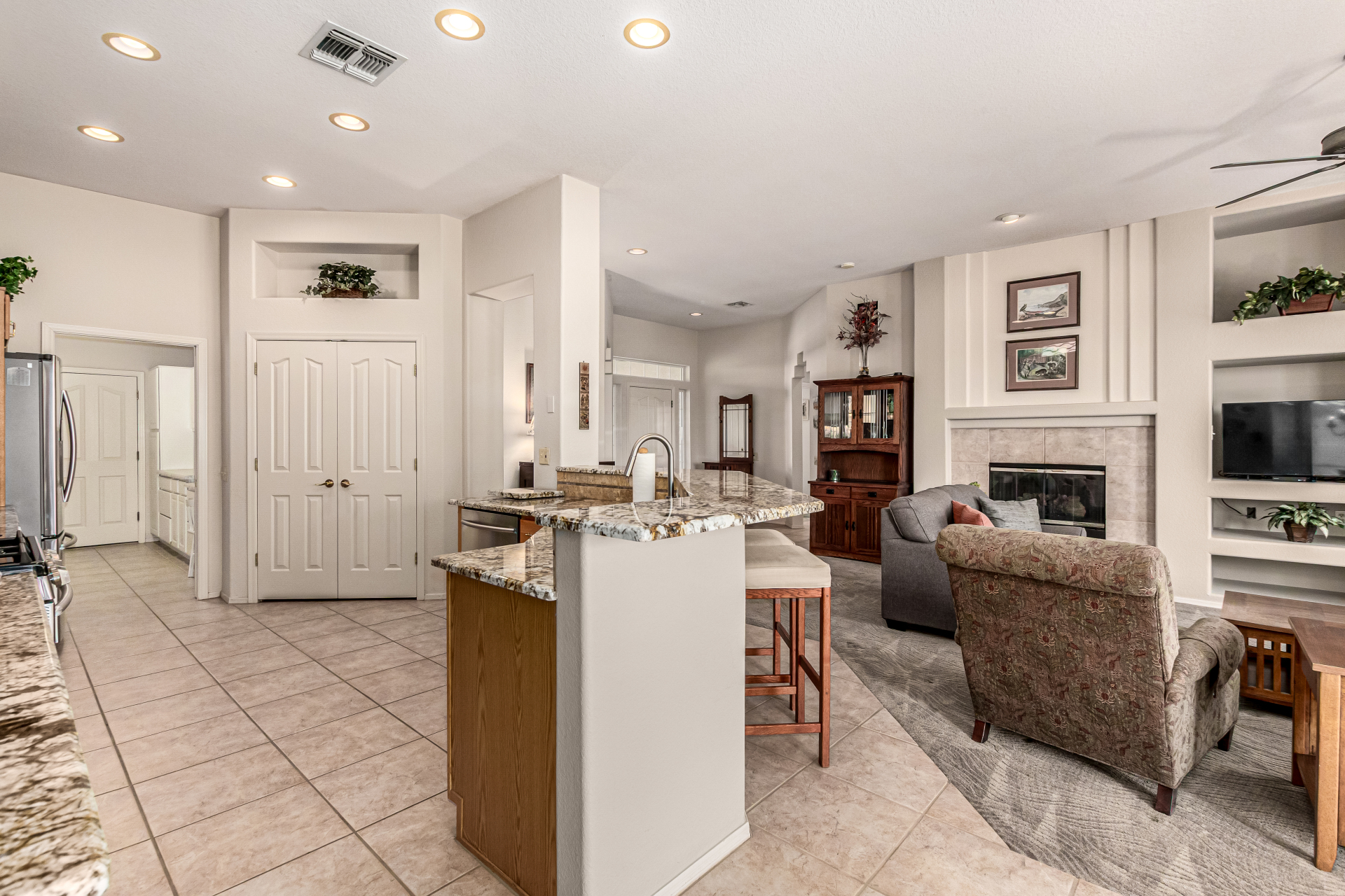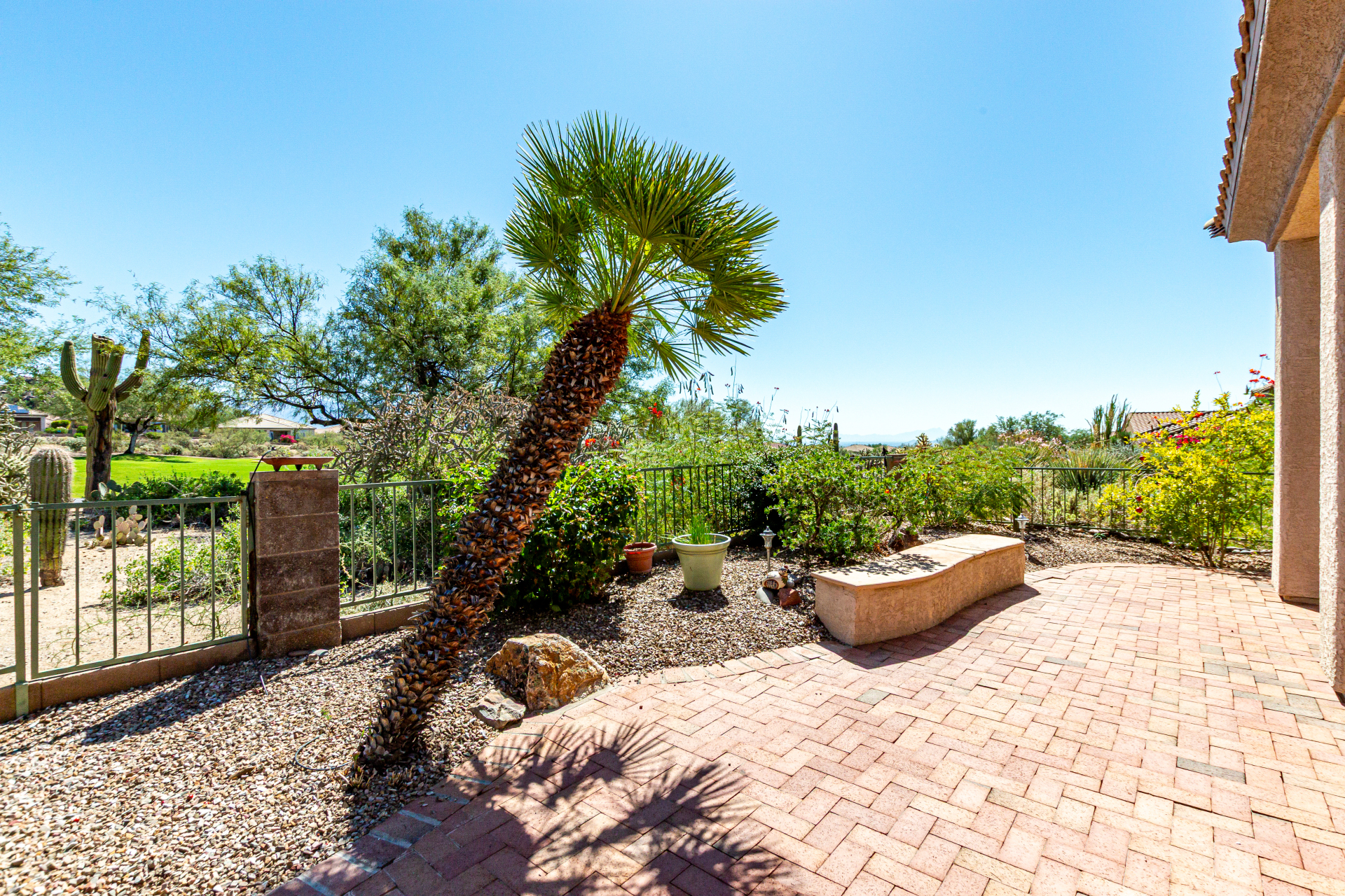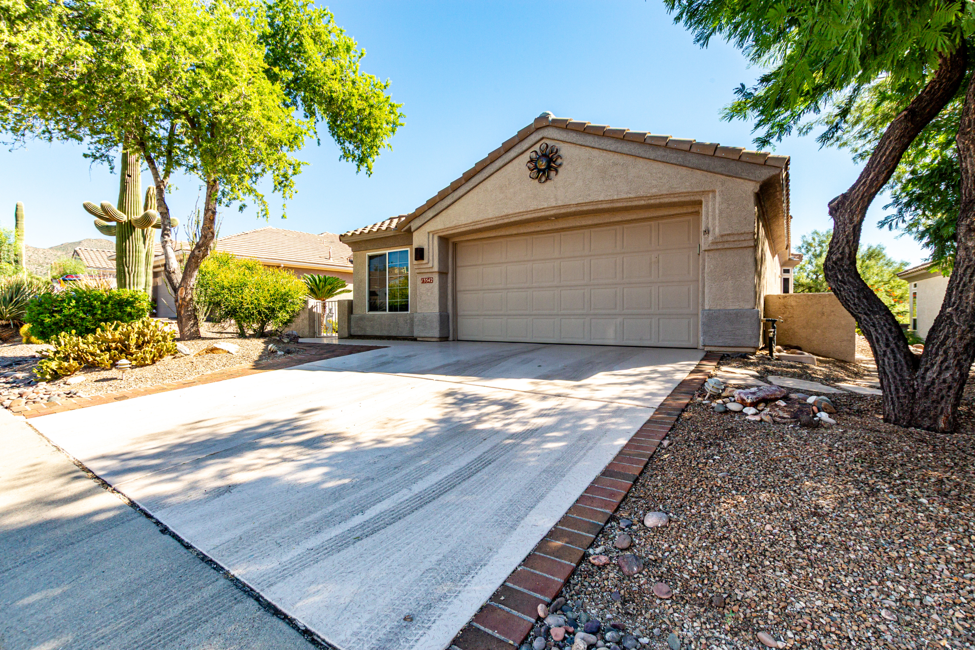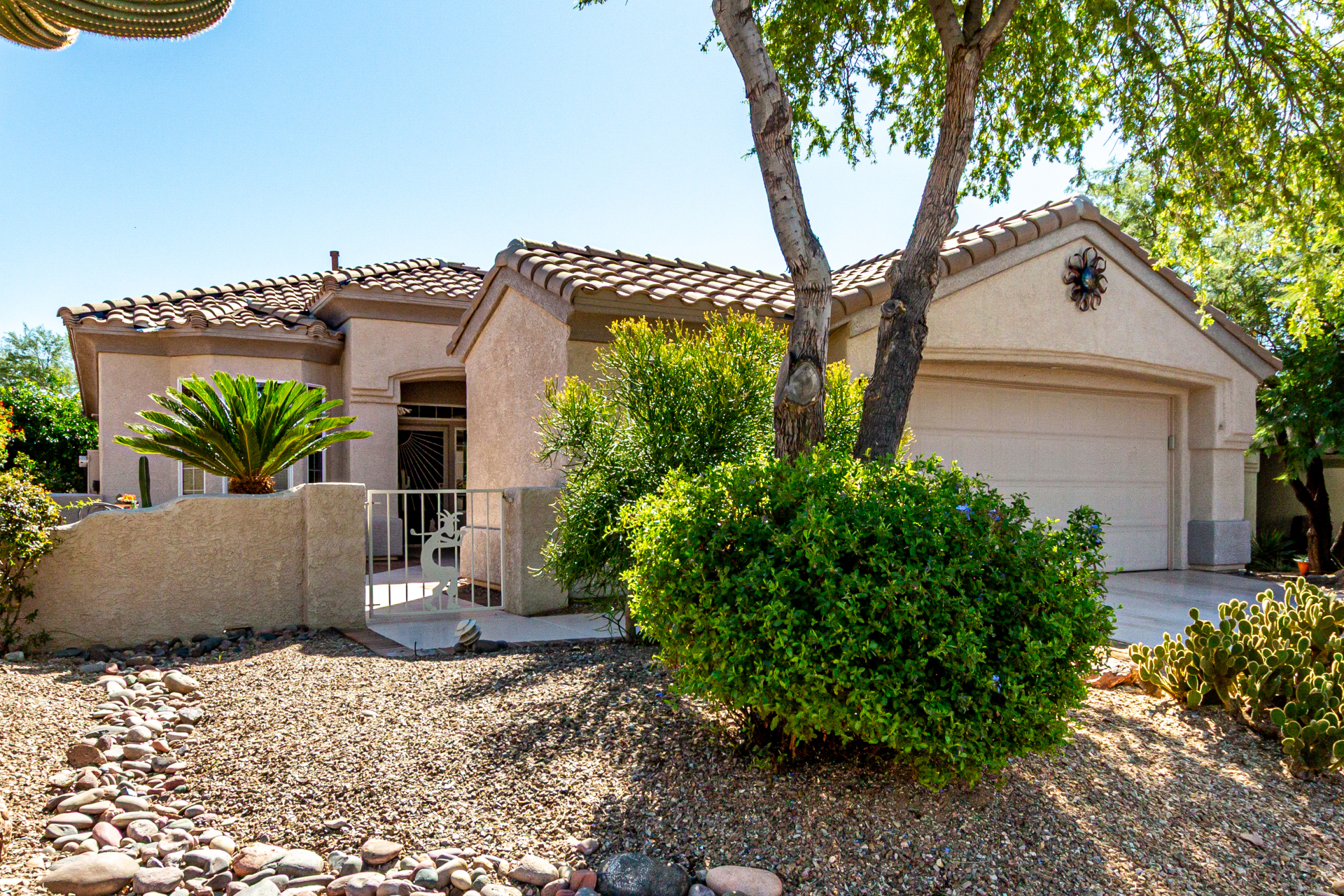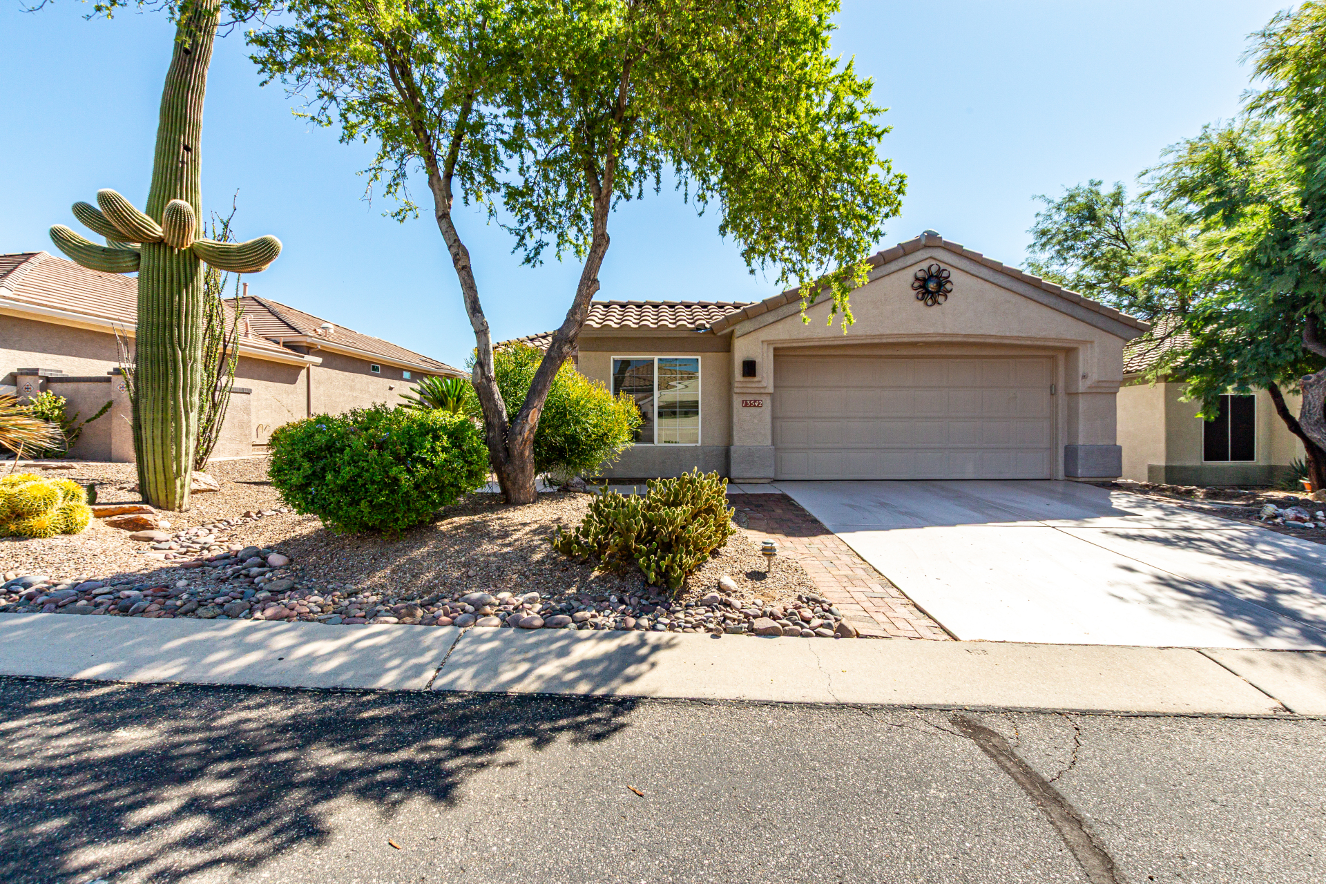 Located on the 3rd fairway with an East facing backyard, this updated home in The Highlands at Dove Mountain features a newer roof, HVAC, water heater and garage door. The fully fenced backyard offers sweeping mountain, golf course, and city light views, while the front courtyard captures magnificent sunsets. Outdoor living is enhanced with grapefruit and pomegranate trees and a built-in gas BBQ. Two bedrooms plus a den, a great room with a gas fireplace, and an updated kitchen with granite countertops, tile backsplash, pull-out cabinets, pantry drawers, and bay window. The oversized utility room includes washer and dryer, sink, storage, and desk space. An extra-large garage provides abundant storage and a golf cart space. Enjoy resort-style amenities- 24 hour security, golf, pickleball, tennis, pool/hot tub, fitness center, restaurant/bar, billiards, clubs, social activities and so much more! Hiking and biking trails a stones throw away from this sought-after active adult community!