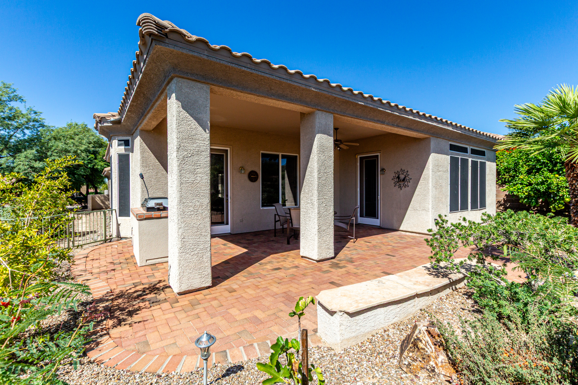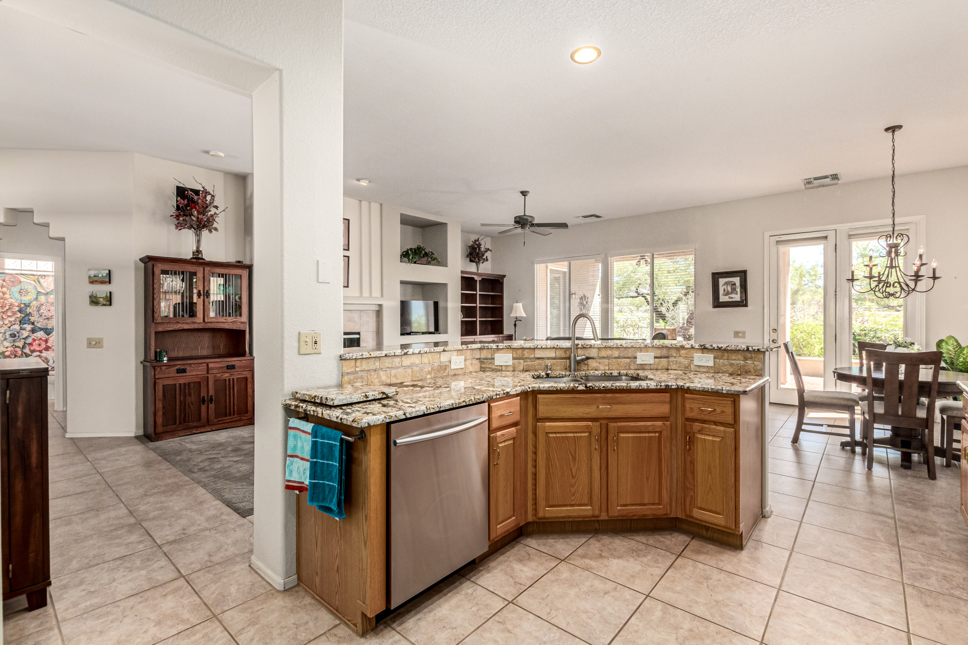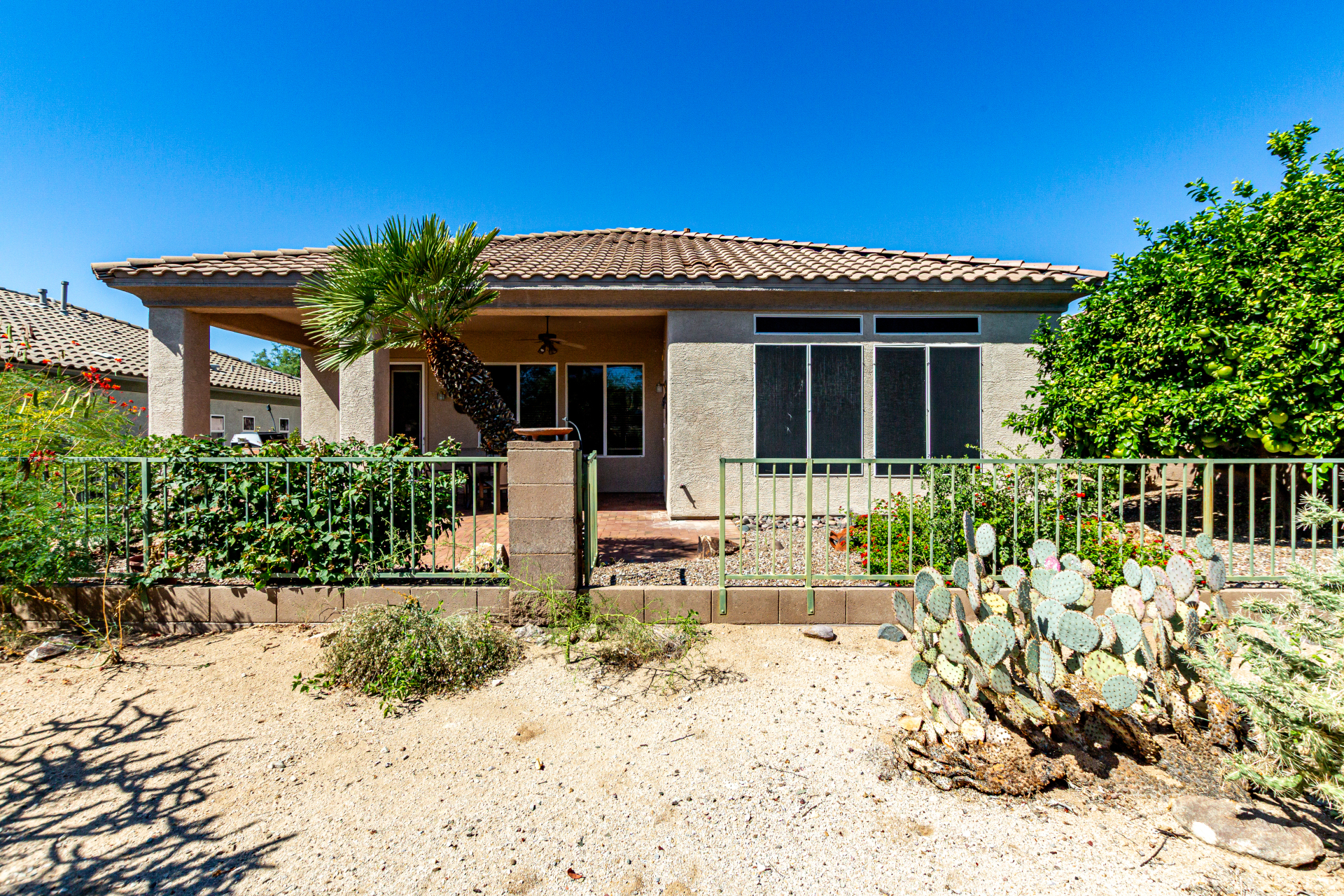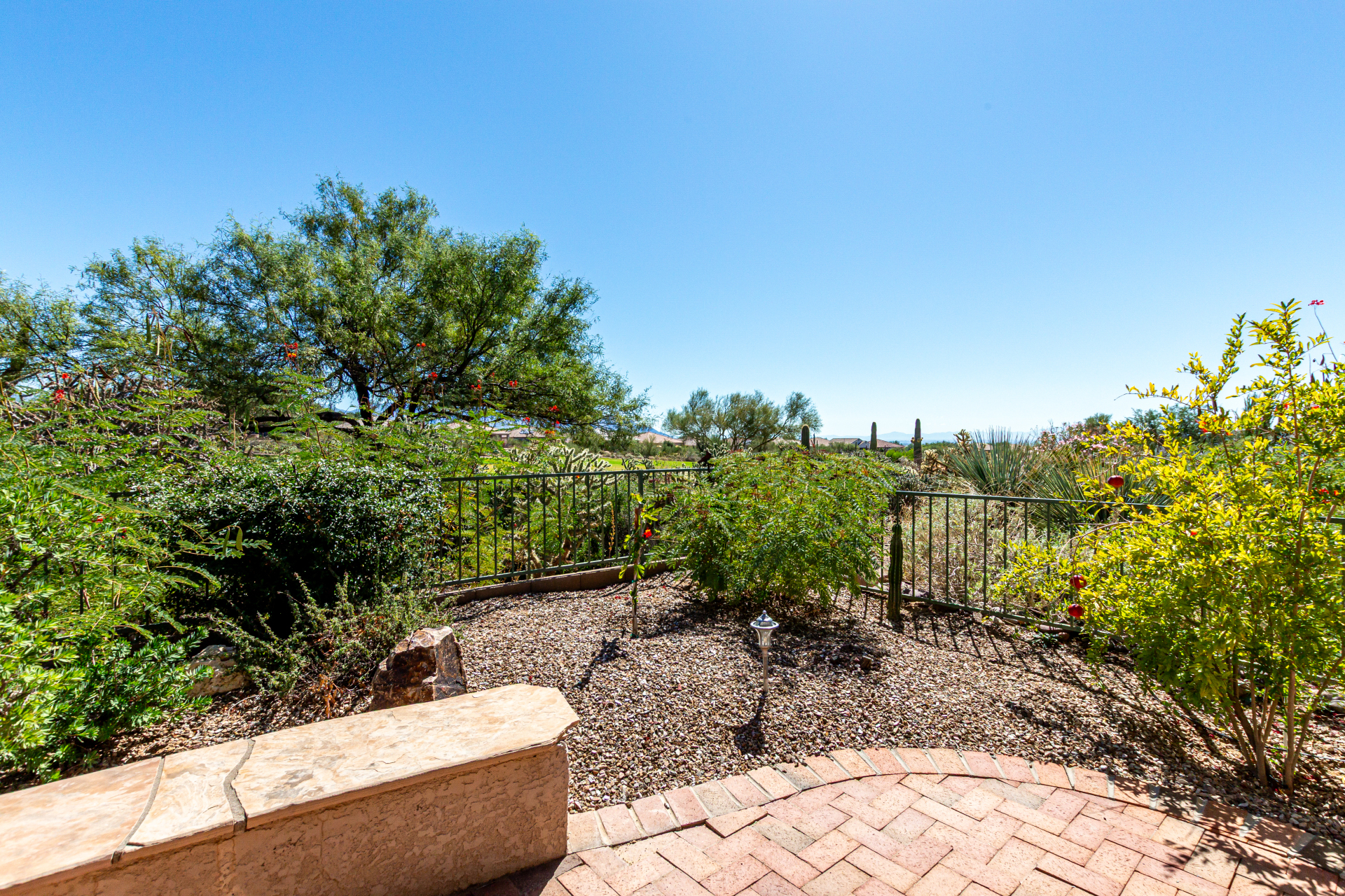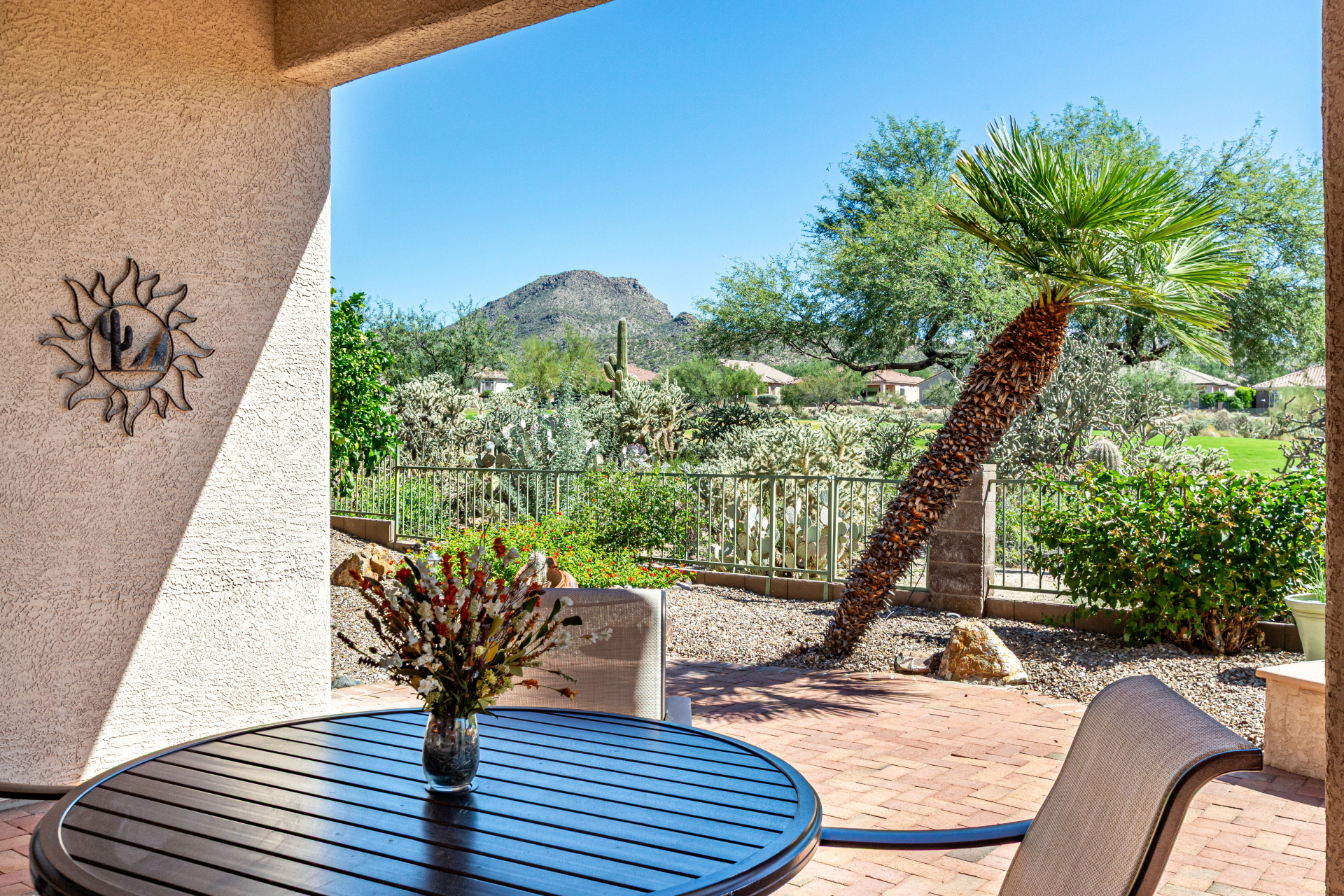 Located on the 3rd fairway with an East facing backyard, this updated home in The Highlands at Dove Mountain features a newer roof, HVAC, water heater and garage door. The fully fenced backyard offers sweeping mountain, golf course, and city light views, while the front courtyard captures magnificent sunsets. Outdoor living is enhanced with grapefruit and pomegranate trees and a built-in gas BBQ. Two bedrooms plus a den, a great room with a gas fireplace, and an updated kitchen with granite countertops, tile backsplash, pull-out cabinets, pantry drawers, and bay window. The oversized utility room includes washer and dryer, sink, storage, and desk space. An extra-large garage provides abundant storage and a golf cart space. Enjoy resort-style amenities- 24 hour security, golf, pickleball, tennis, pool/hot tub, fitness center, restaurant/bar, billiards, clubs, social activities and so much more! Hiking and biking trails a stones throw away from this sought-after active adult community!
