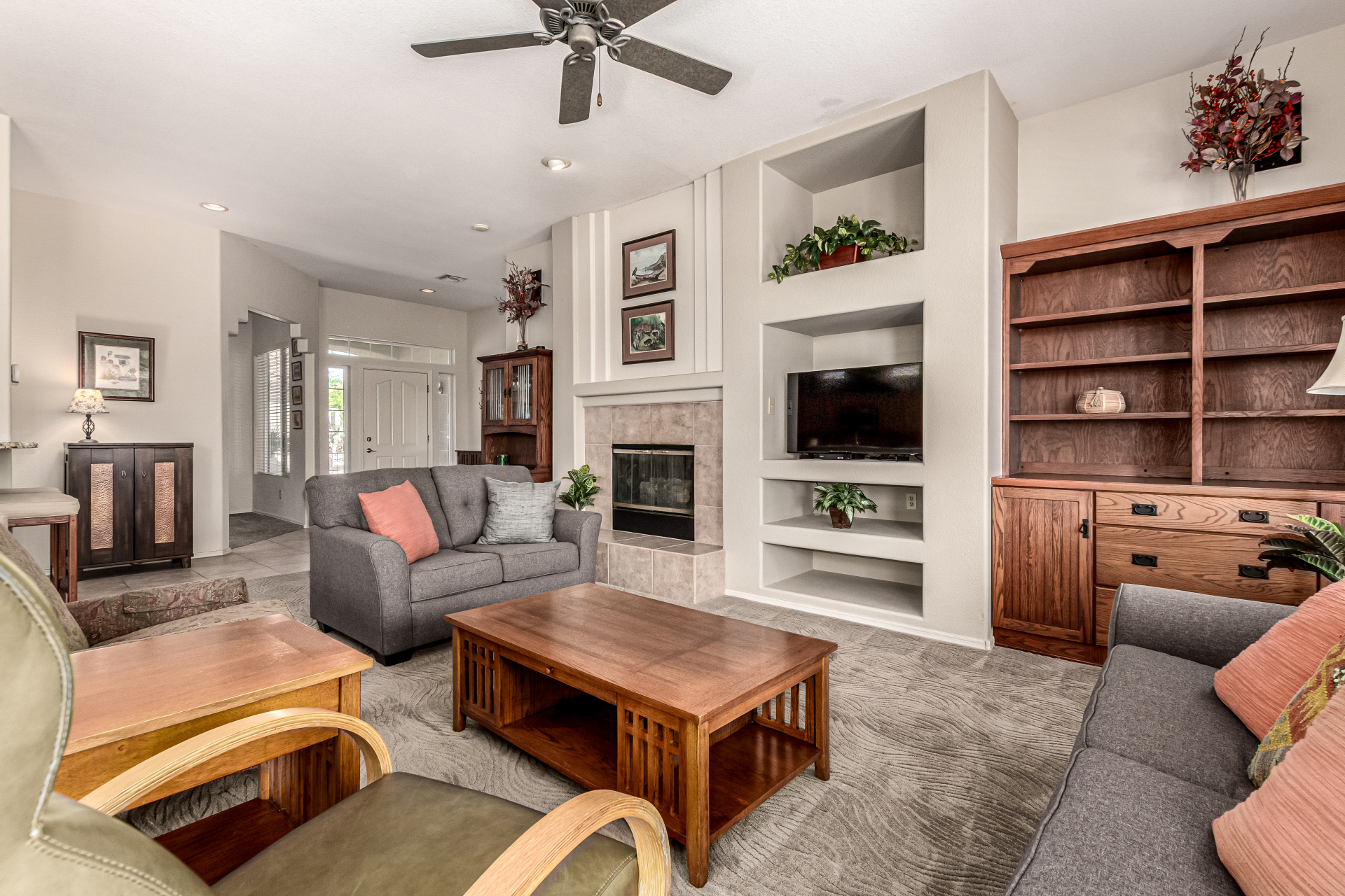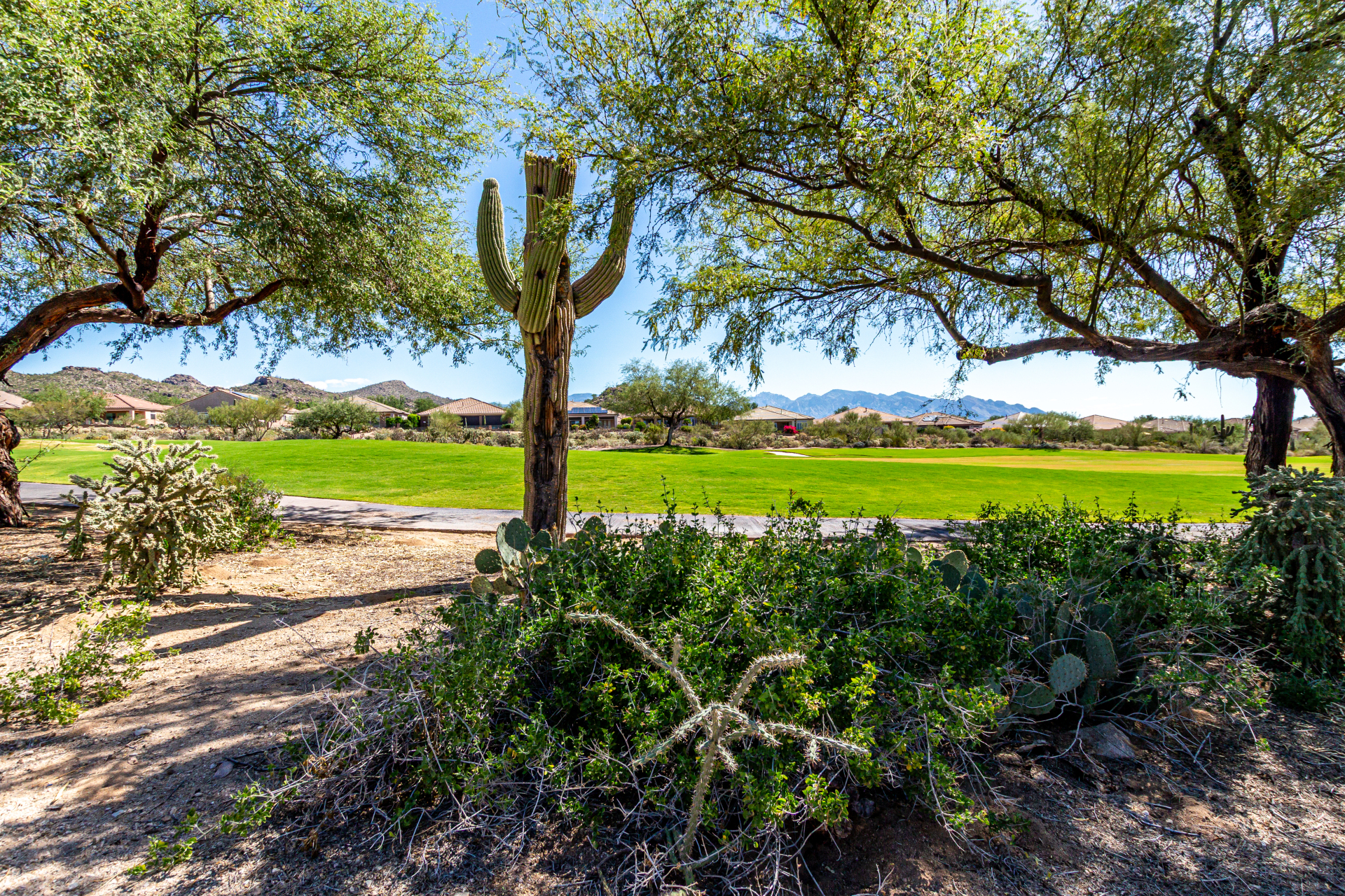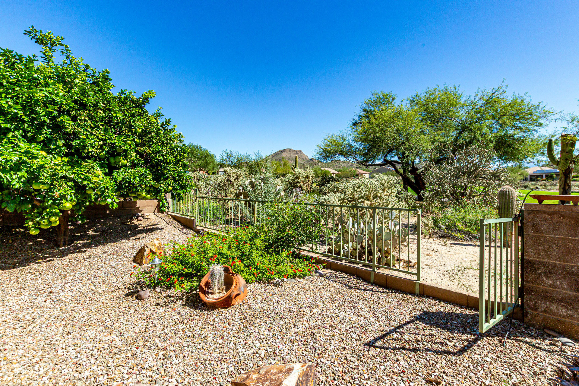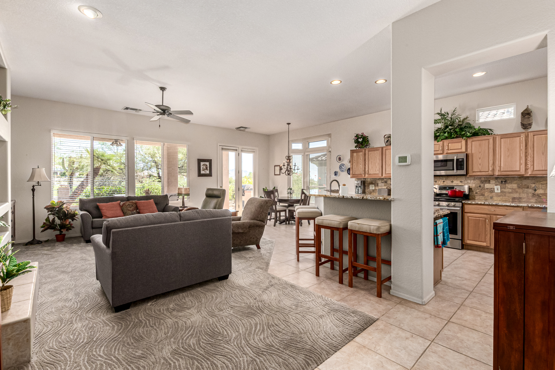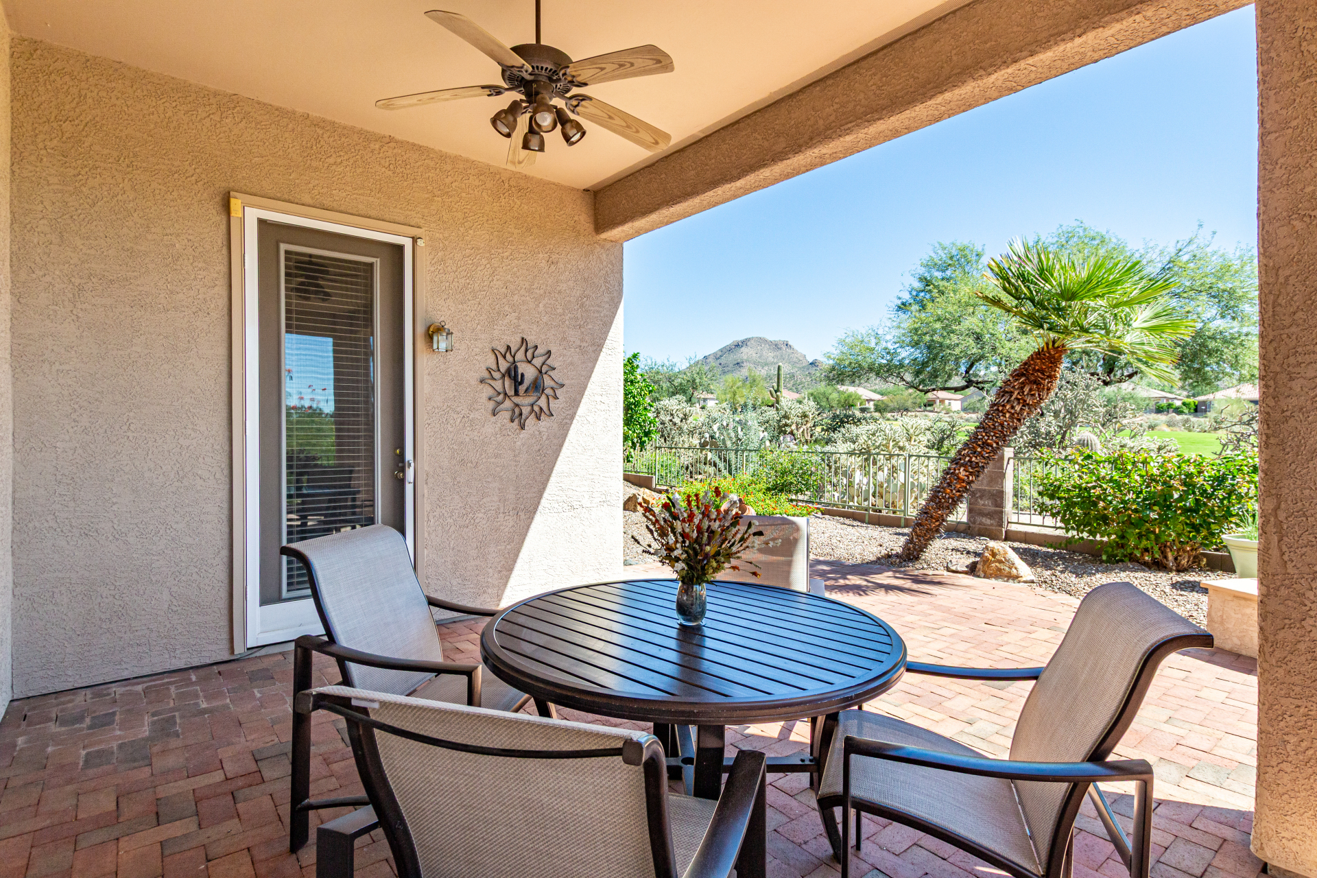 Located on the 3rd fairway with an East facing backyard, this updated home in The Highlands at Dove Mountain features a newer roof, HVAC, water heater and garage door. The fully fenced backyard offers sweeping mountain, golf course, and city light views, while the front courtyard captures magnificent sunsets. Outdoor living is enhanced with grapefruit and pomegranate trees and a built-in gas BBQ. Two bedrooms plus a den, a great room with a gas fireplace, and an updated kitchen with granite countertops, tile backsplash, pull-out cabinets, pantry drawers, and bay window. The oversized utility room includes washer and dryer, sink, storage, and desk space. An extra-large garage provides abundant storage and a golf cart space. Enjoy resort-style amenities- 24 hour security, golf, pickleball, tennis, pool/hot tub, fitness center, restaurant/bar, billiards, clubs, social activities and so much more! Hiking and biking trails a stones throw away from this sought-after active adult community!