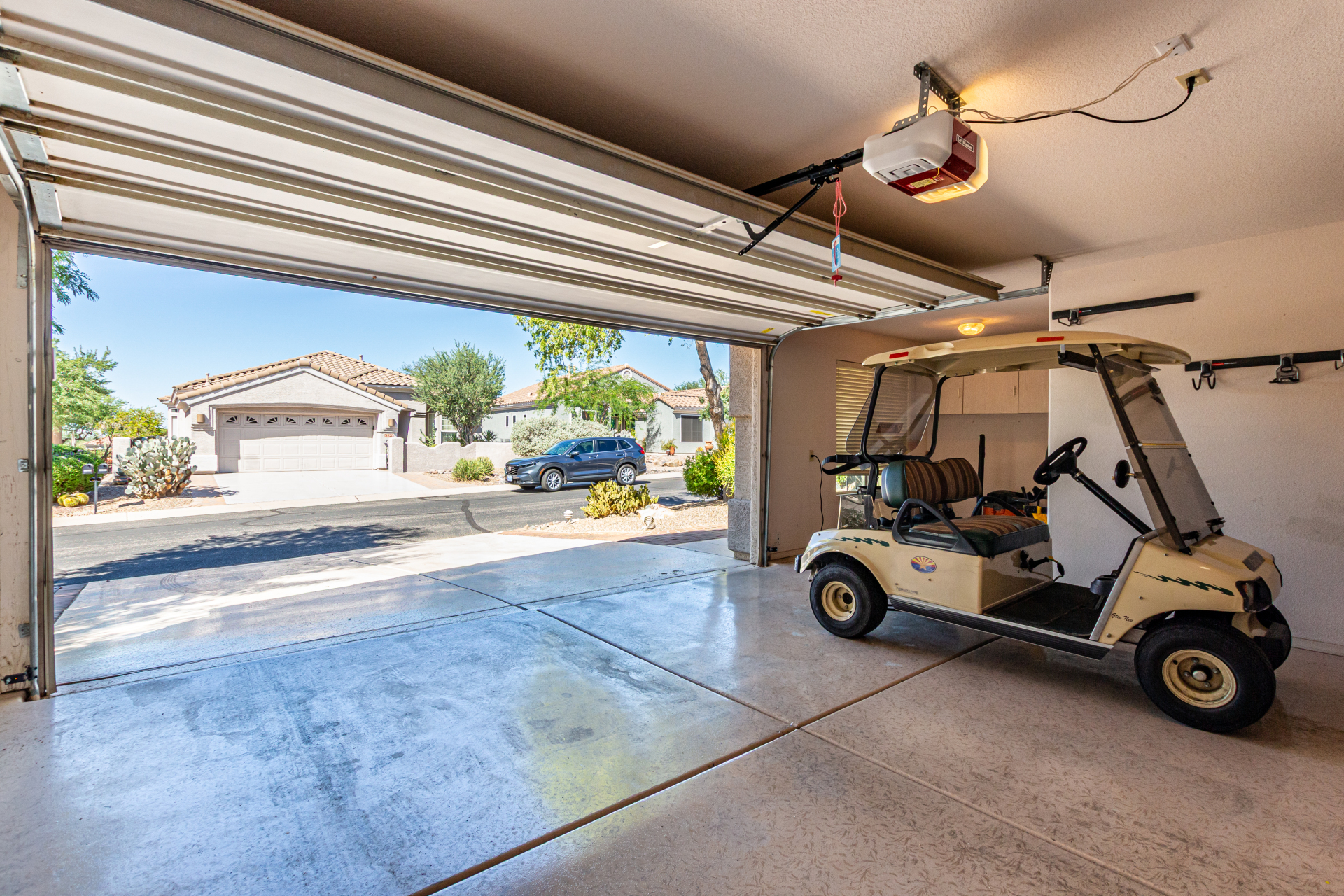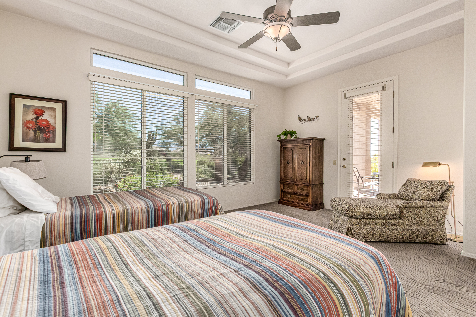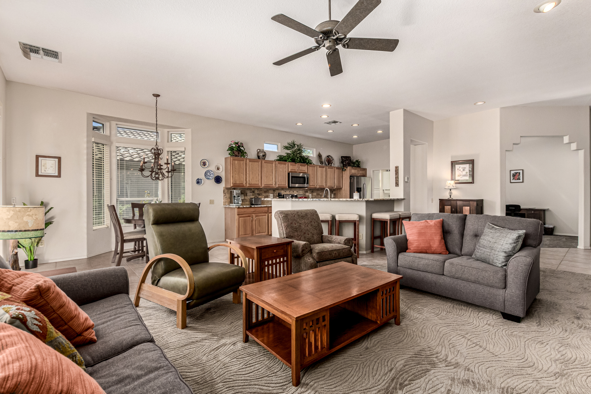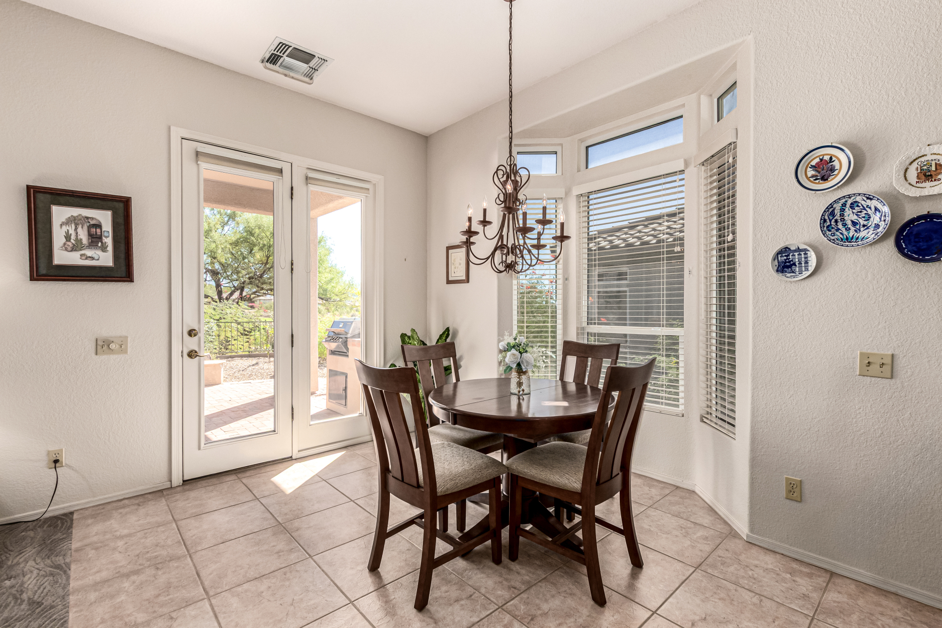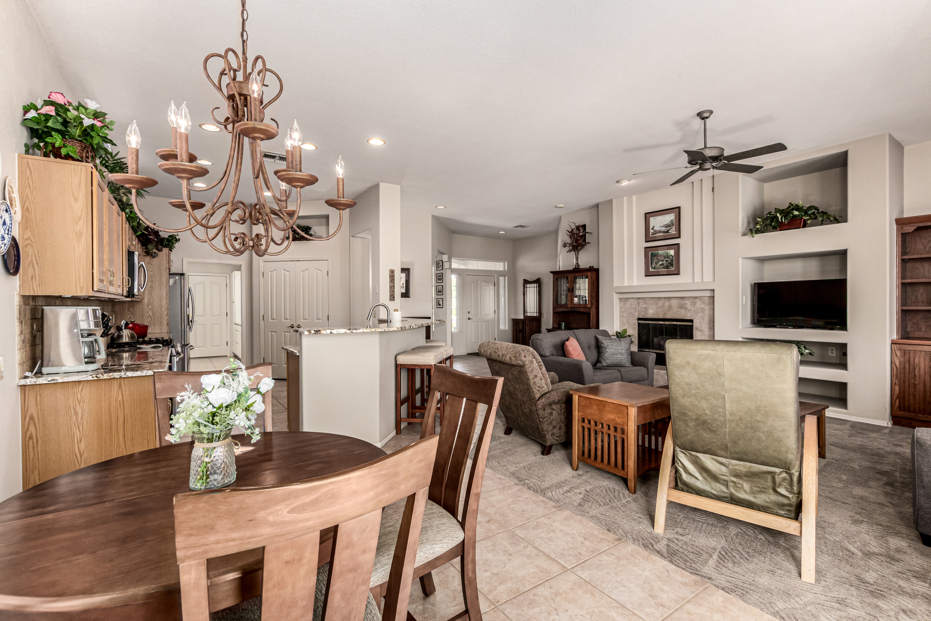 Located on the 3rd fairway with an East facing backyard, this updated home in The Highlands at Dove Mountain features a newer roof, HVAC, water heater and garage door. The fully fenced backyard offers sweeping mountain, golf course, and city light views, while the front courtyard captures magnificent sunsets. Outdoor living is enhanced with grapefruit and pomegranate trees and a built-in gas BBQ. Two bedrooms plus a den, a great room with a gas fireplace, and an updated kitchen with granite countertops, tile backsplash, pull-out cabinets, pantry drawers, and bay window. The oversized utility room includes washer and dryer, sink, storage, and desk space. An extra-large garage provides abundant storage and a golf cart space. Enjoy resort-style amenities- 24 hour security, golf, pickleball, tennis, pool/hot tub, fitness center, restaurant/bar, billiards, clubs, social activities and so much more! Hiking and biking trails a stones throw away from this sought-after active adult community!