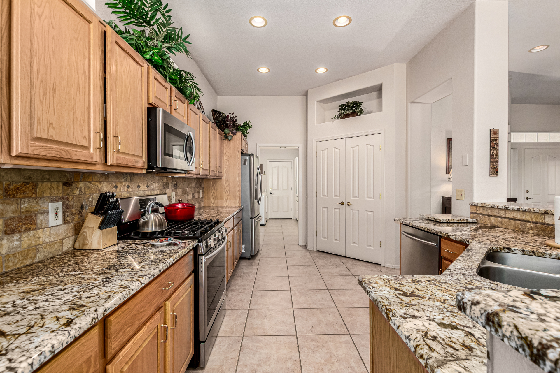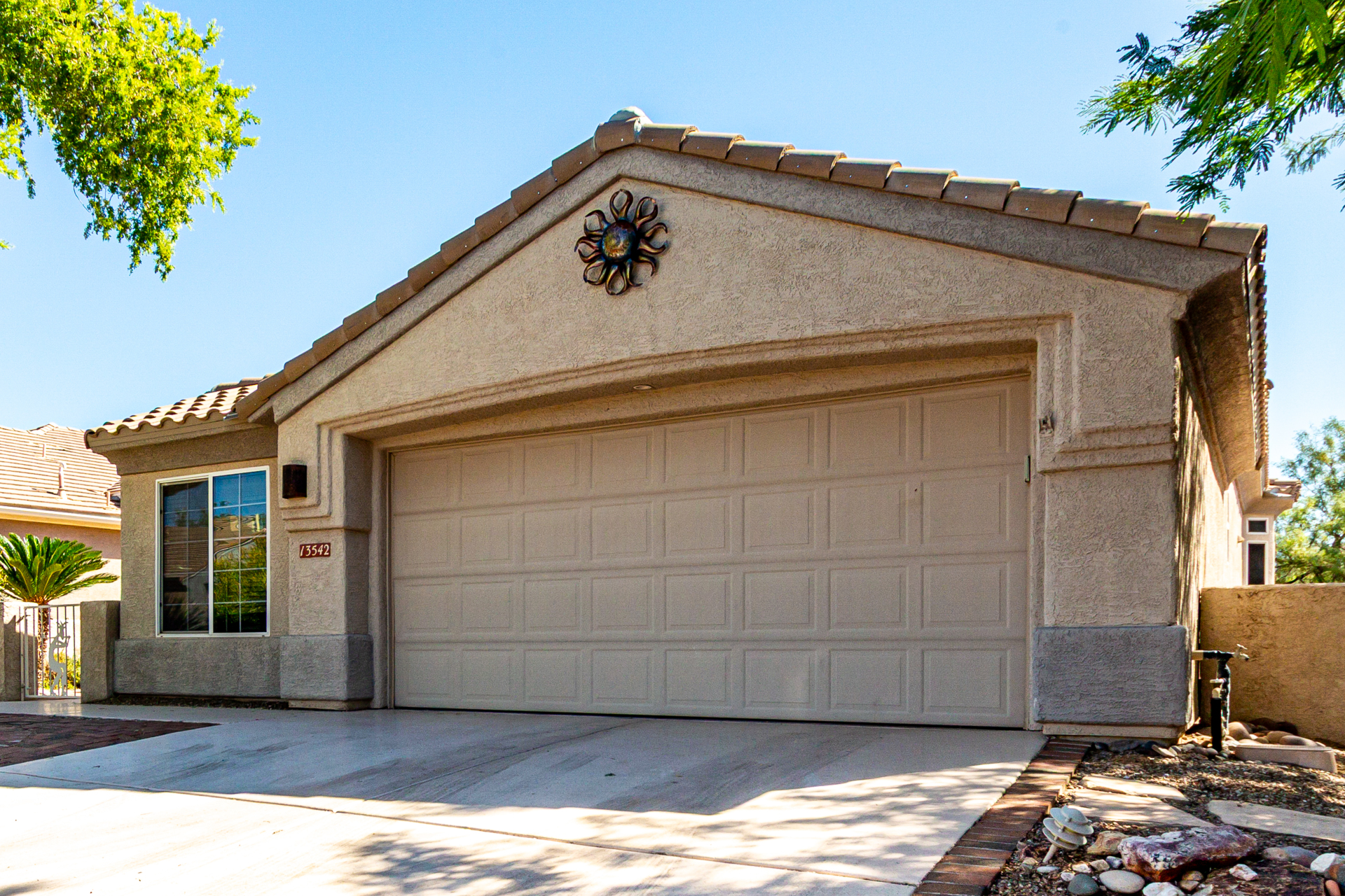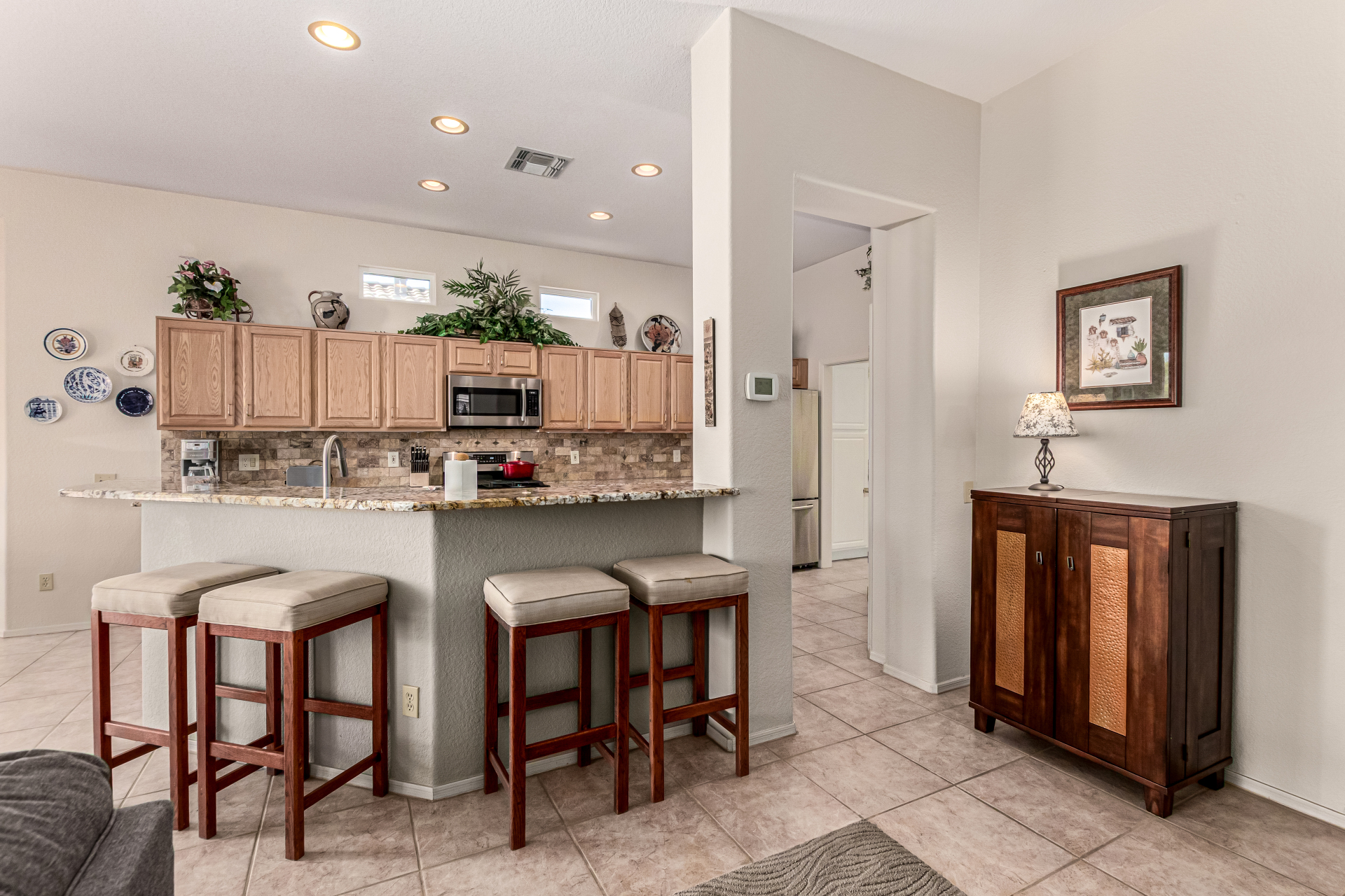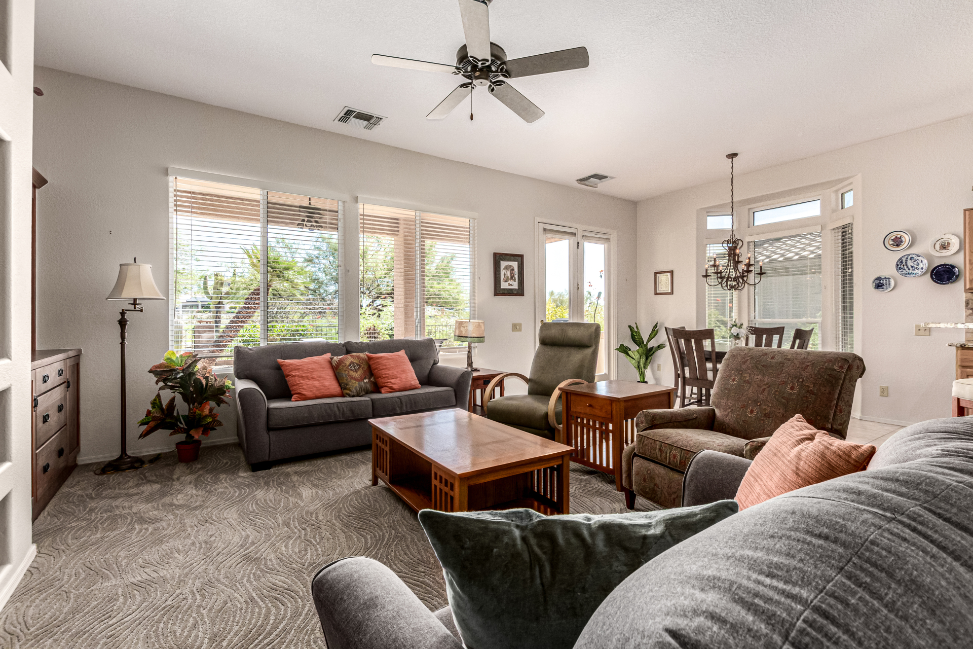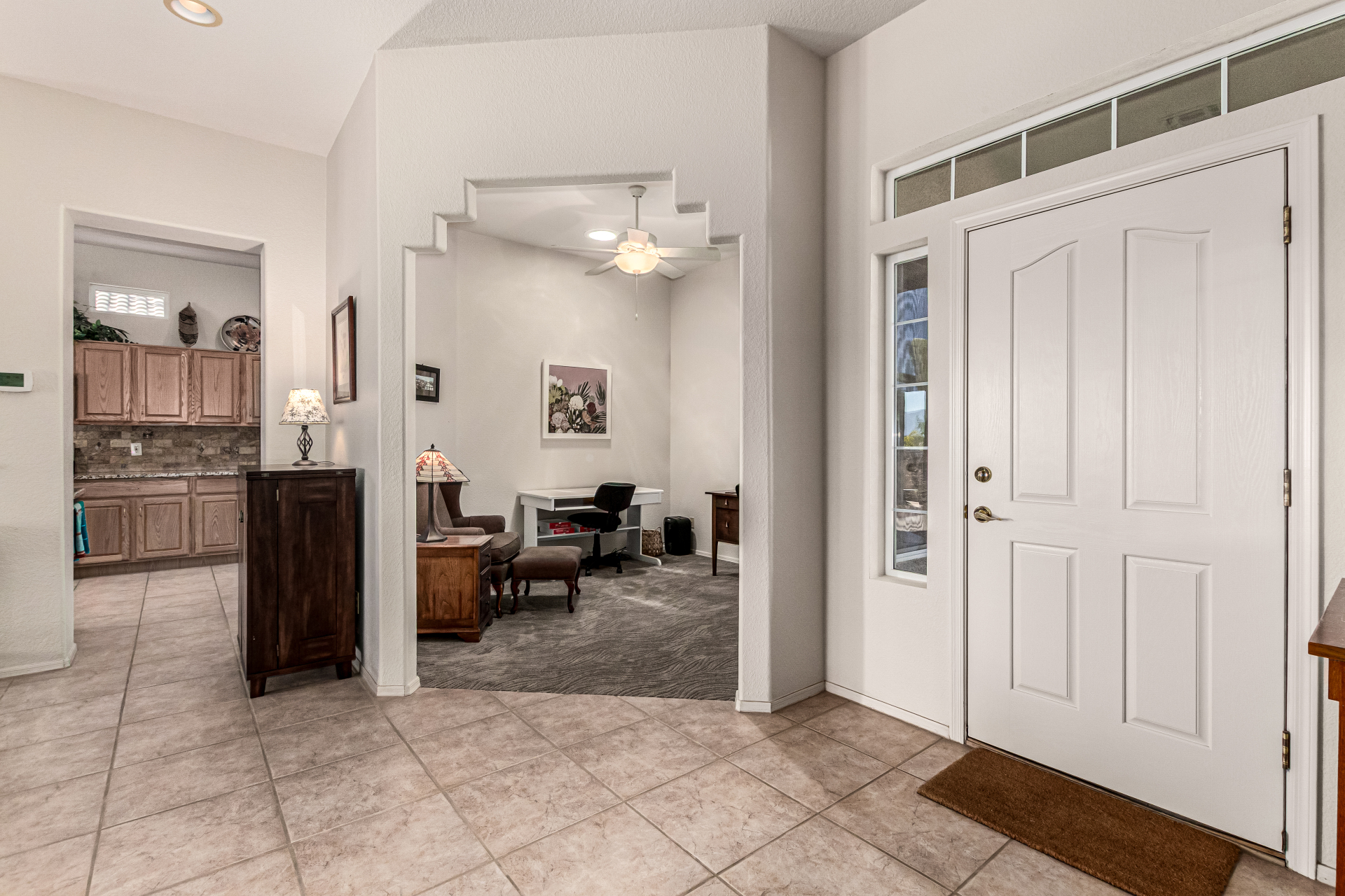 Located on the 3rd fairway with an East facing backyard, this updated home in The Highlands at Dove Mountain features a newer roof, HVAC, water heater and garage door. The fully fenced backyard offers sweeping mountain, golf course, and city light views, while the front courtyard captures magnificent sunsets. Outdoor living is enhanced with grapefruit and pomegranate trees and a built-in gas BBQ. Two bedrooms plus a den, a great room with a gas fireplace, and an updated kitchen with granite countertops, tile backsplash, pull-out cabinets, pantry drawers, and bay window. The oversized utility room includes washer and dryer, sink, storage, and desk space. An extra-large garage provides abundant storage and a golf cart space. Enjoy resort-style amenities- 24 hour security, golf, pickleball, tennis, pool/hot tub, fitness center, restaurant/bar, billiards, clubs, social activities and so much more! Hiking and biking trails a stones throw away from this sought-after active adult community!