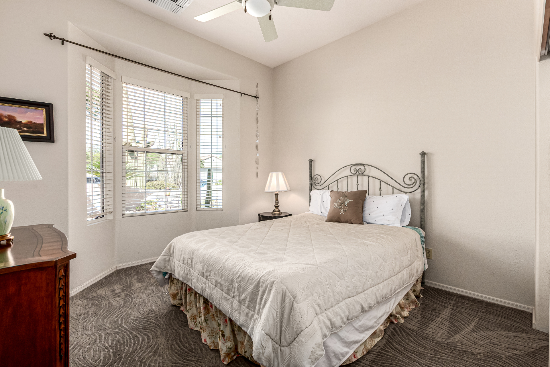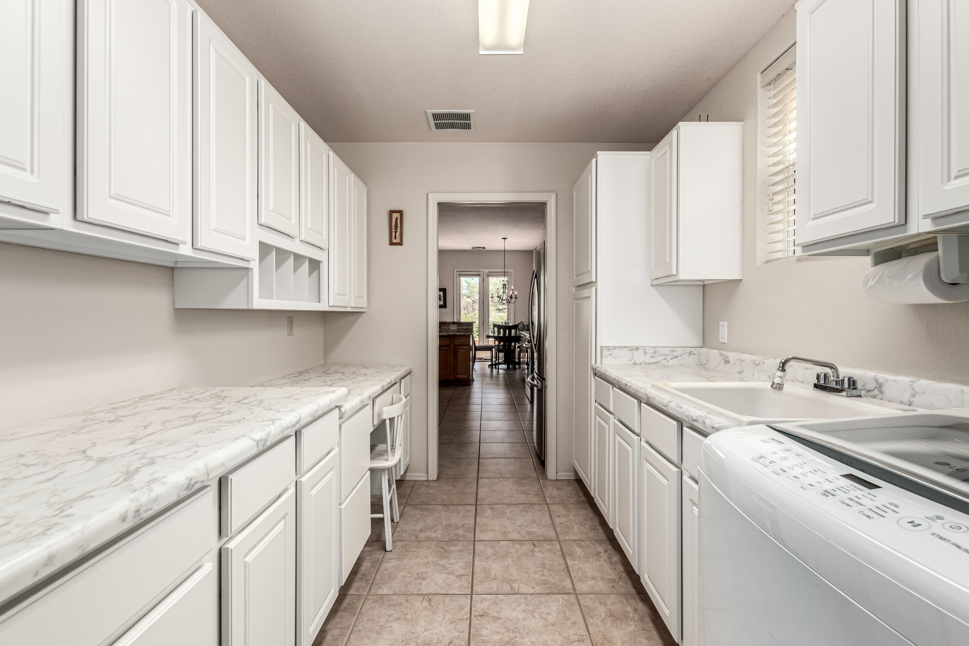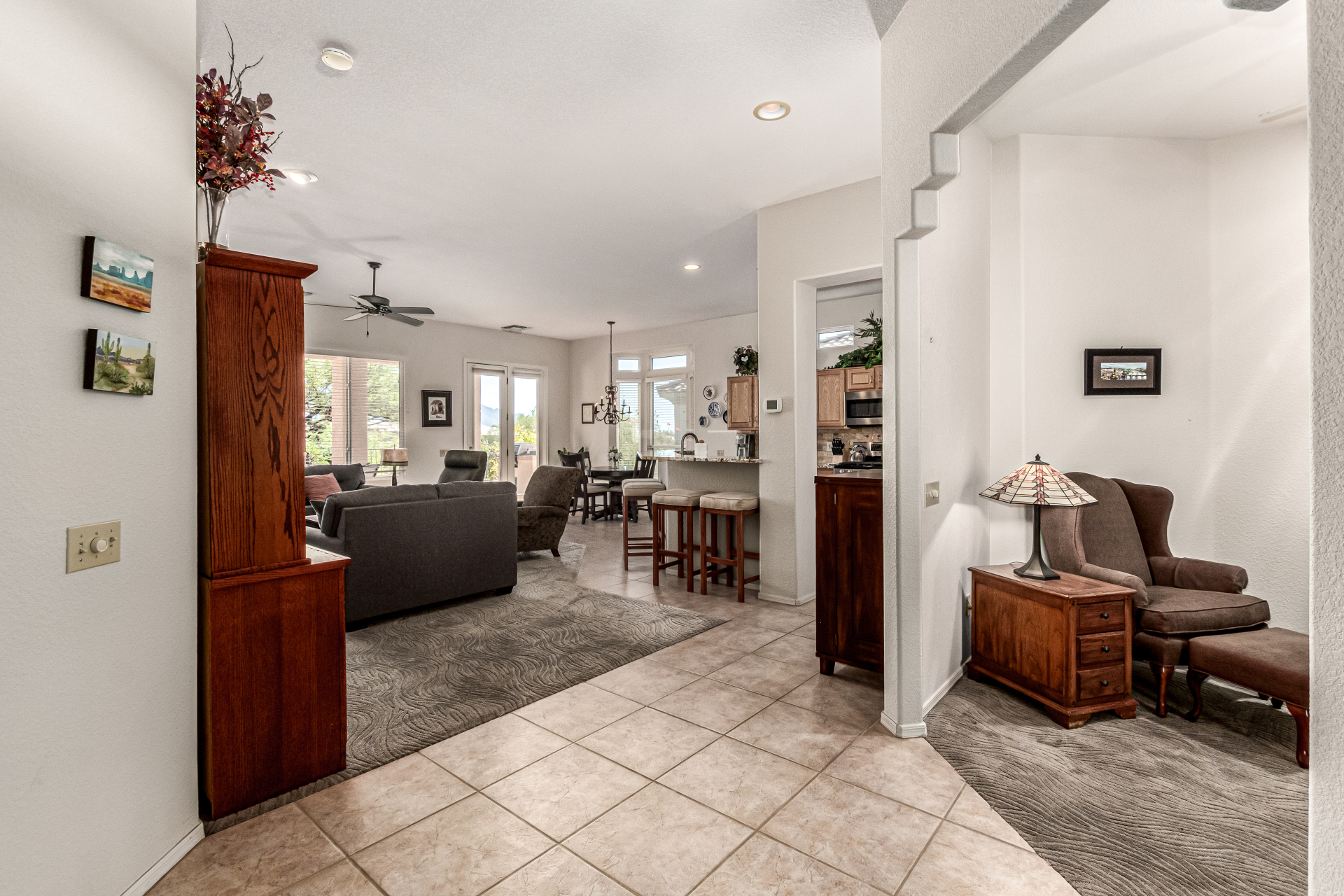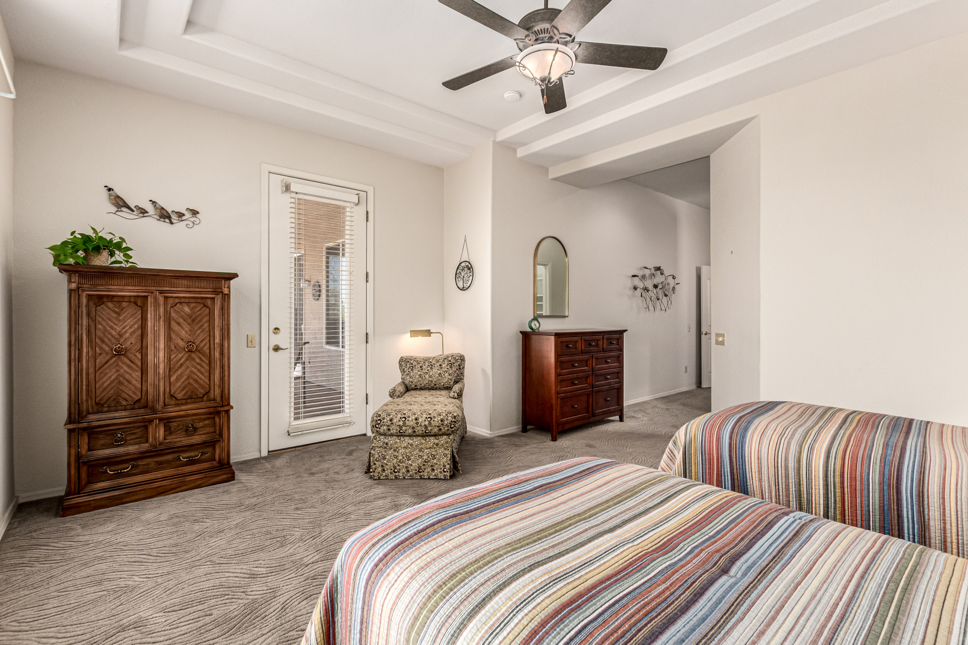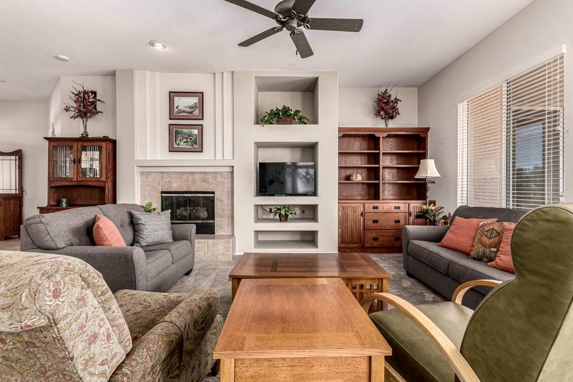 Located on the 3rd fairway with an East facing backyard, this updated home in The Highlands at Dove Mountain features a newer roof, HVAC, water heater and garage door. The fully fenced backyard offers sweeping mountain, golf course, and city light views, while the front courtyard captures magnificent sunsets. Outdoor living is enhanced with grapefruit and pomegranate trees and a built-in gas BBQ. Two bedrooms plus a den, a great room with a gas fireplace, and an updated kitchen with granite countertops, tile backsplash, pull-out cabinets, pantry drawers, and bay window. The oversized utility room includes washer and dryer, sink, storage, and desk space. An extra-large garage provides abundant storage and a golf cart space. Enjoy resort-style amenities- 24 hour security, golf, pickleball, tennis, pool/hot tub, fitness center, restaurant/bar, billiards, clubs, social activities and so much more! Hiking and biking trails a stones throw away from this sought-after active adult community!
