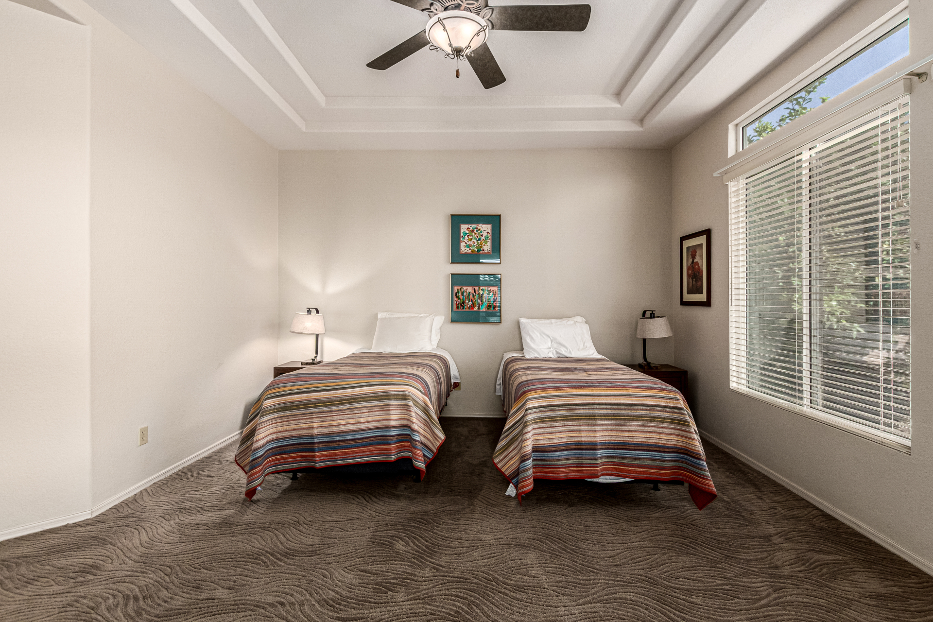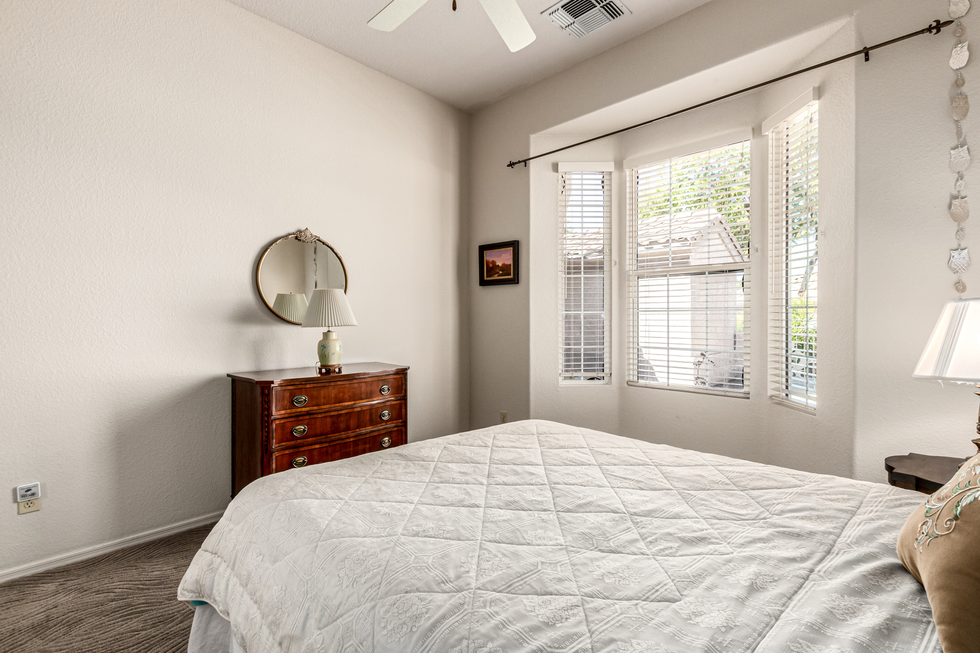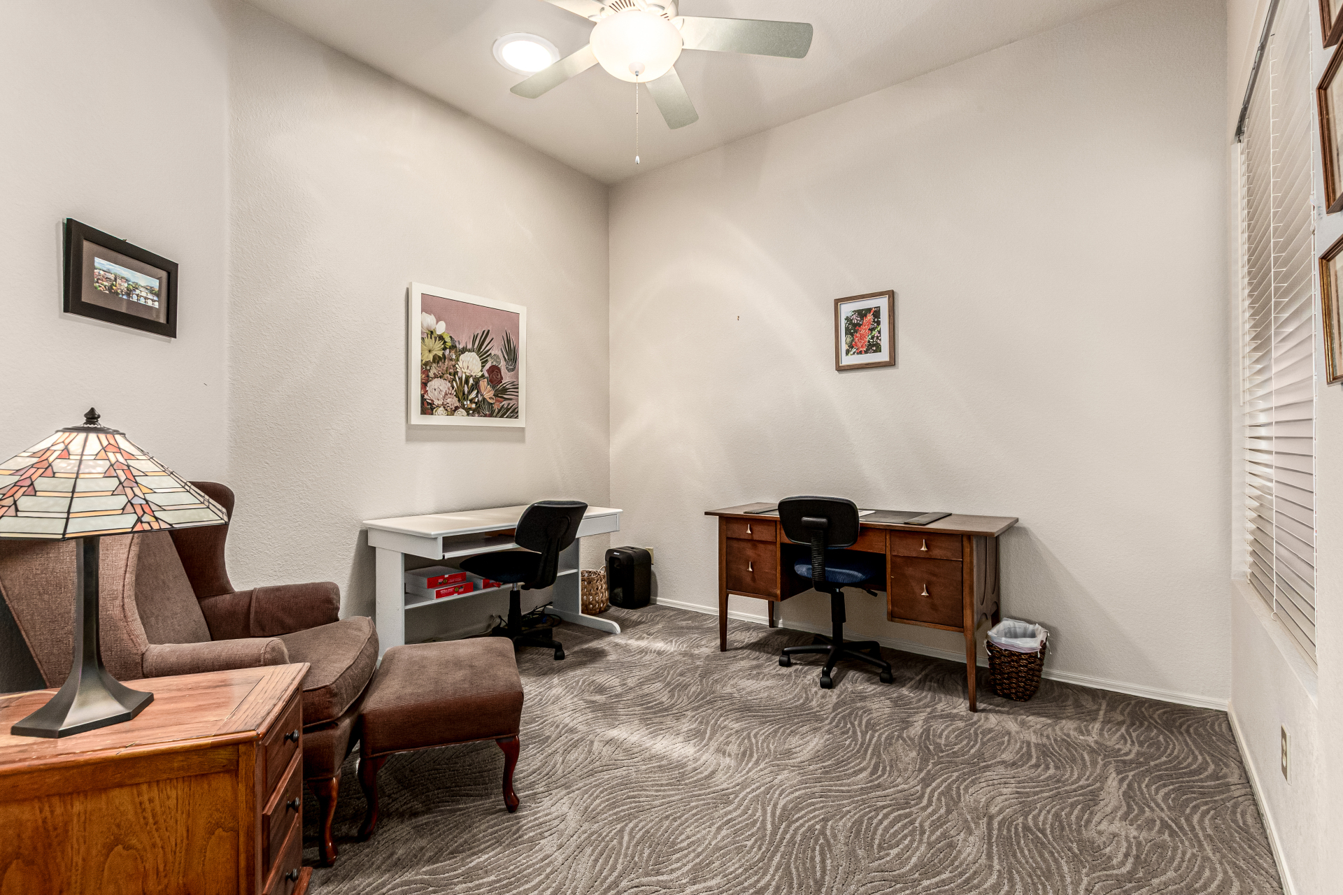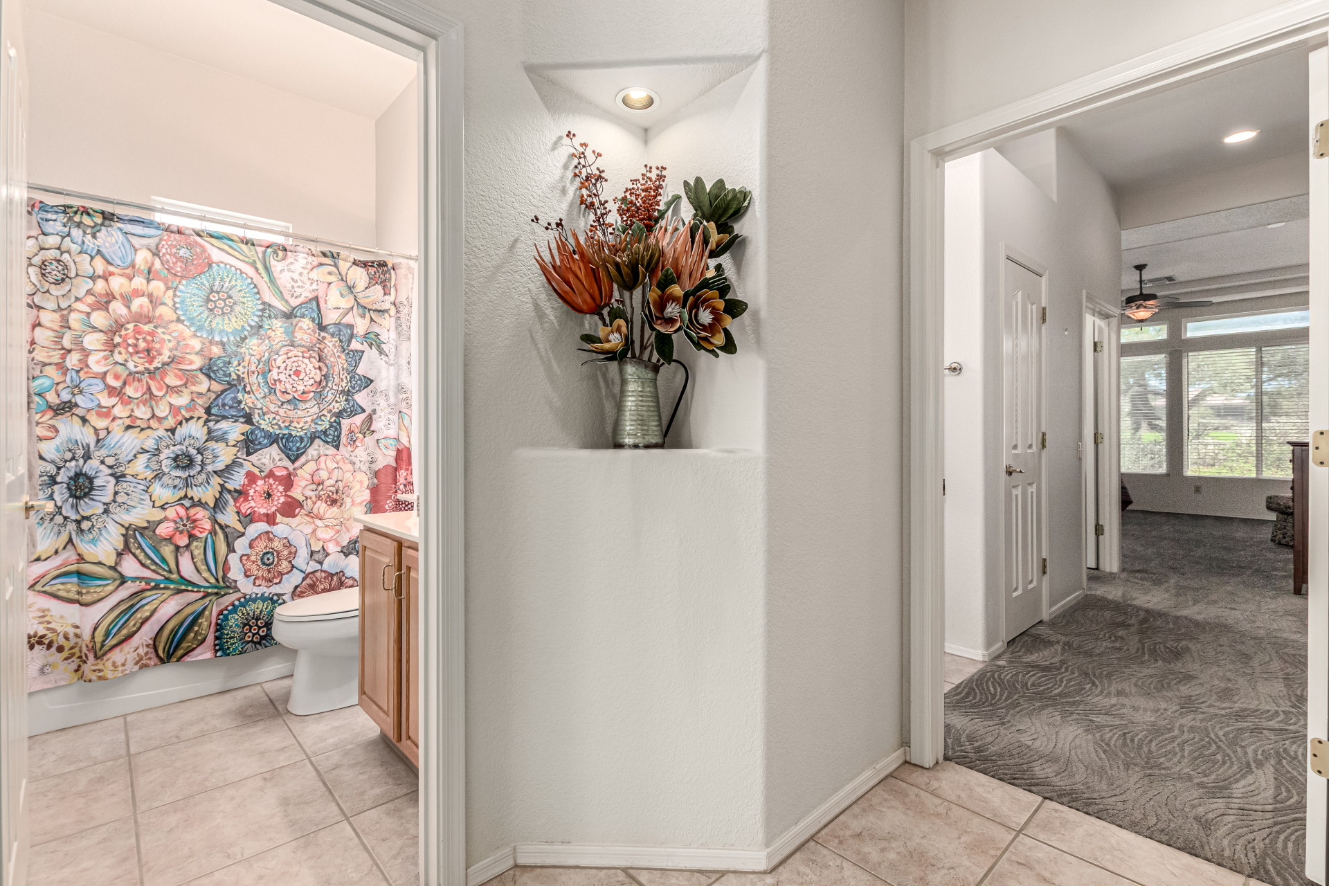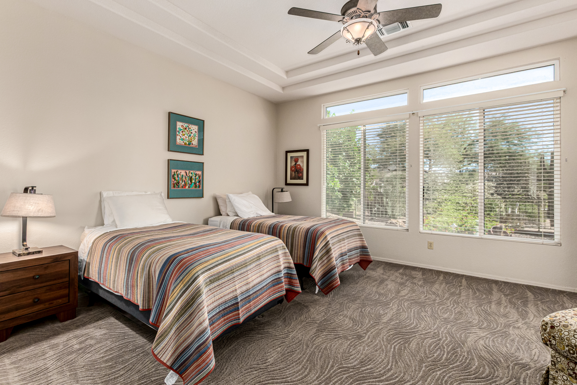 Located on the 3rd fairway with an East facing backyard, this updated home in The Highlands at Dove Mountain features a newer roof, HVAC, water heater and garage door. The fully fenced backyard offers sweeping mountain, golf course, and city light views, while the front courtyard captures magnificent sunsets. Outdoor living is enhanced with grapefruit and pomegranate trees and a built-in gas BBQ. Two bedrooms plus a den, a great room with a gas fireplace, and an updated kitchen with granite countertops, tile backsplash, pull-out cabinets, pantry drawers, and bay window. The oversized utility room includes washer and dryer, sink, storage, and desk space. An extra-large garage provides abundant storage and a golf cart space. Enjoy resort-style amenities- 24 hour security, golf, pickleball, tennis, pool/hot tub, fitness center, restaurant/bar, billiards, clubs, social activities and so much more! Hiking and biking trails a stones throw away from this sought-after active adult community!