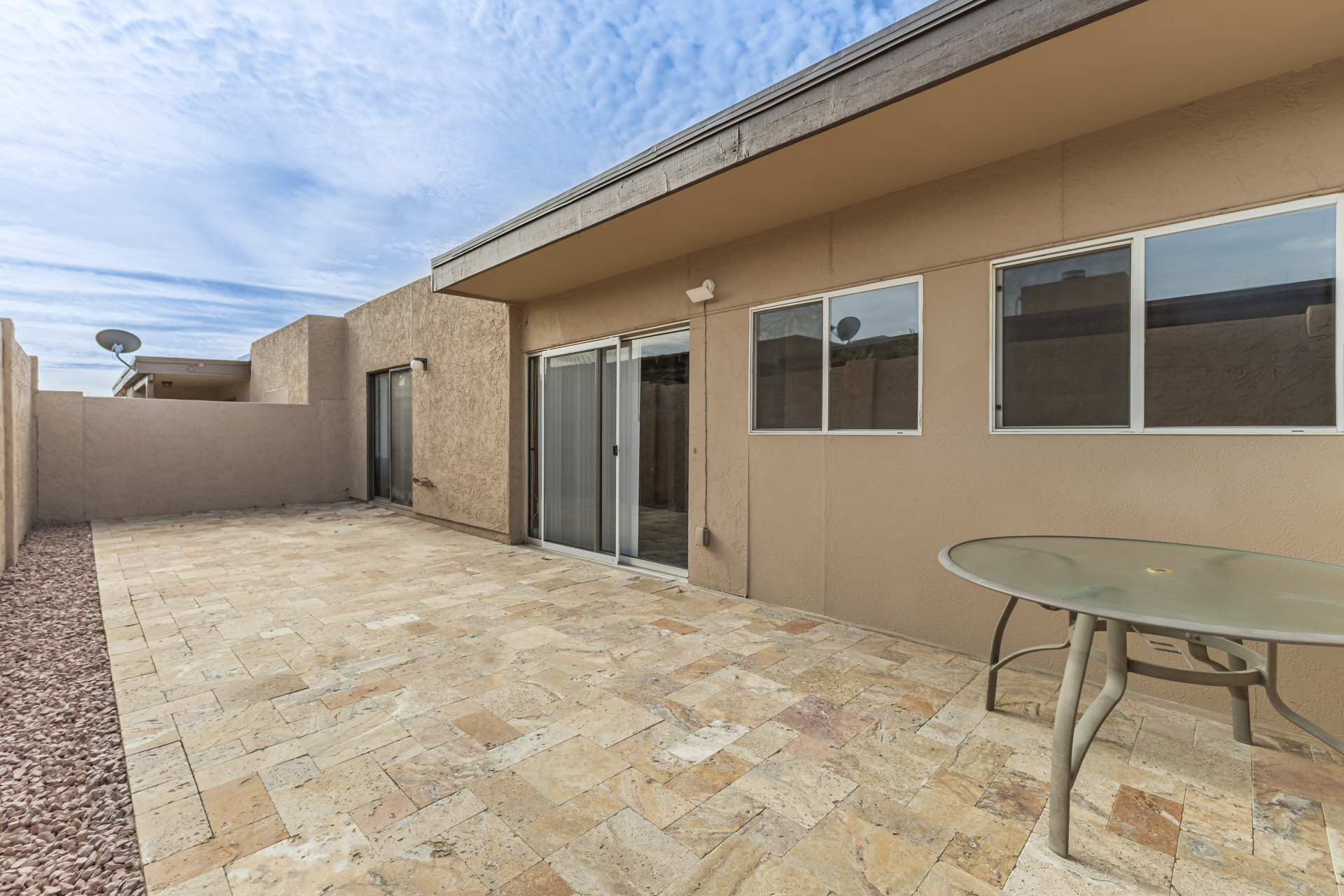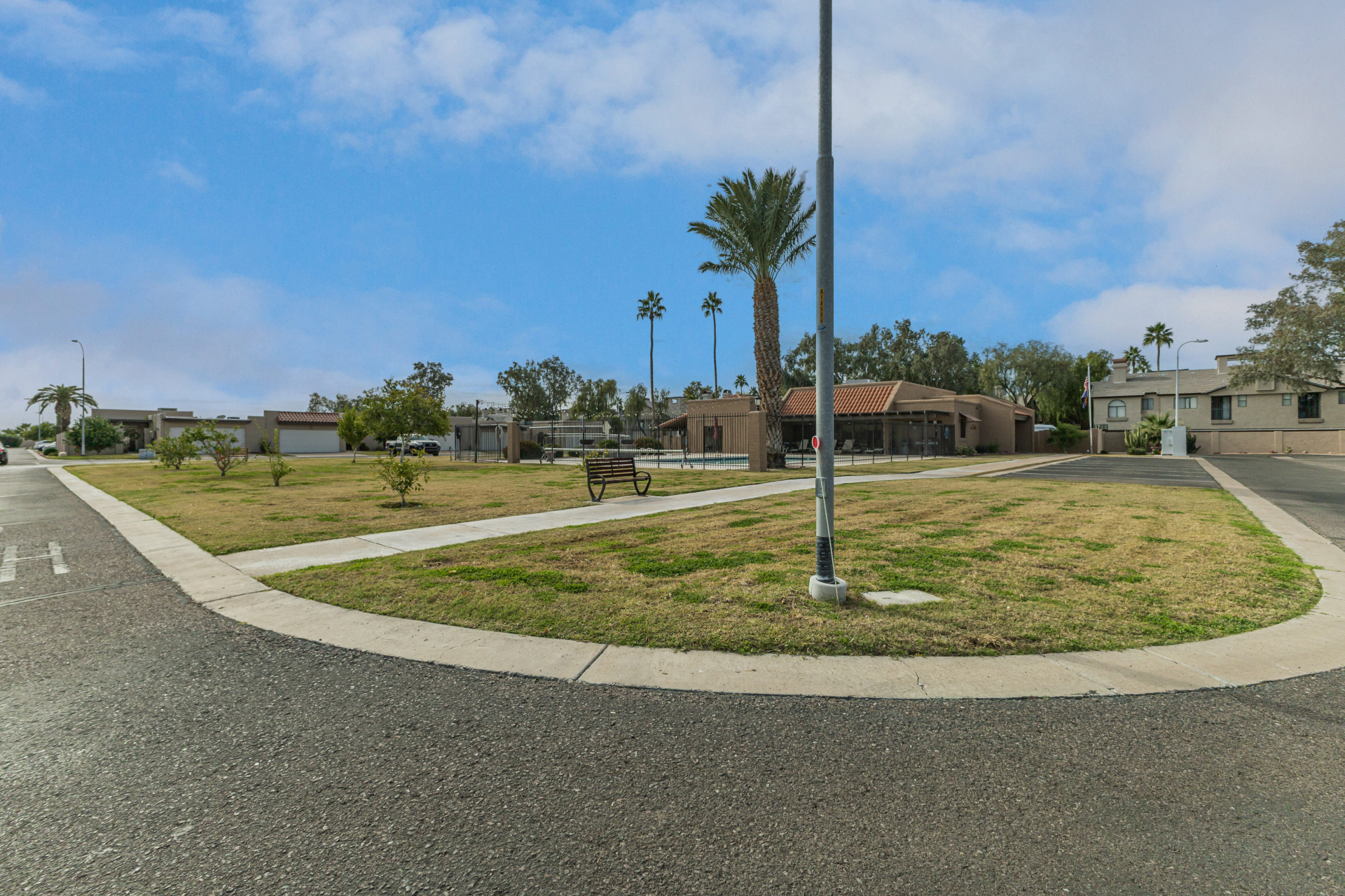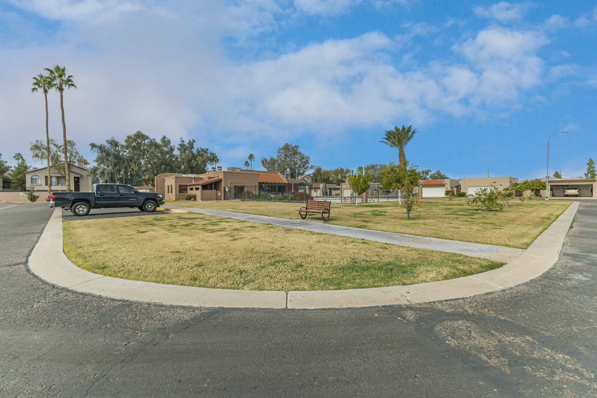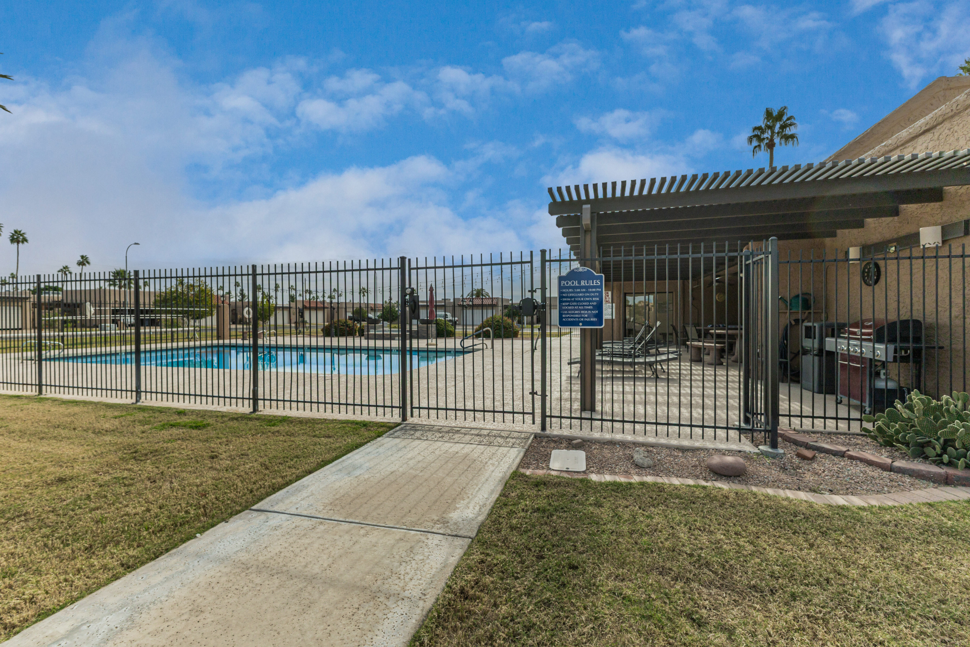 UPDATED! 55+.Community. 2 bedroom, 1.75 bathroom townhome style property. with no stairs. Home is move in ready. Fresh paint, new appliances and flooring. Home offers a front courtyard inside the gated entrance. Open floorplan with fireplace. The Arizona Room opens to large back patio. The attached 2 car garage is full sized with additional attached cabinets for storage. Community offers Pool, Spa & Clubhouse. Lots of green grass and mature trees.