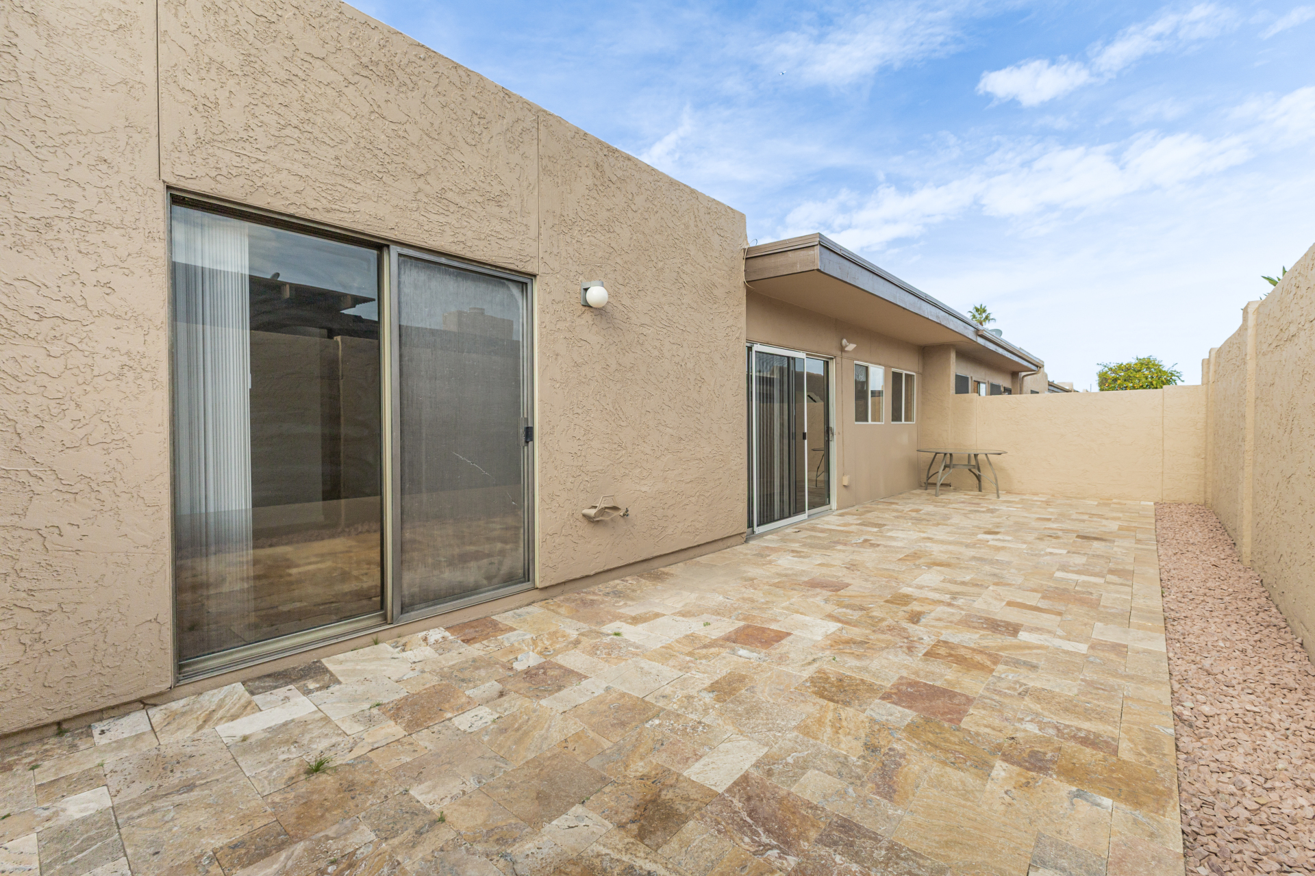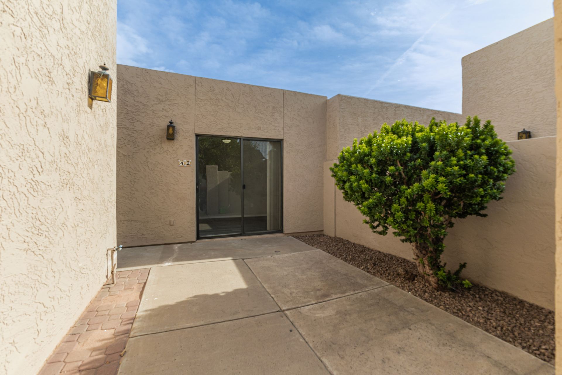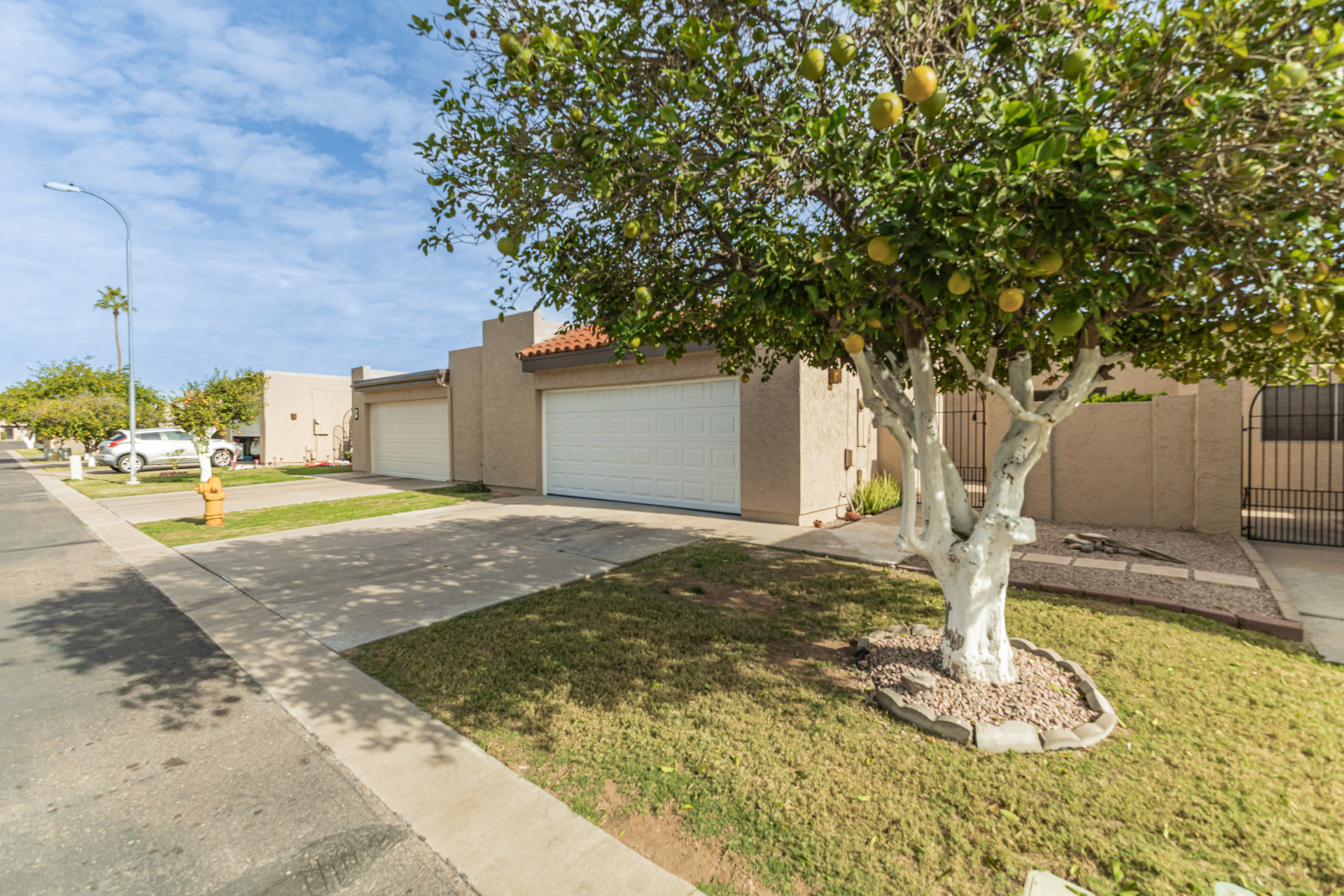UPDATED! 55+.Community. 2 bedroom, 1.75 bathroom townhome style property. with no stairs. Home is move in ready. Fresh paint, new appliances and flooring. Home offers a front courtyard inside the gated entrance. Open floorplan with fireplace. The Arizona Room opens to large back patio. The attached 2 car garage is full sized with additional attached cabinets for storage. Community offers Pool, Spa & Clubhouse. Lots of green grass and mature trees.