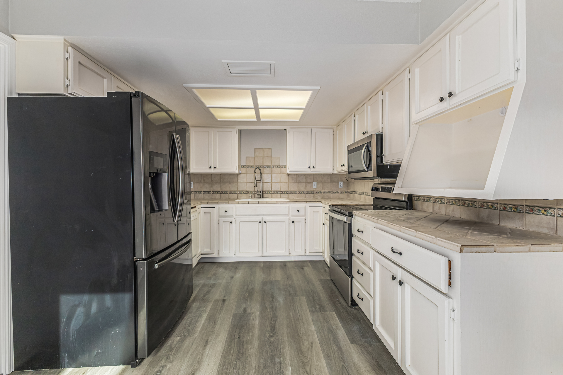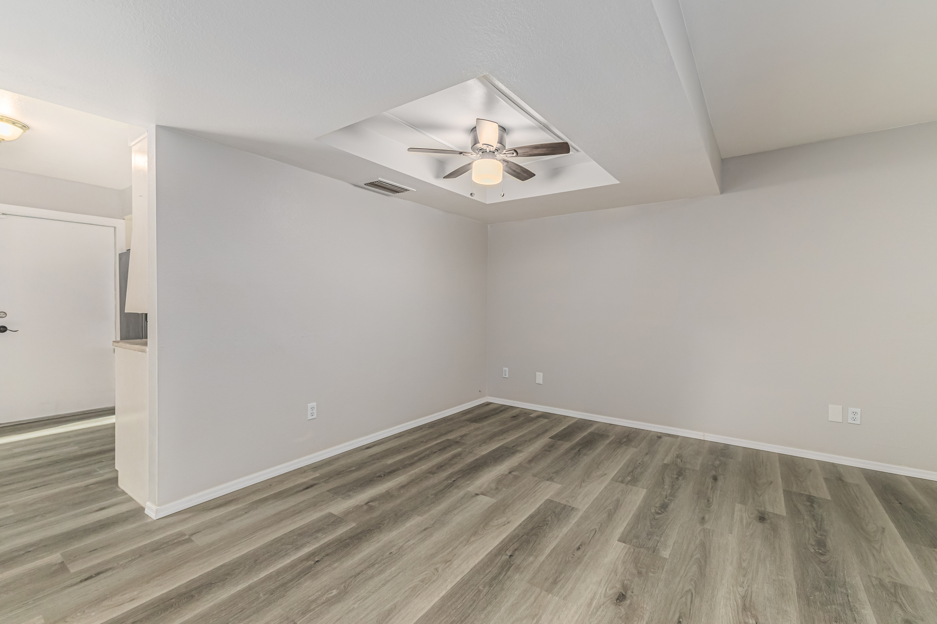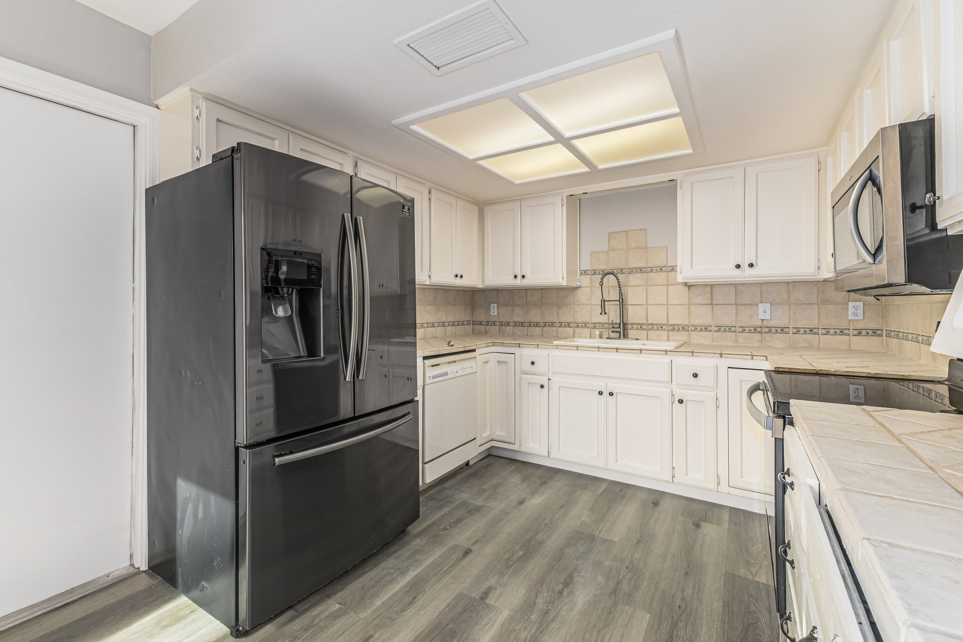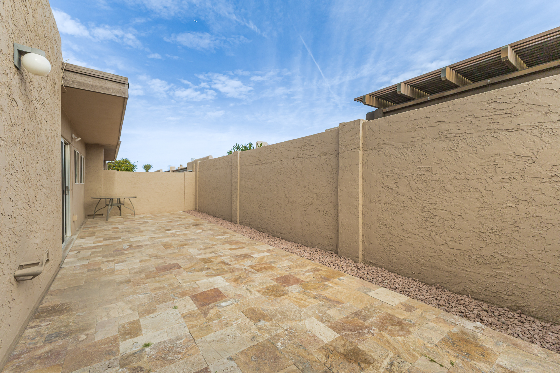 UPDATED! 55+.Community. 2 bedroom, 1.75 bathroom townhome style property. with no stairs. Home is move in ready. Fresh paint, new appliances and flooring. Home offers a front courtyard inside the gated entrance. Open floorplan with fireplace. The Arizona Room opens to large back patio. The attached 2 car garage is full sized with additional attached cabinets for storage. Community offers Pool, Spa & Clubhouse. Lots of green grass and mature trees.