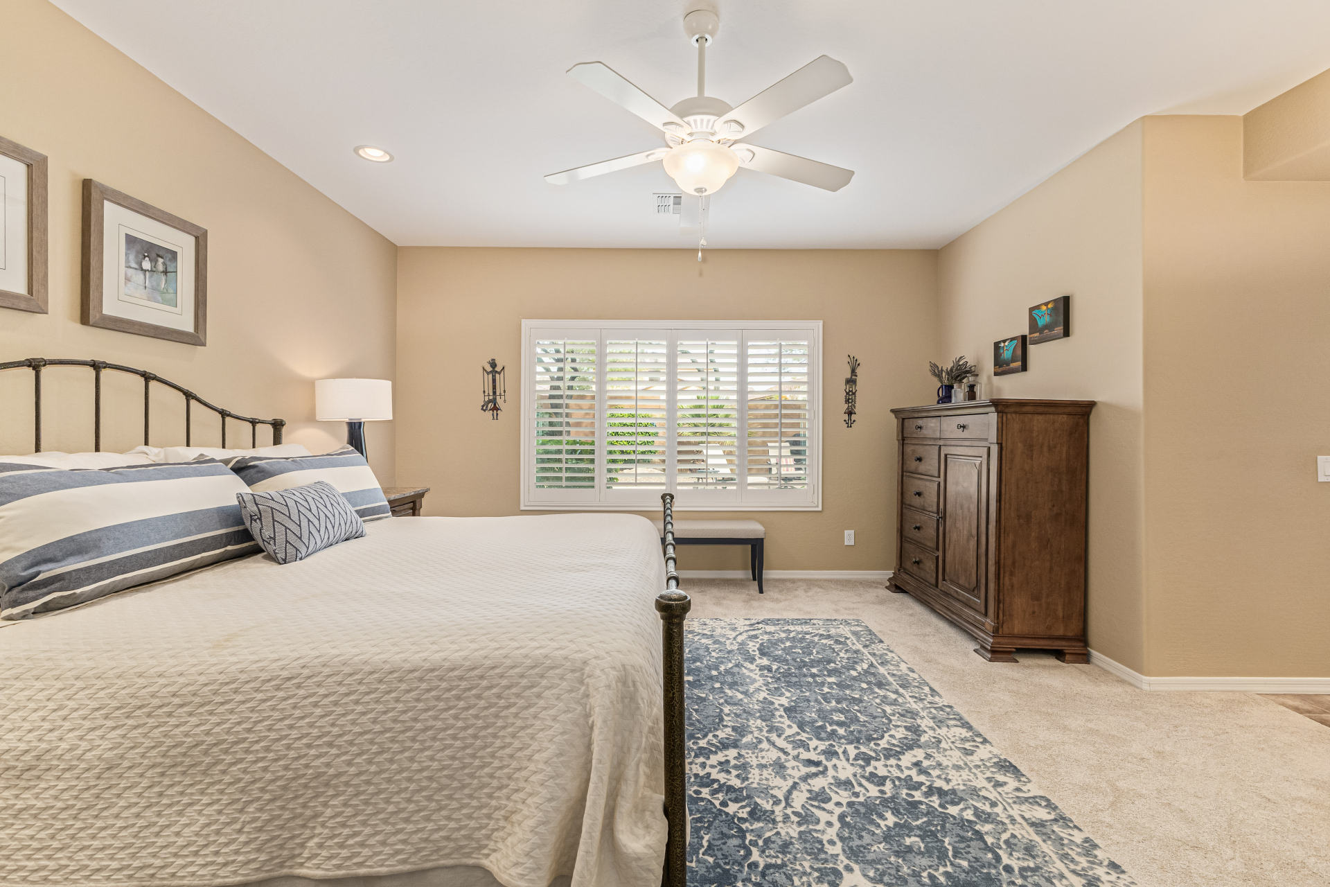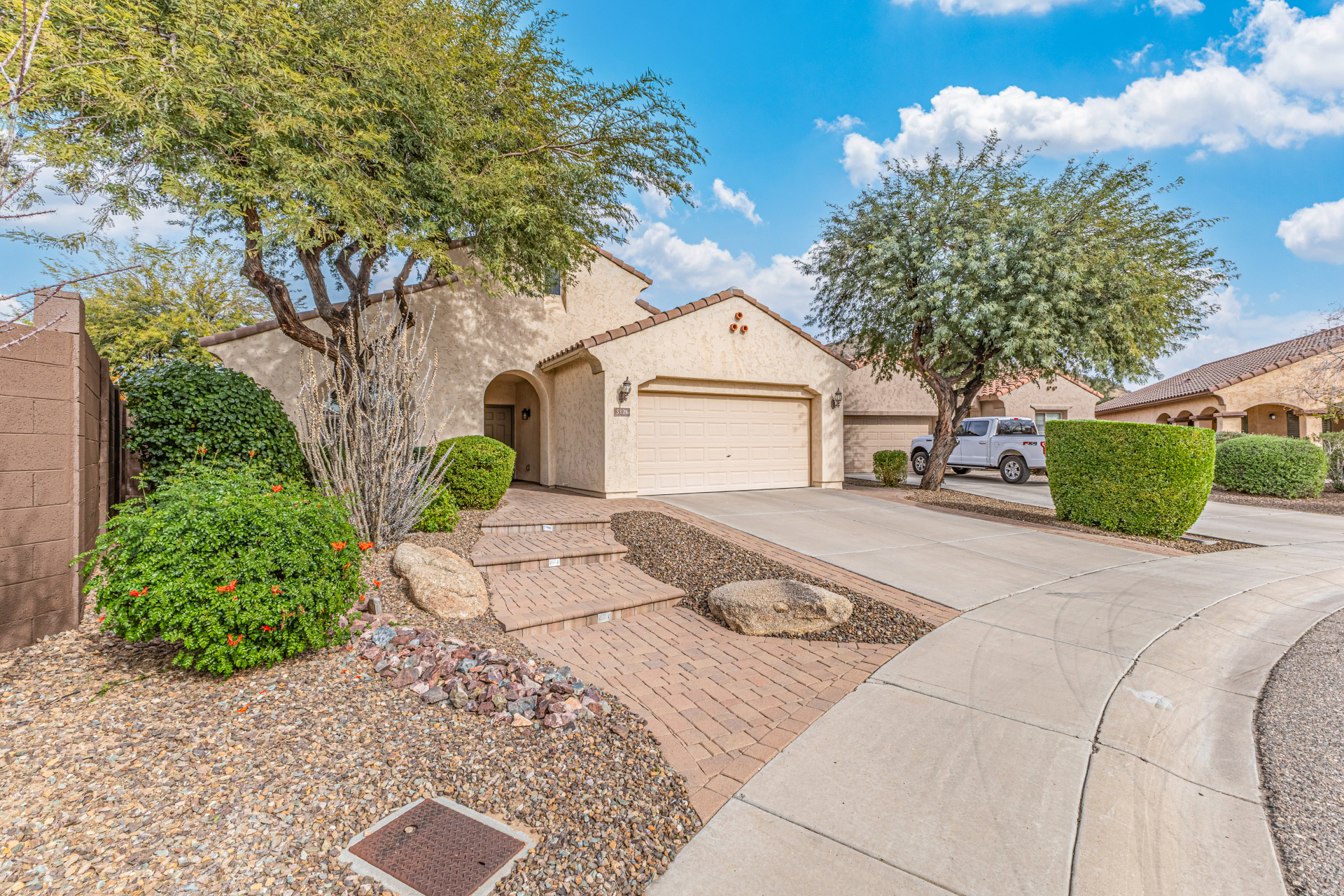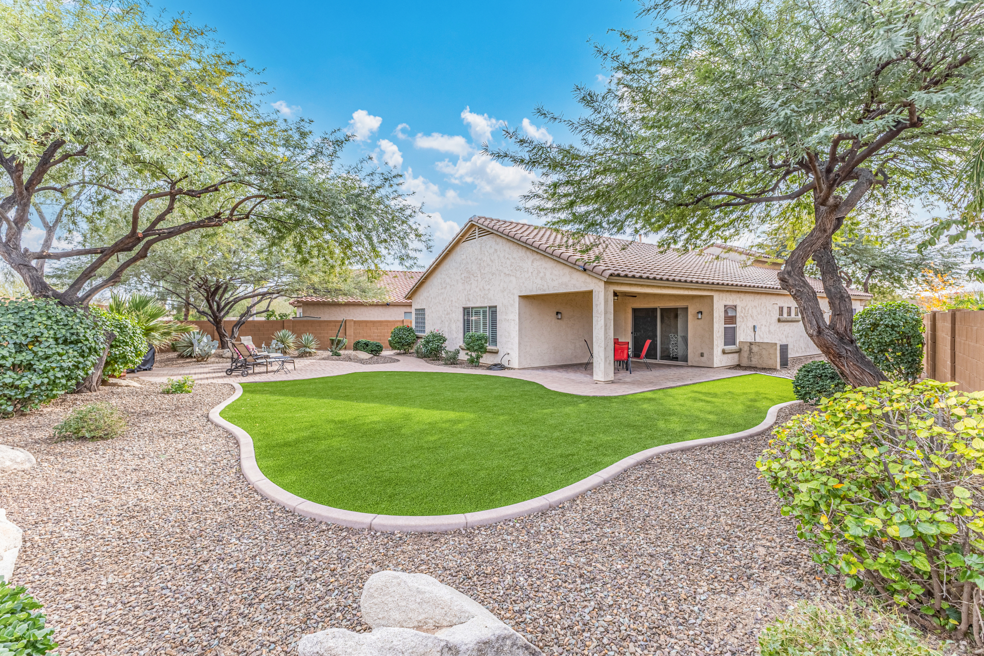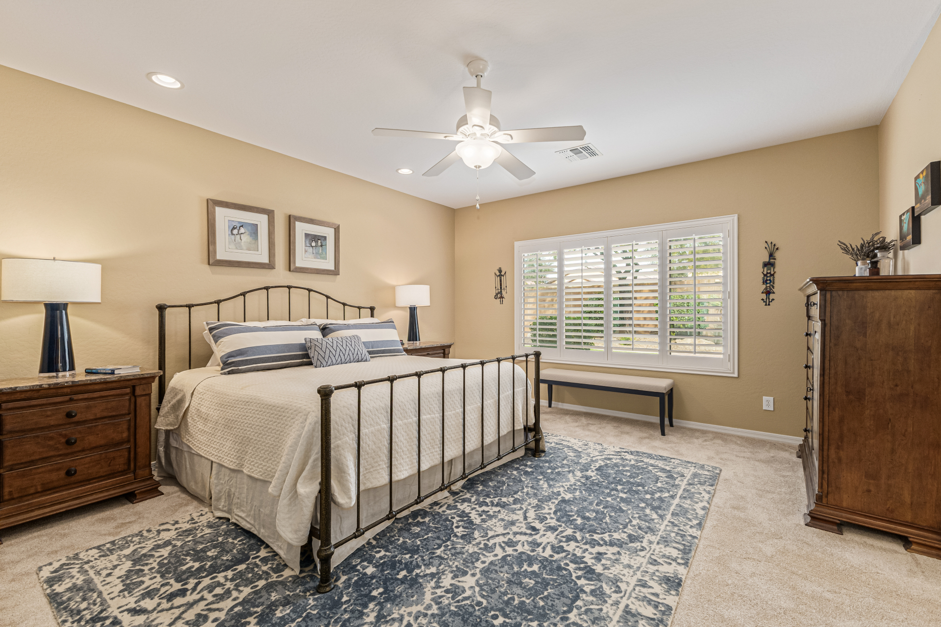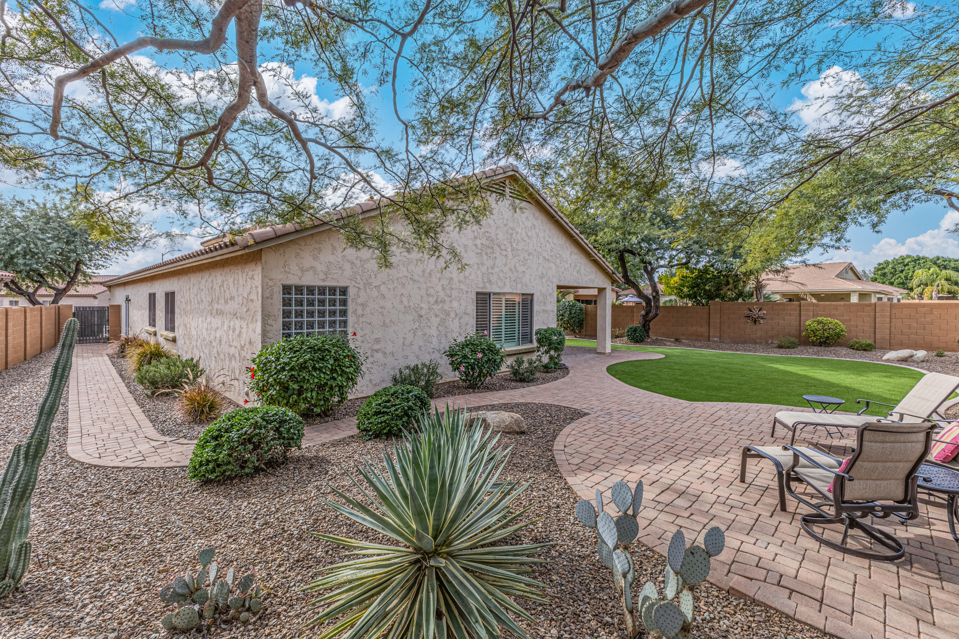 You'll love this beautiful home in Stetson Valley! Offering 3 beds, 2 baths, oversized 2-car garage, manicured mature landscape, and great curb appeal. The fabulous interior features tons of natural light, plantation shutters, neutral paint, and tile flooring w/carpet in bedrooms. The large living room is paired with sliding doors to the back! The eat-in kitchen boasts SS appliances, a pantry, quartz counters, recessed lighting, a center island, ample cabinetry w/crown molding, and a pass-through window w/breakfast bar. The double-door main bedroom has an ensuite with dual sinks, separate tub/shower, & a walk-in closet. Laundry room with cabinetry. Tranquility awaits in the spacious backyard! A covered patio, well-laid pavers, artificial turf, & shade trees complete the picture. Just WOW!