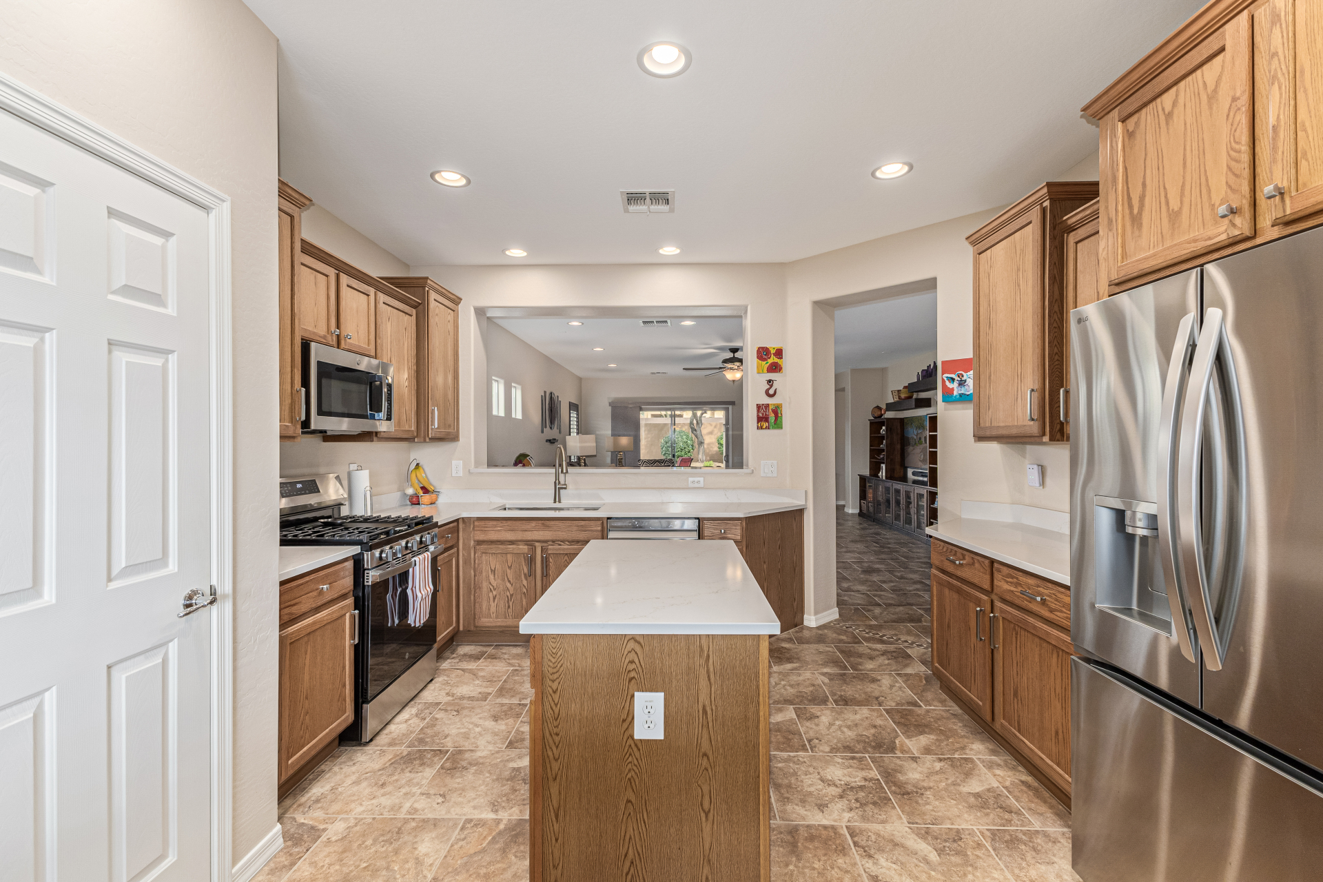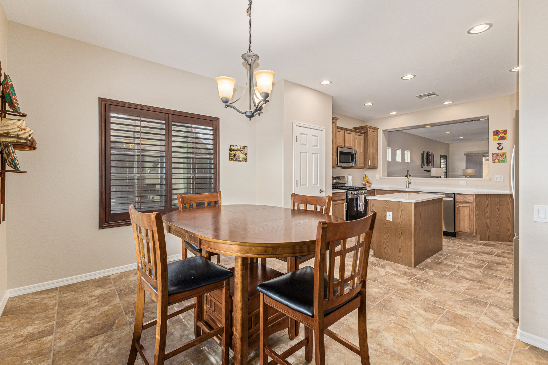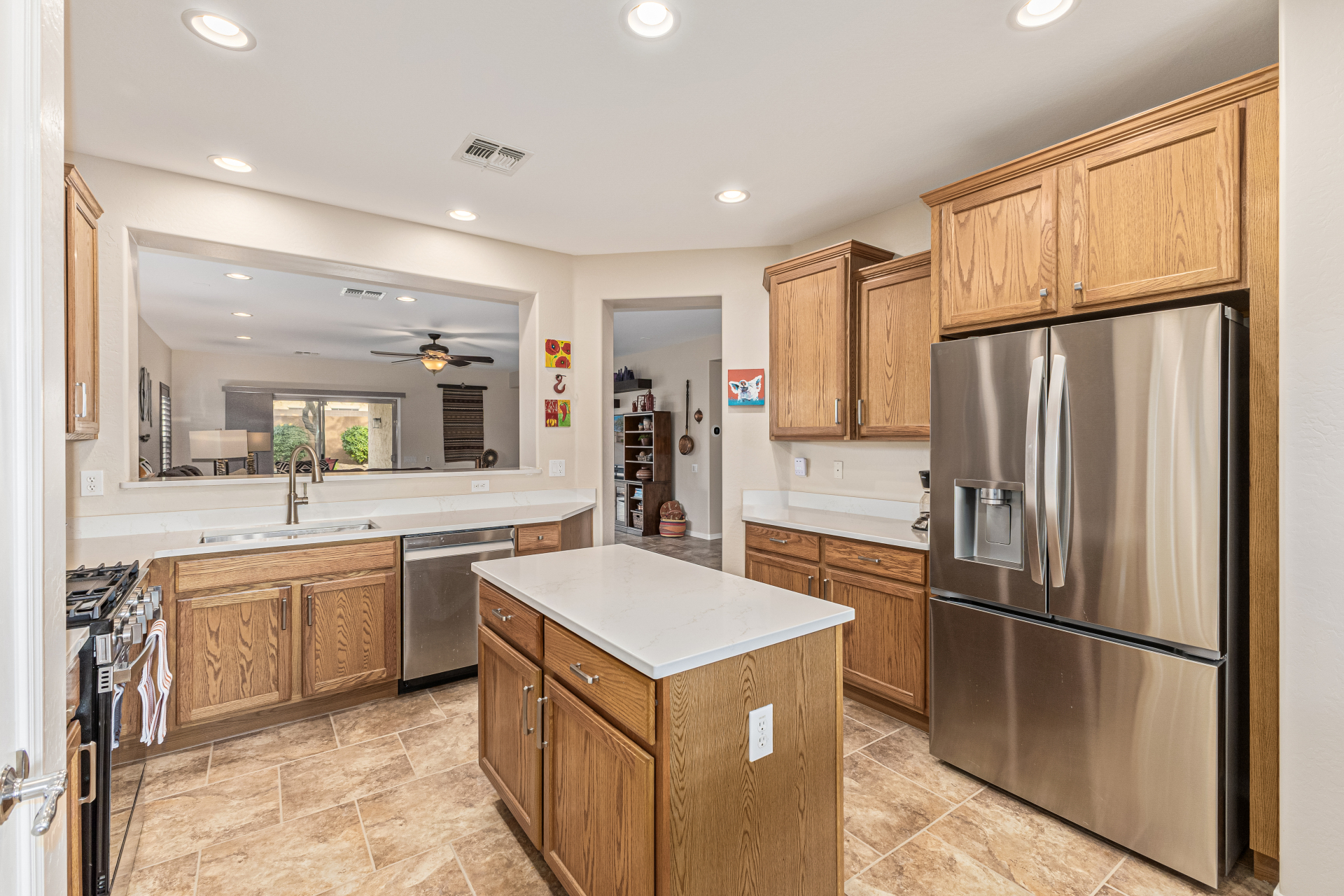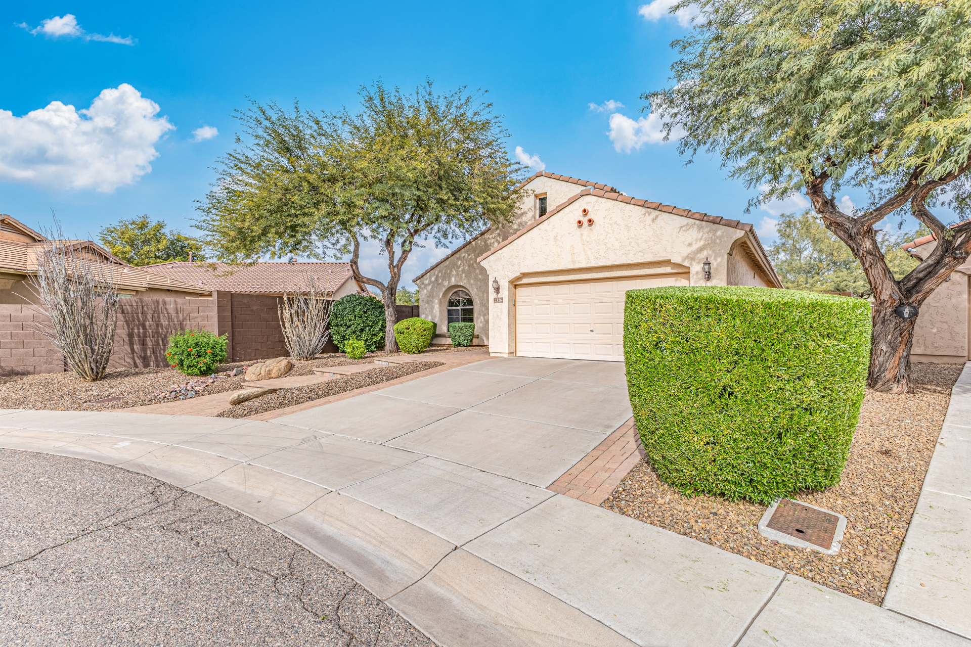 You'll love this beautiful home in Stetson Valley! Offering 3 beds, 2 baths, oversized 2-car garage, manicured mature landscape, and great curb appeal. The fabulous interior features tons of natural light, plantation shutters, neutral paint, and tile flooring w/carpet in bedrooms. The large living room is paired with sliding doors to the back! The eat-in kitchen boasts SS appliances, a pantry, quartz counters, recessed lighting, a center island, ample cabinetry w/crown molding, and a pass-through window w/breakfast bar. The double-door main bedroom has an ensuite with dual sinks, separate tub/shower, & a walk-in closet. Laundry room with cabinetry. Tranquility awaits in the spacious backyard! A covered patio, well-laid pavers, artificial turf, & shade trees complete the picture. Just WOW!