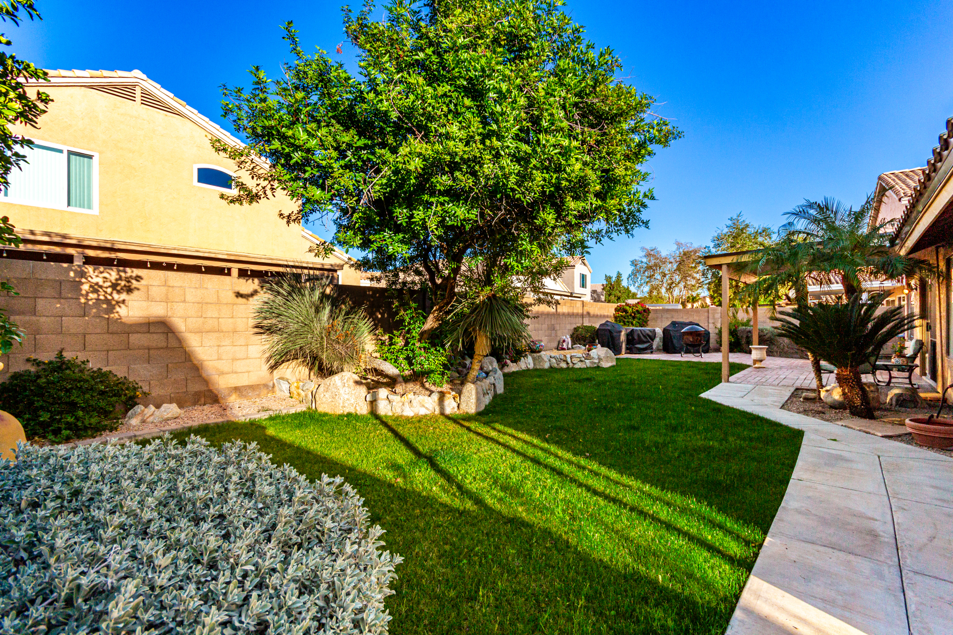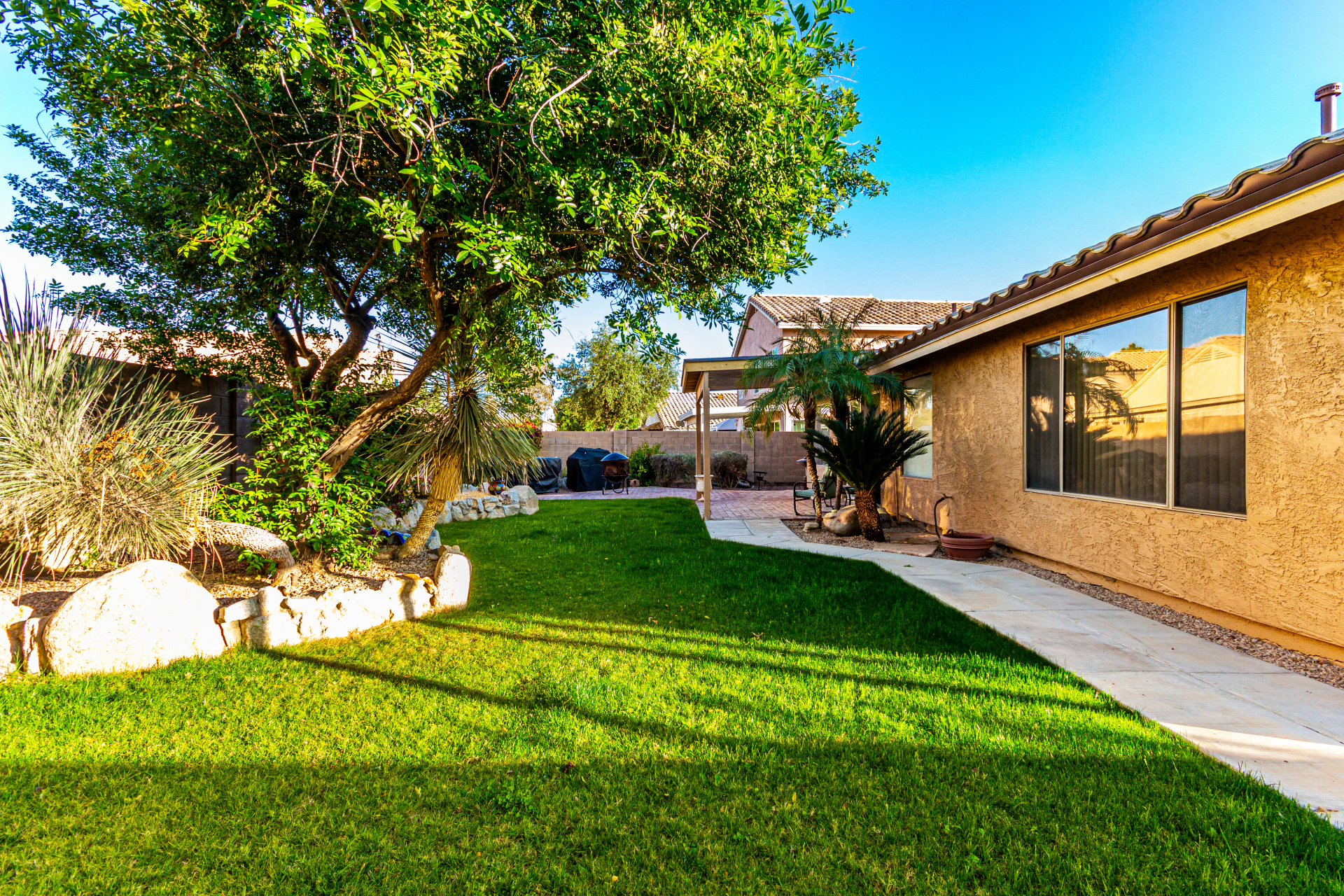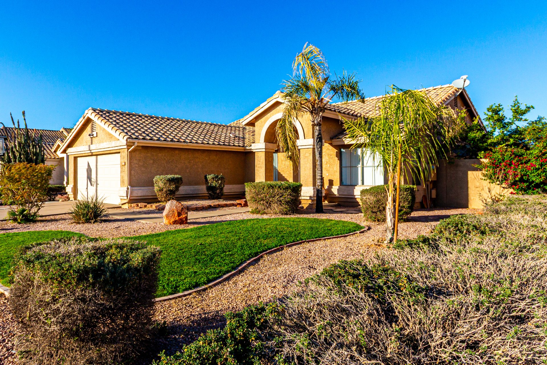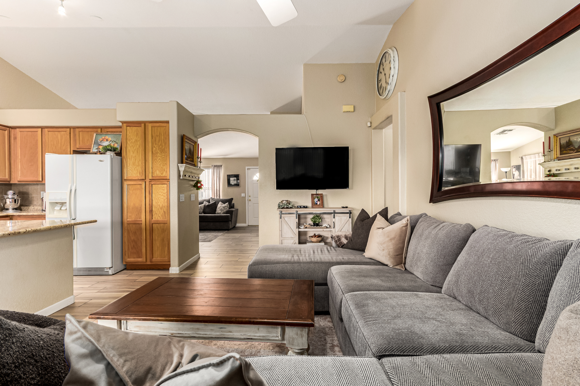 Charming single-level home with a great location close to schools, freeways, and golfing! The manicured landscape & 2-car garage are just the beginning. Inside, you'll find vaulted ceilings, wood-look flooring, plenty of natural light, and earthy colors, all set in an inviting open layout perfect for entertaining & relaxation. The pristine kitchen is equipped with track lights, oak cabinetry, tile backsplash, granite countertops, built-in appliances, and an island with a breakfast bar, ideal for casual meals. The serene main bedroom promises a good night's sleep and boasts a practical walk-in closet and a bathroom with dual sinks. Enjoy outdoor living in the backyard, including a covered patio, well-laid pavers, and a grass area perfect for games. Hurry up, this gem won't last!