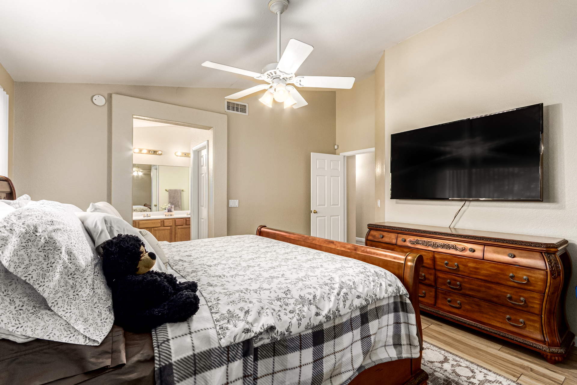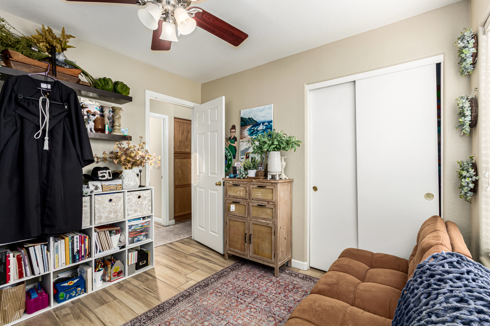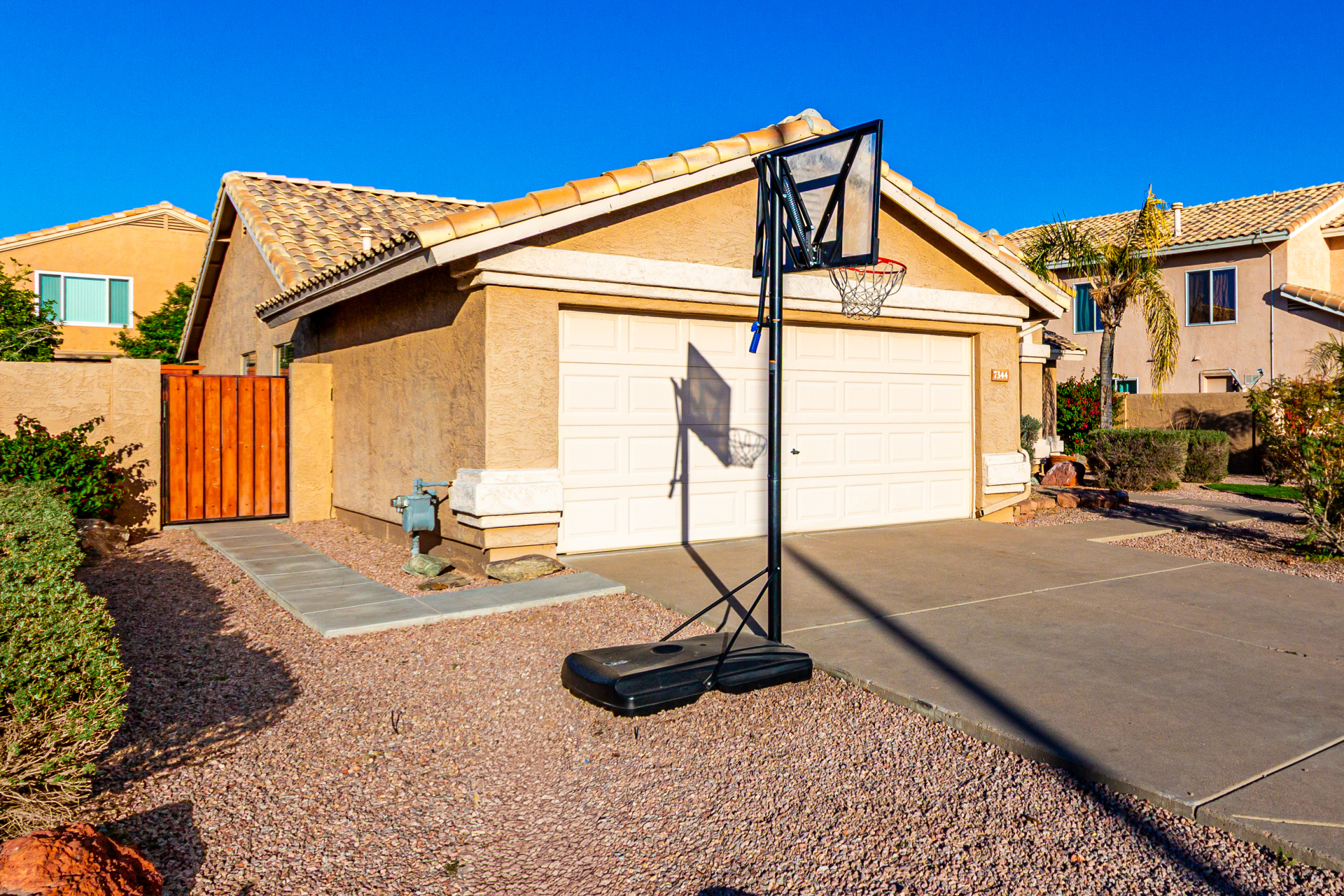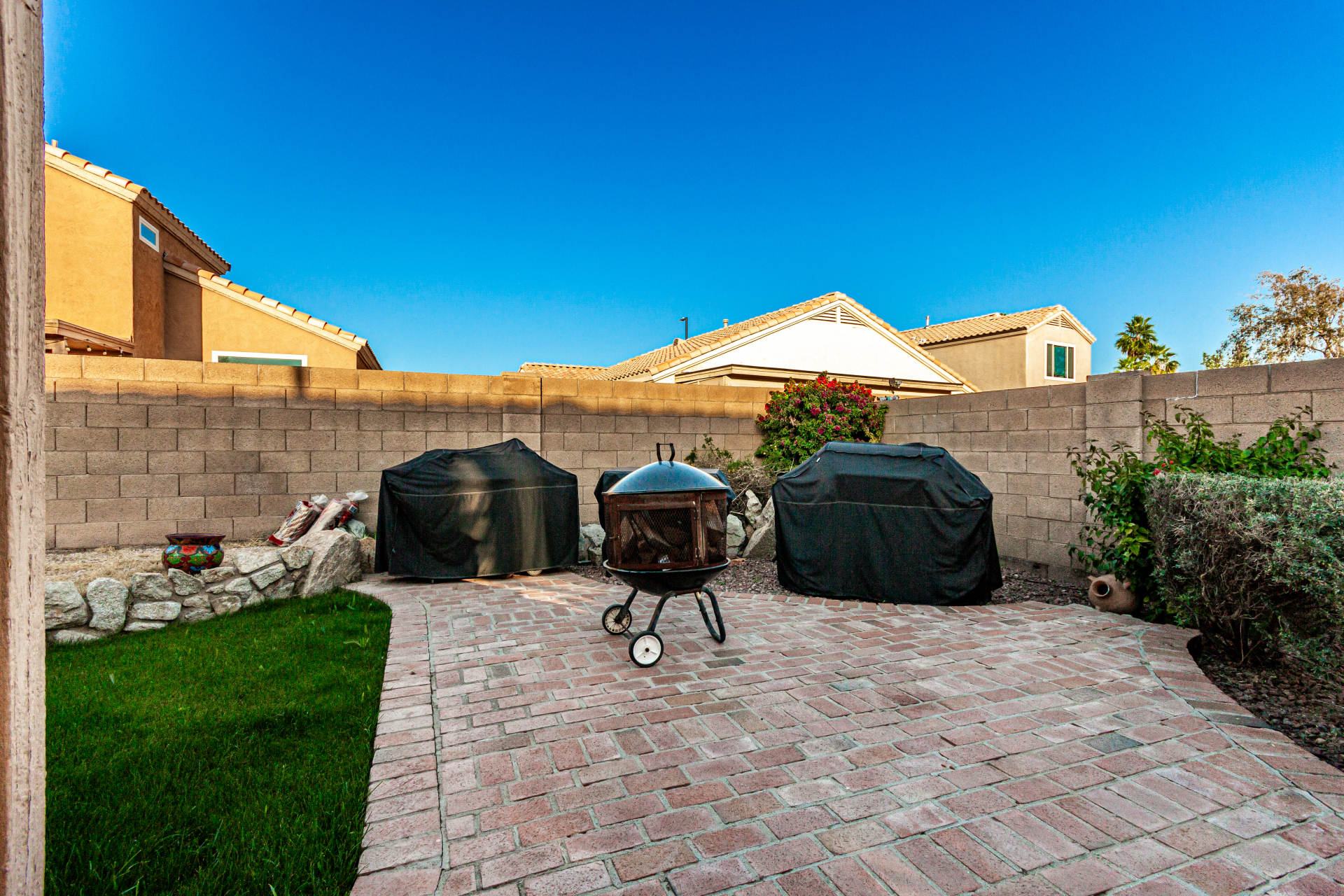 Charming single-level home with a great location close to schools, freeways, and golfing! The manicured landscape & 2-car garage are just the beginning. Inside, you'll find vaulted ceilings, wood-look flooring, plenty of natural light, and earthy colors, all set in an inviting open layout perfect for entertaining & relaxation. The pristine kitchen is equipped with track lights, oak cabinetry, tile backsplash, granite countertops, built-in appliances, and an island with a breakfast bar, ideal for casual meals. The serene main bedroom promises a good night's sleep and boasts a practical walk-in closet and a bathroom with dual sinks. Enjoy outdoor living in the backyard, including a covered patio, well-laid pavers, and a grass area perfect for games. Hurry up, this gem won't last!