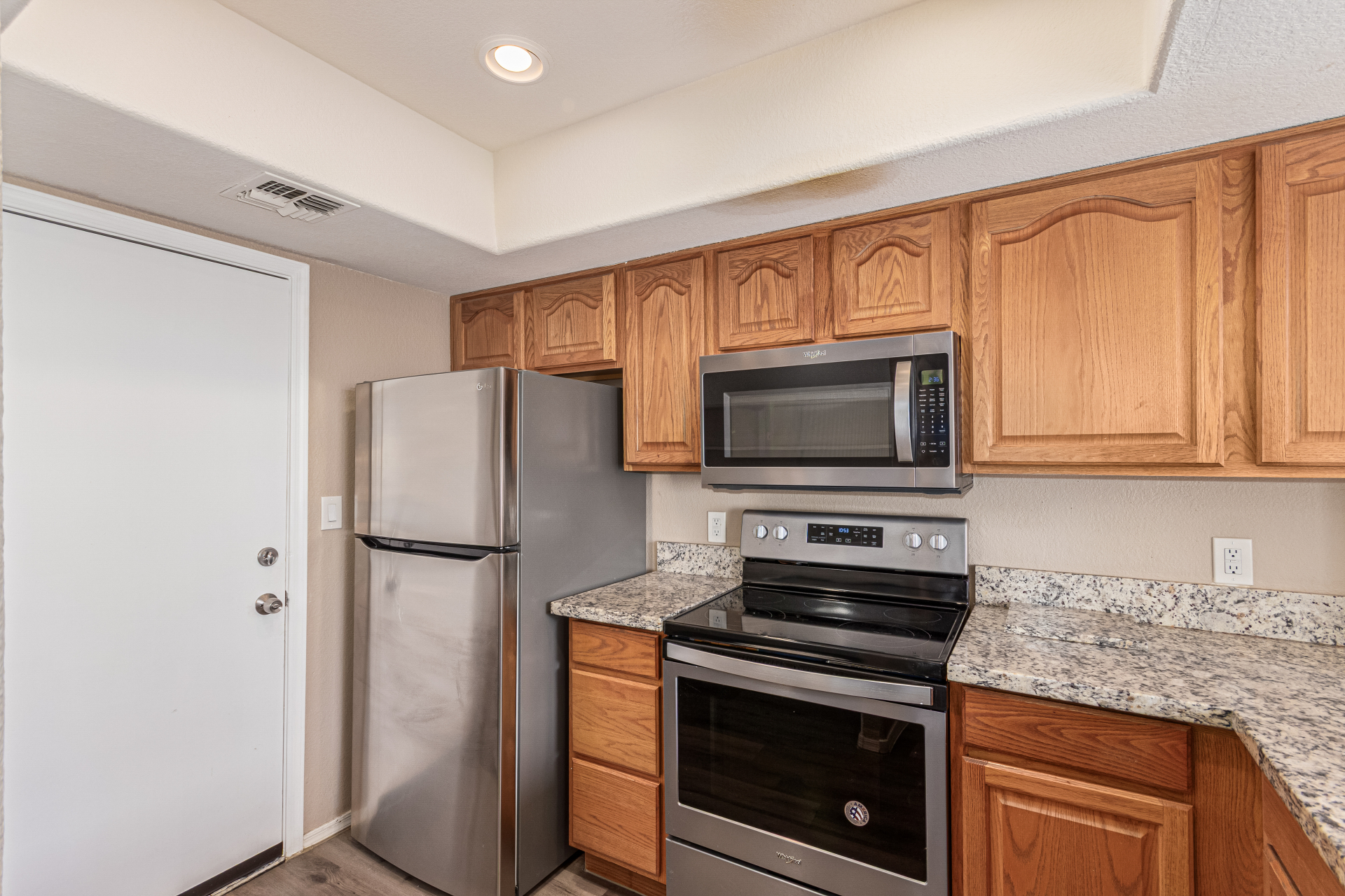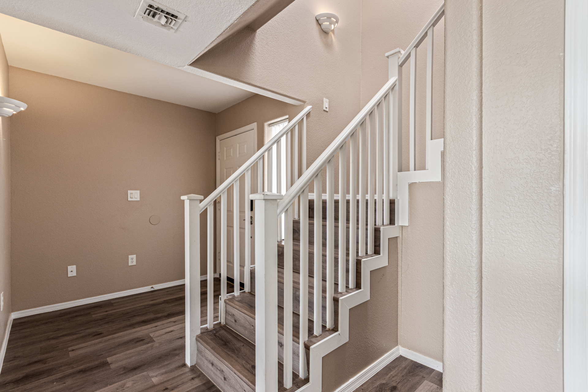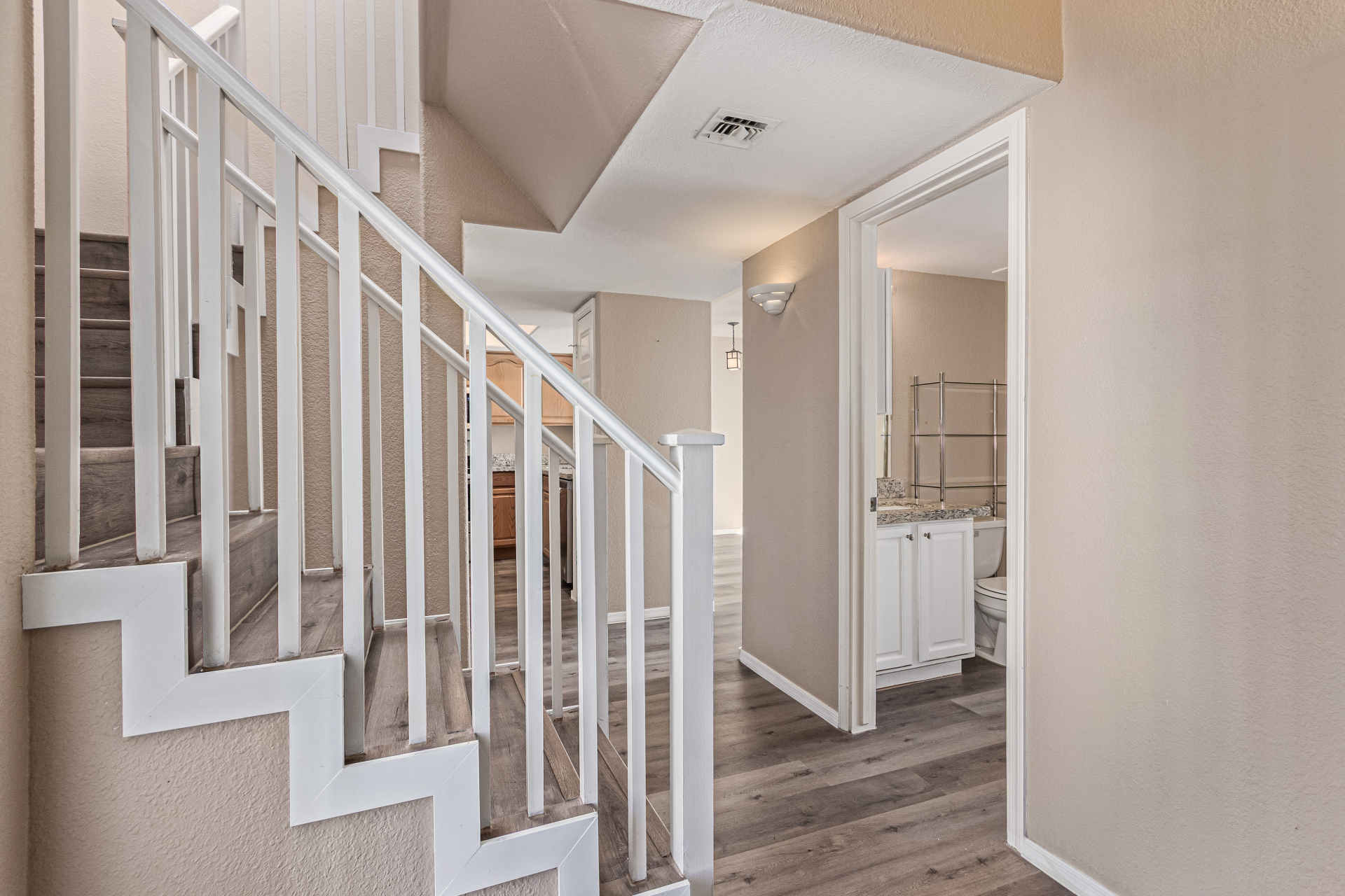 Beautifully maintained end-unit townhouse! Desirable two-level layout & attached 2-car garage w/laundry area. Immaculate interior welcomes you with a charming foyer, wood-look floors, & soothing paint throughout. The living room feels open & inviting with its high ceiling, cozy fireplace, & direct backyard access. Adjacent to the living space, the dining area is accented by stylish pendant lighting! The kitchen features maple cabinets, SS appliances, granite counters, a pantry, & a pass-through window. Upstairs, the main bedroom has a walk-in closet & an ensuite w/dual sinks. A secondary bedroom offers balcony access! Downstairs, another bedroom provides backyard access, a spacious closet, & direct bathroom access. Enjoy a perfectly sized back for relaxing evenings! Must see!