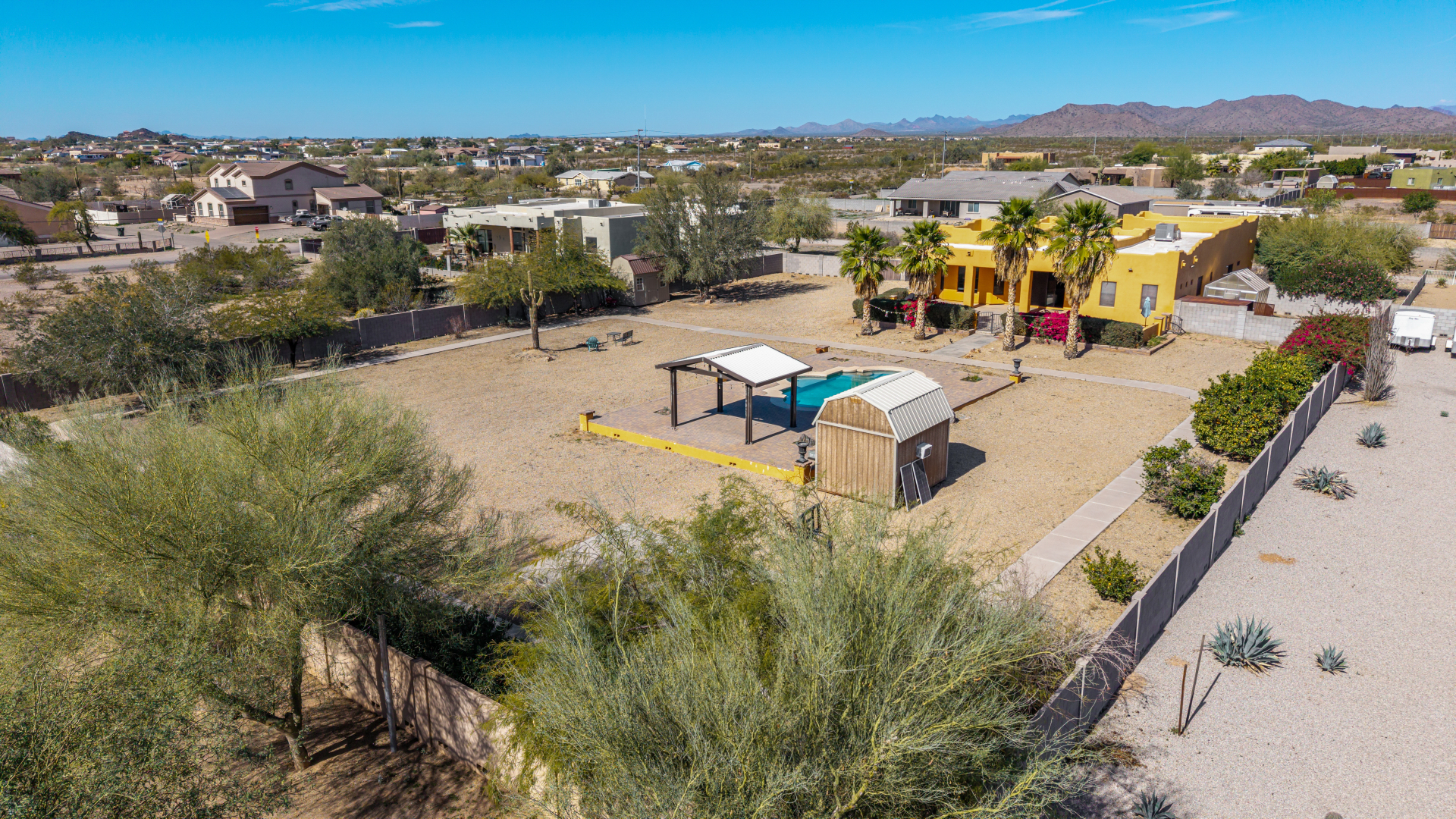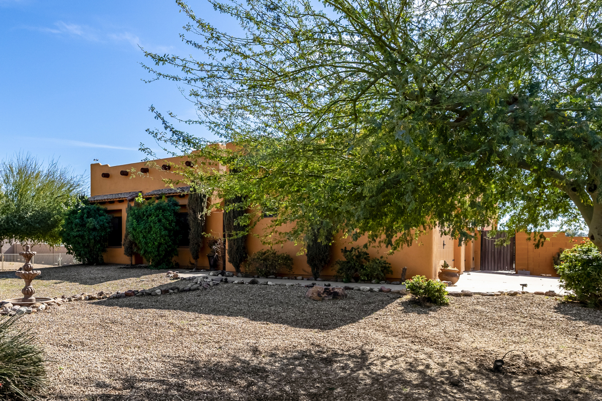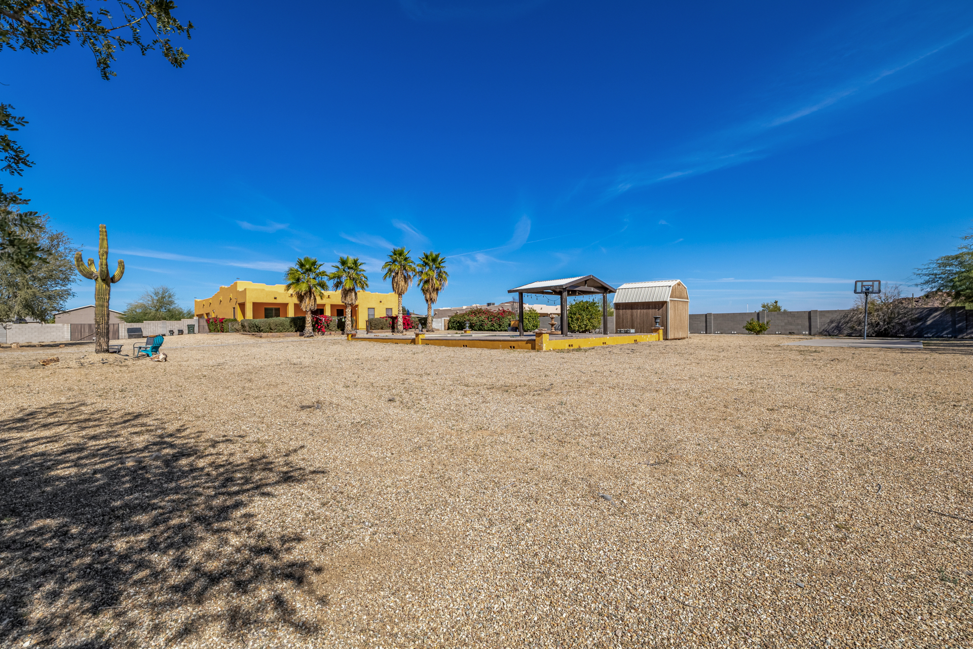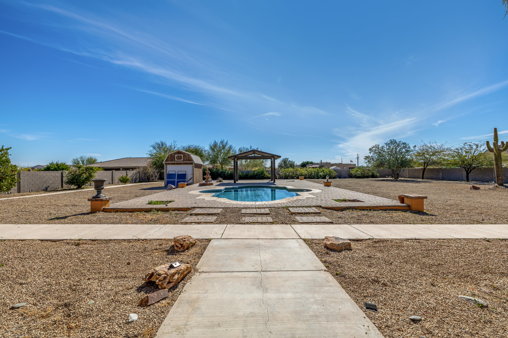 Don’t miss out on this horse property on a sprawling 1.1-acre lot with room to roam and dream! This impressive home welcomes you with a 3-car garage, RV gate, and a charming courtyard. Inside, enjoy tile floors, a soothing neutral palette, pre-wired surround sound, and a spacious living room made for entertaining. The generous kitchen shines with stainless steel appliances, granite countertops, abundant wood cabinetry, a pantry, mosaic tile backsplash, and a center island with a breakfast bar. The main bedroom is a true retreat with direct backyard access, a private bath featuring dual vanities, a soaking tub, and a walk-in closet. The garage includes attached cabinets for added storage. Out back, relax or play in the covered patio, sparkling pool, gazebo, greenhouse, shed, and even a basketball hoop plus plenty of open space to unwind or get creative. So much to love, all in one incredible property! Act now!