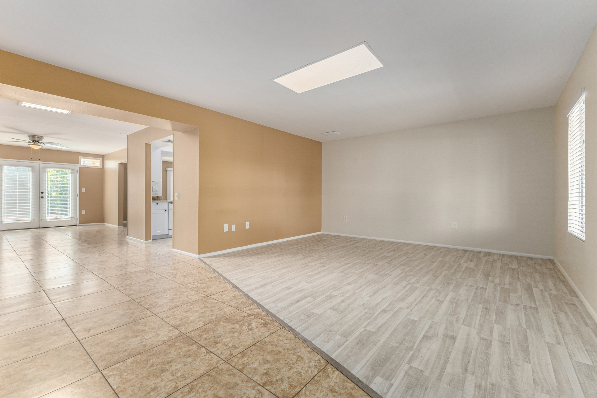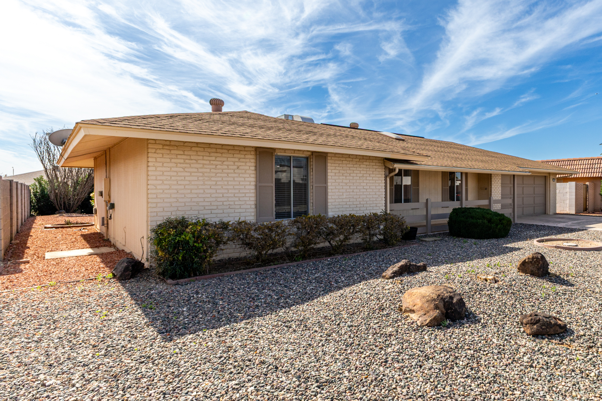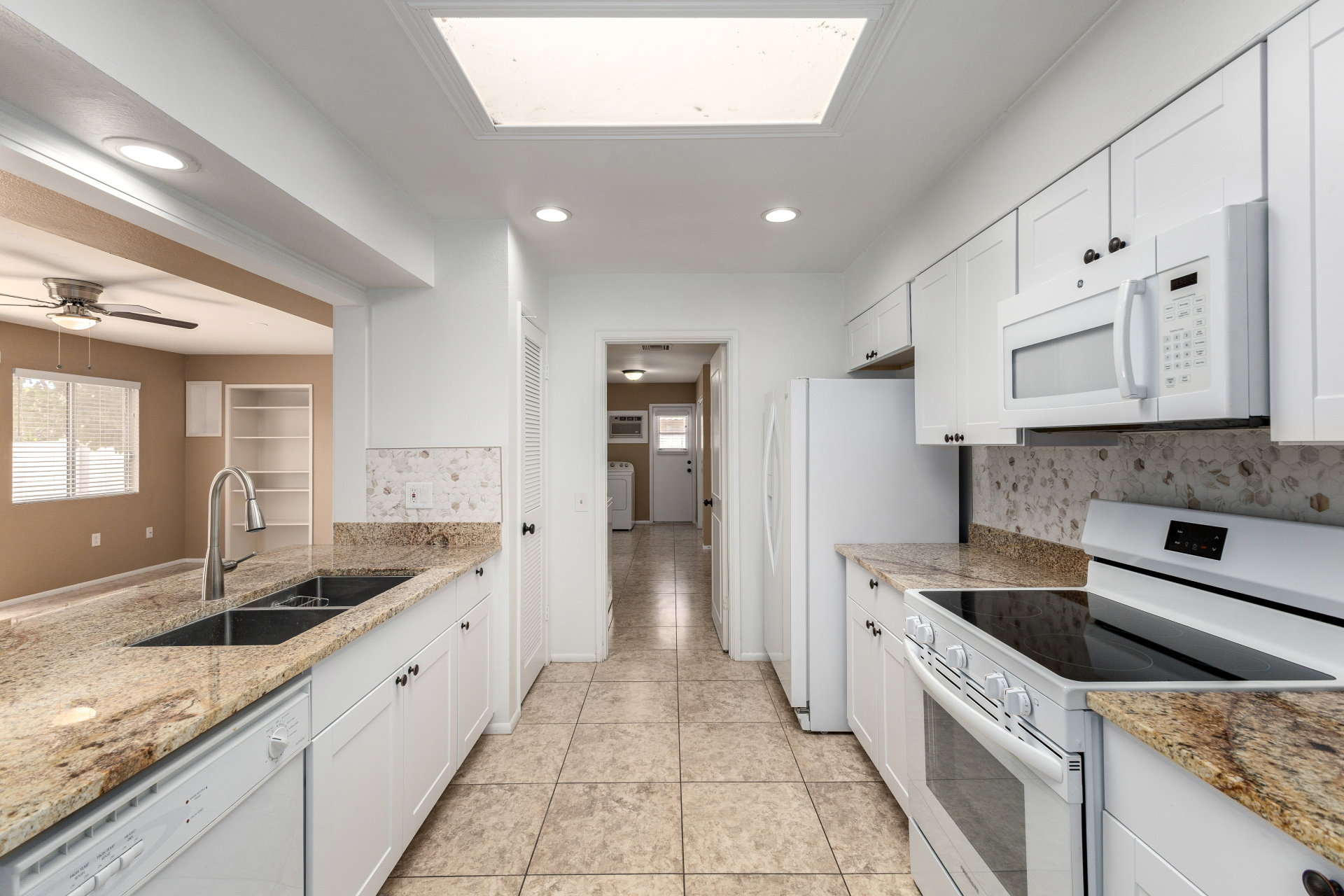 Home, sweet home! This charming residence features a 2-car garage & a low-maintenance desert landscape. Inside, you'll find a serene living room w/ a warm palette, skylights for abundant natural light, blinds, & stylish wood-look flooring. Spend relaxing evenings w/ loved ones in the spacious family room, complete w/ sliding door access to the backyard. The well-appointed kitchen comes w/ granite counters, crisp white shaker cabinets, recessed lighting, a striking tile backsplash, essential built-in appliances, a pantry, & a practical pass-through w/ a breakfast bar. The bright main bedroom includes a private bathroom for added comfort. You'll also find a versatile bonus room ideal for an office. The lovely backyard offers a covered patio & fragrant citrus trees. Make this gem yours!